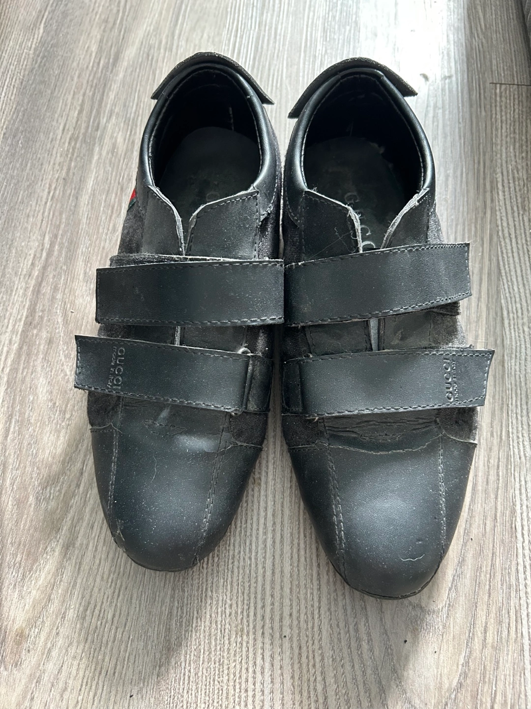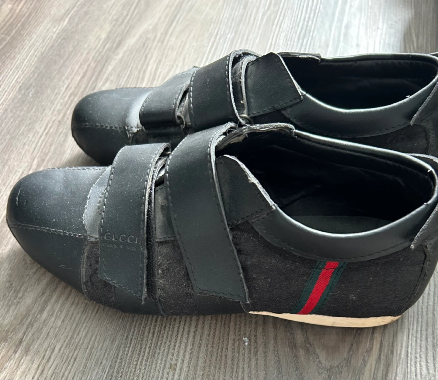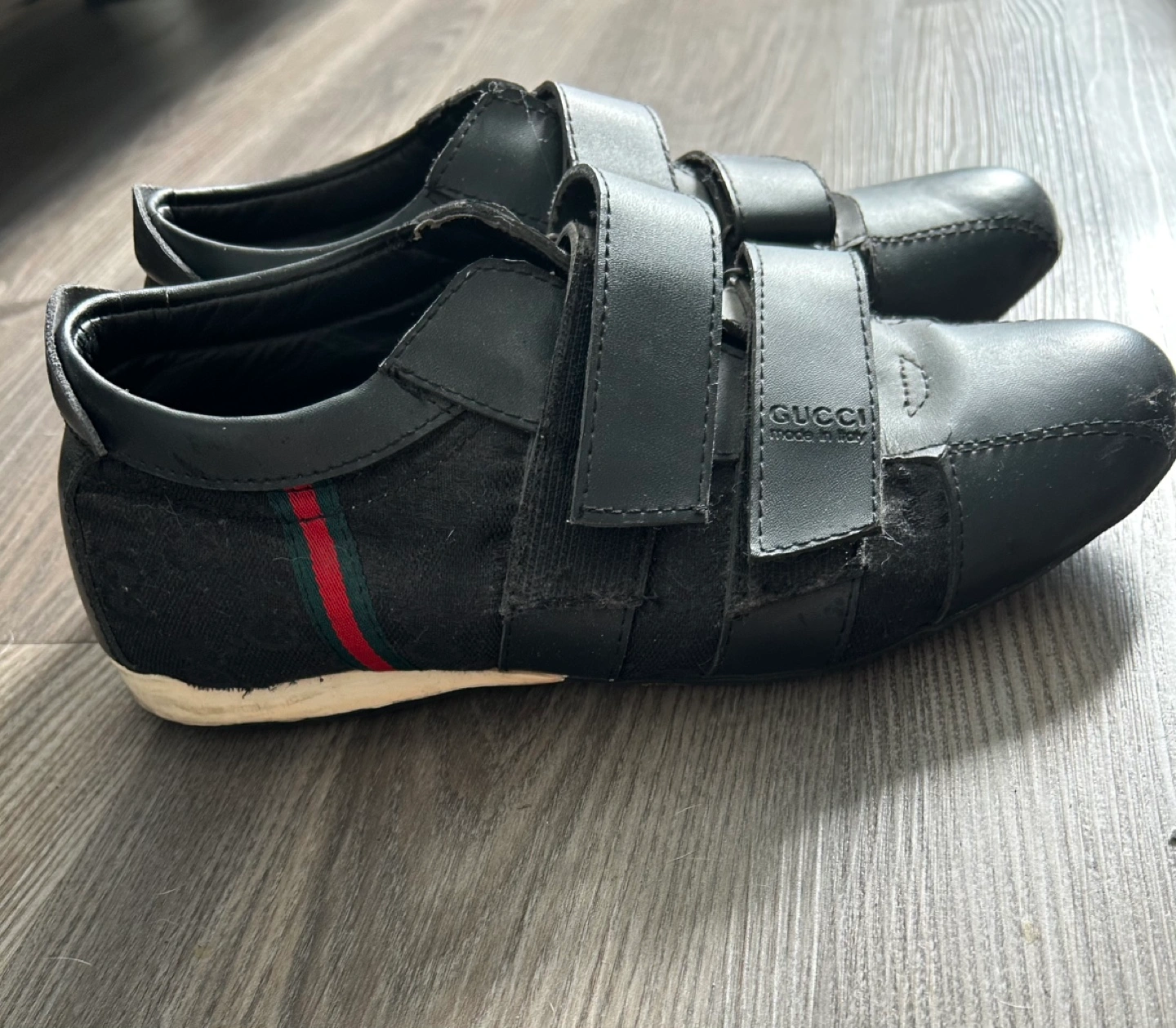 Pre-owned Gucci shoes. Black leather and fabric upper. Velcro straps. Minor wear.