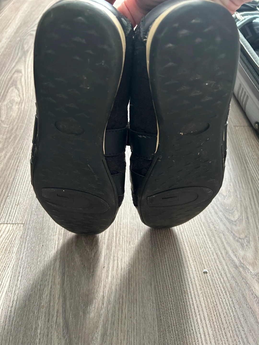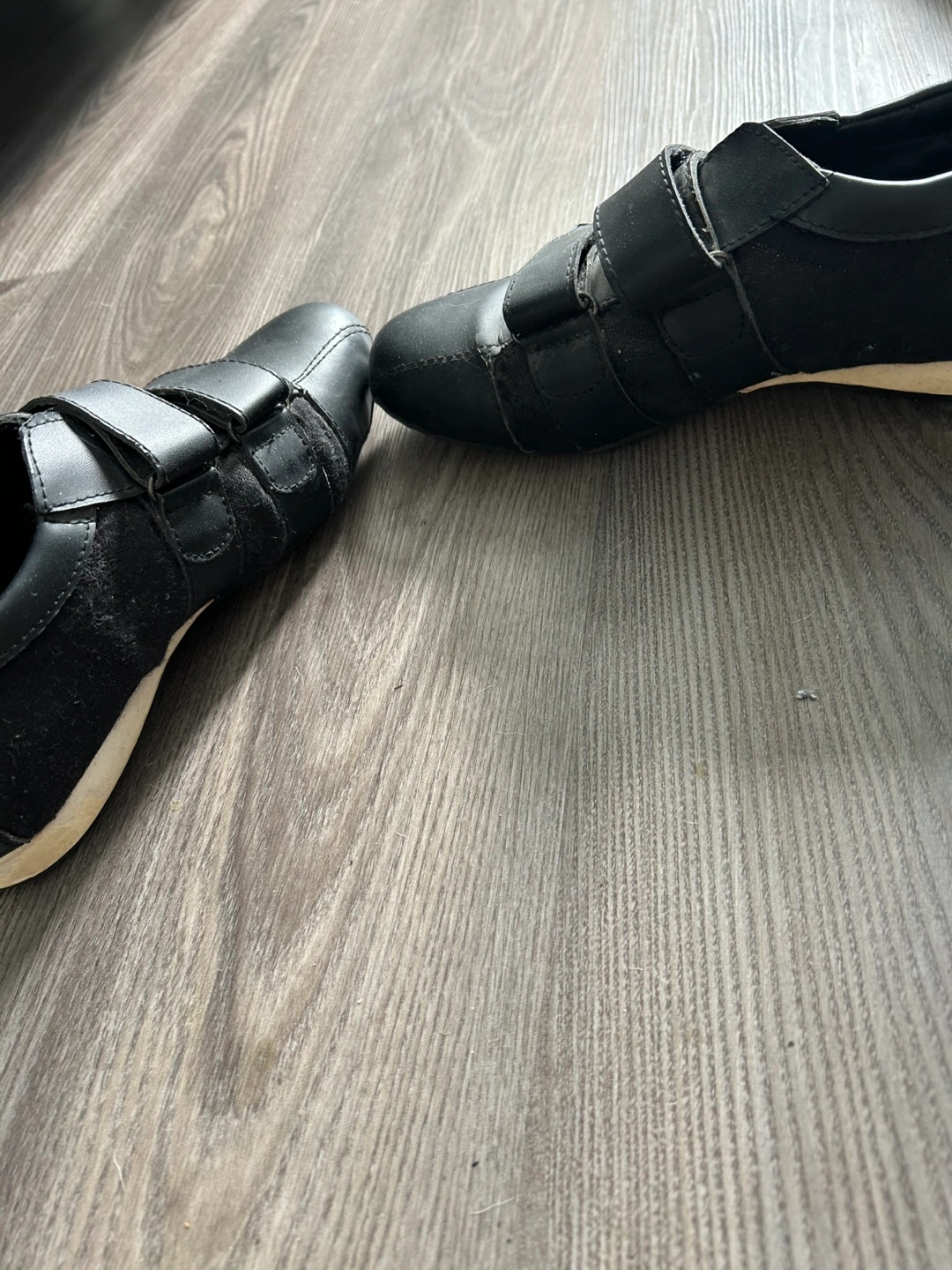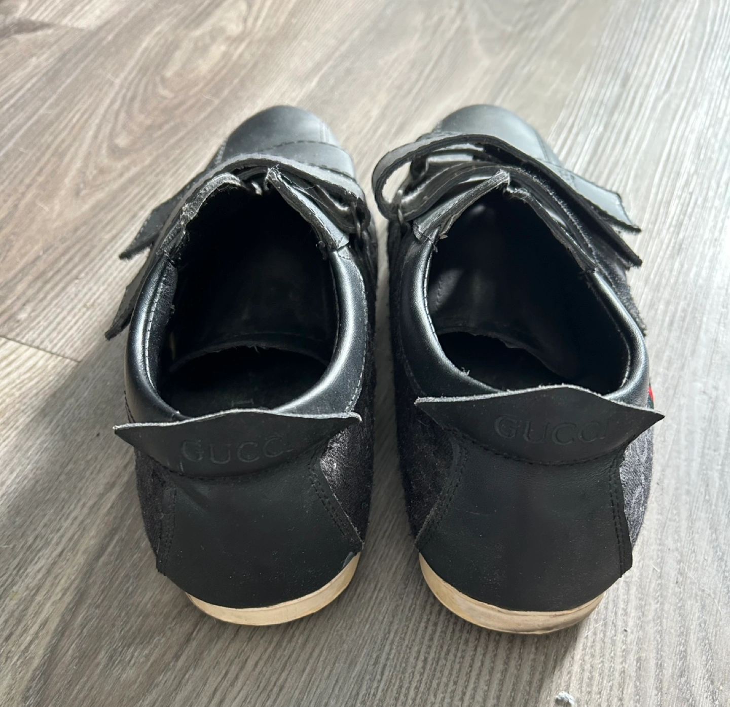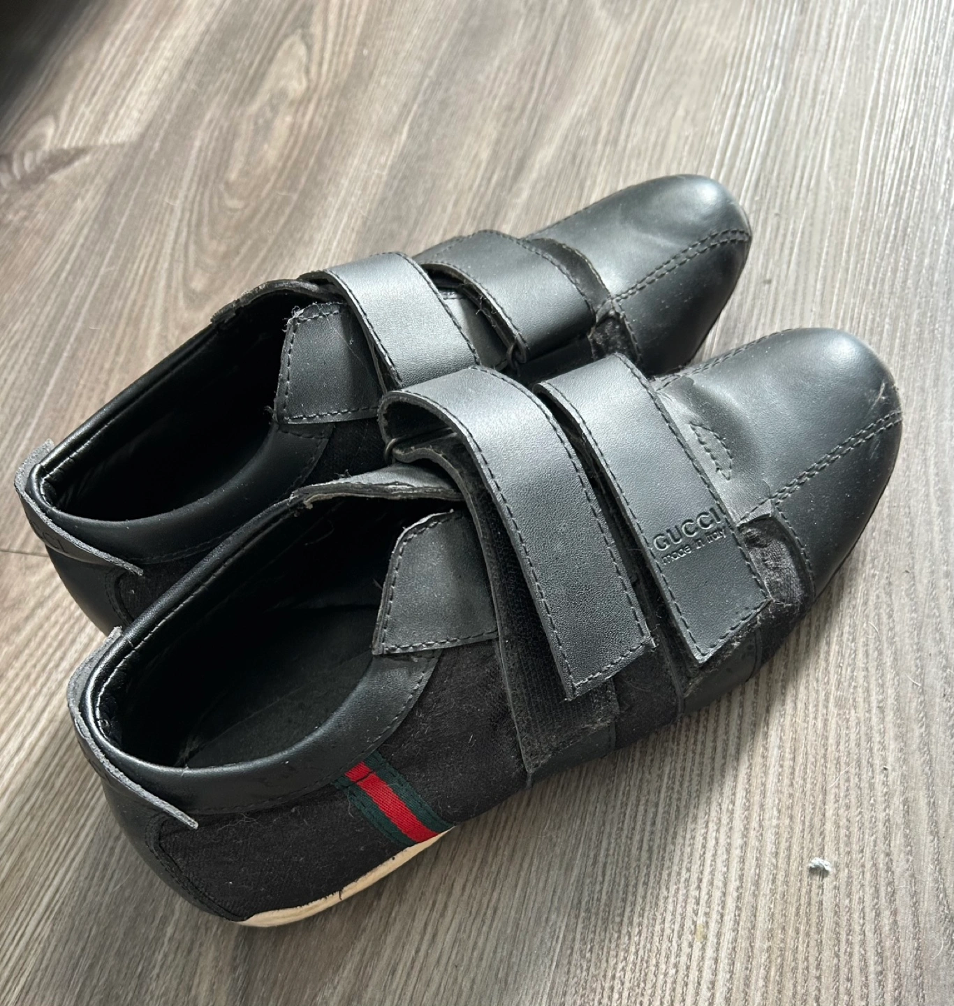 Pre-owned Gucci shoes. Black leather and fabric upper. Velcro straps. Minor wear.