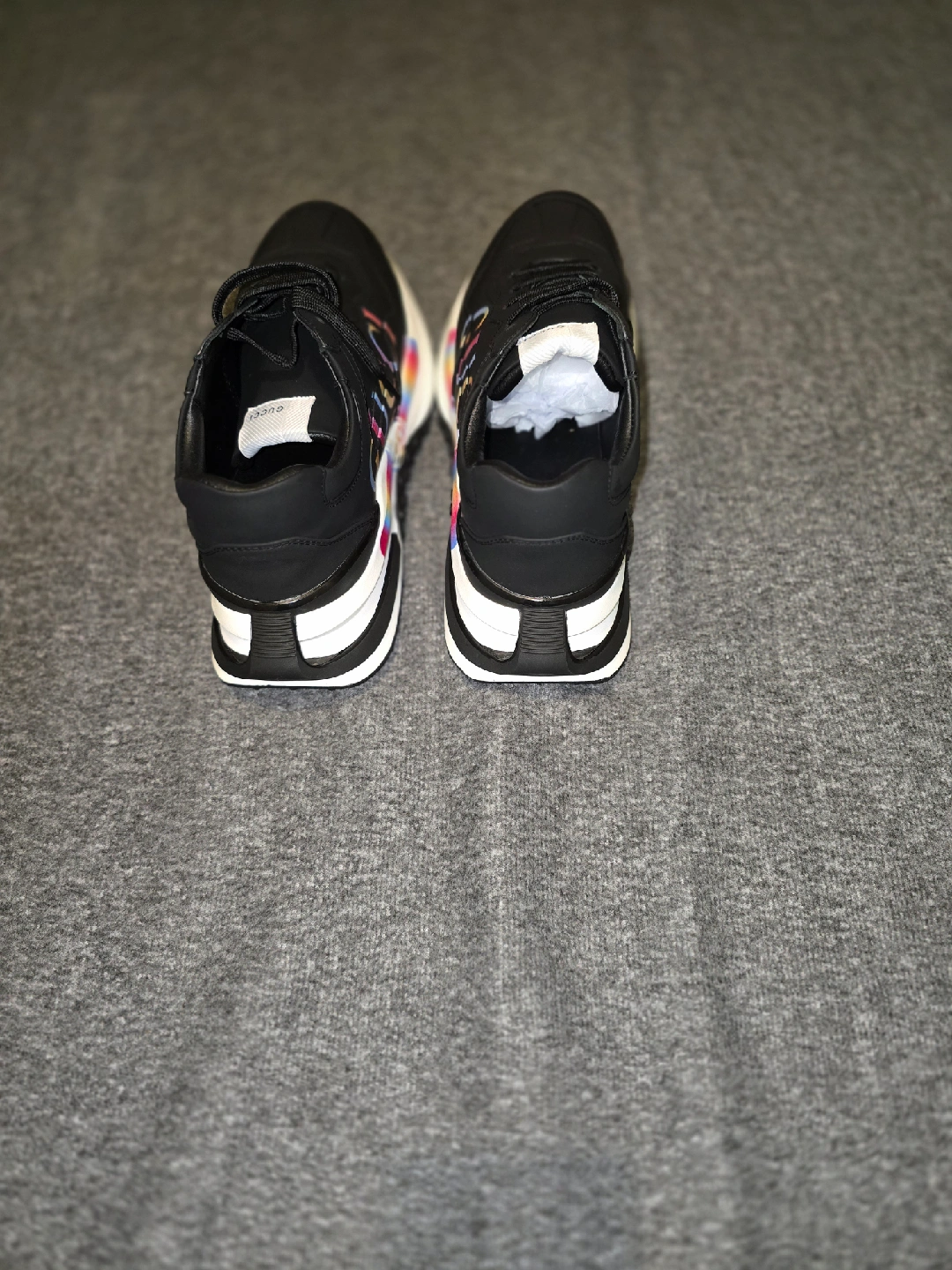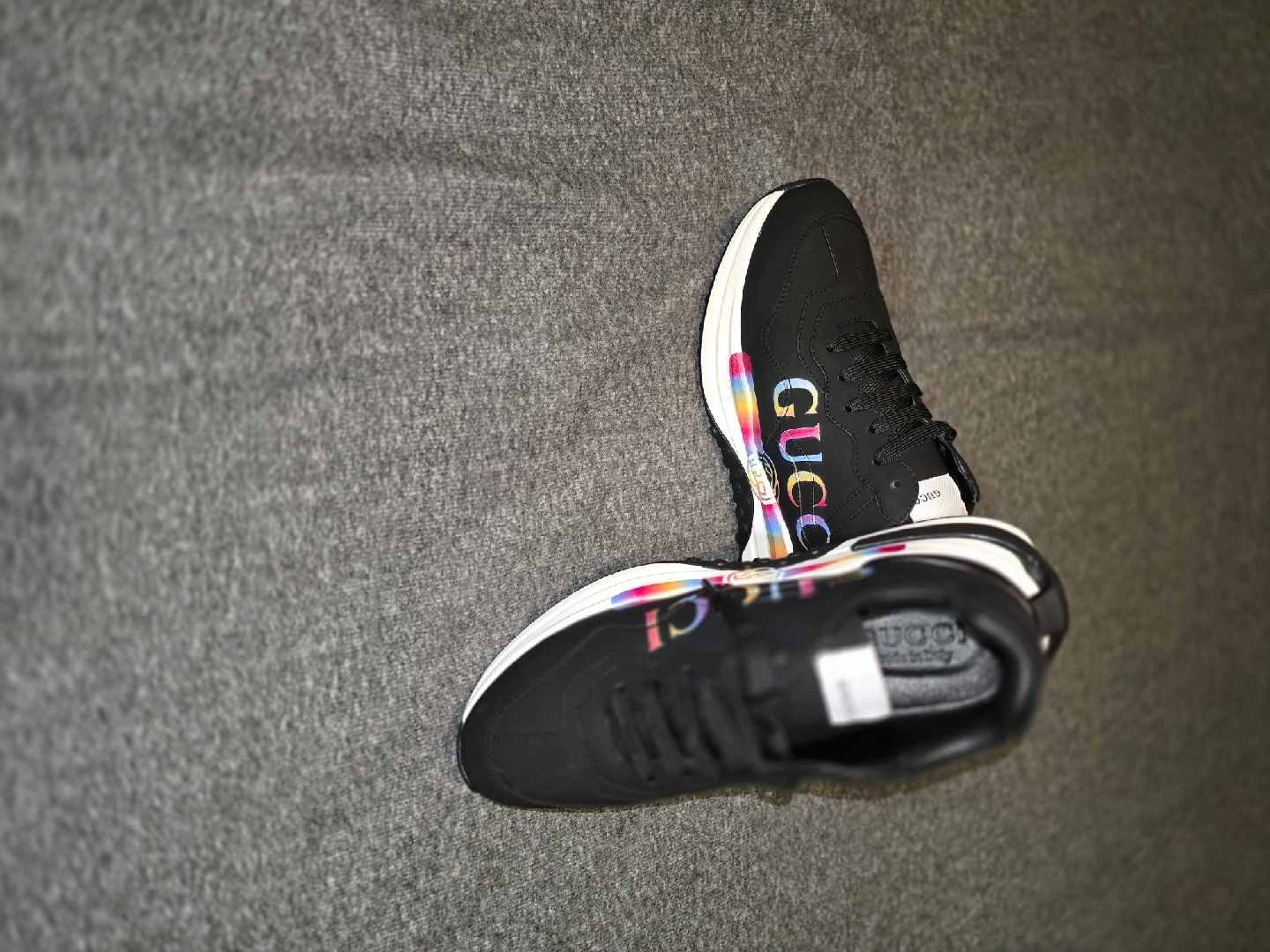 65Selling a pair of Gucci sneakers in black. These stylish sneakers feature the Gucci logo in a colorful design. They appear to be in good condition and ready for a new owner!