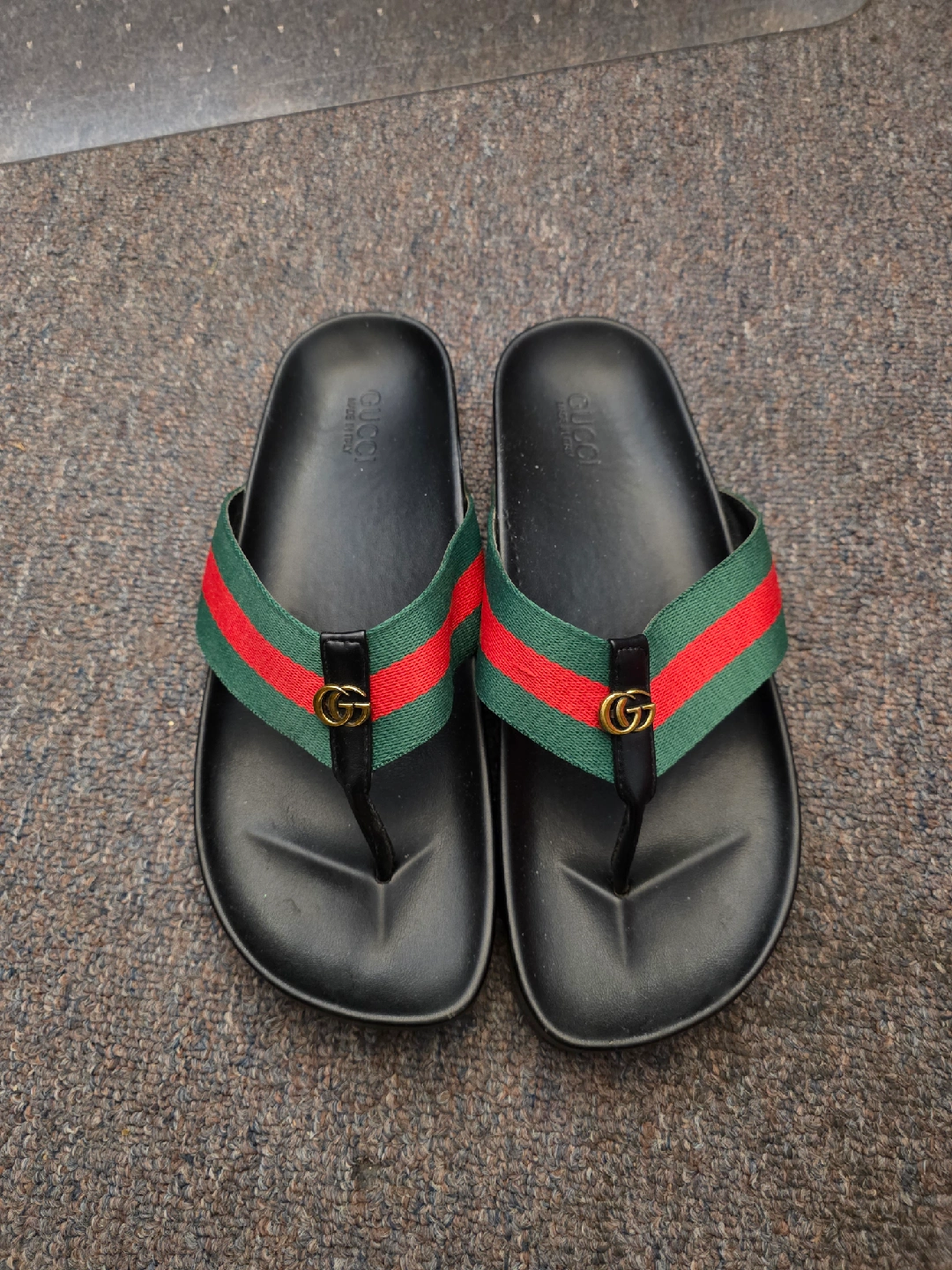 Selling a pair of Gucci thong sandals in black with the iconic green and red stripe detail. These stylish sandals are perfect for adding a touch of luxury to your casual outfits. They feature the classic Gucci logo on the strap. Great condition!
