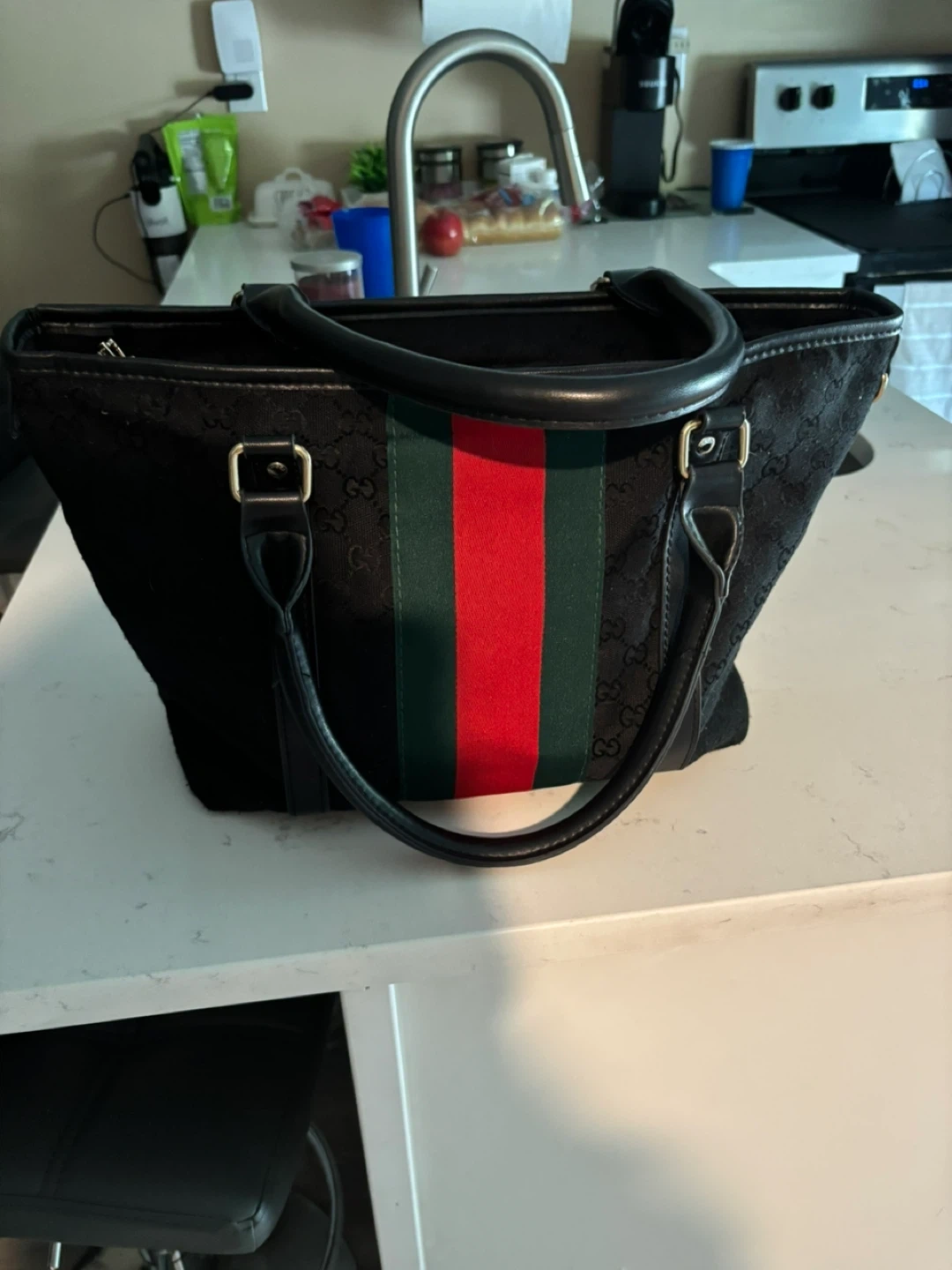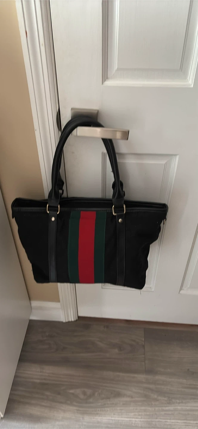 Selling a Gucci tote bag in black! It features the classic Gucci design with a red and green stripe down the middle. It's in great condition and ready for a new home knock. Off