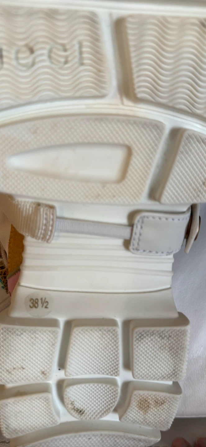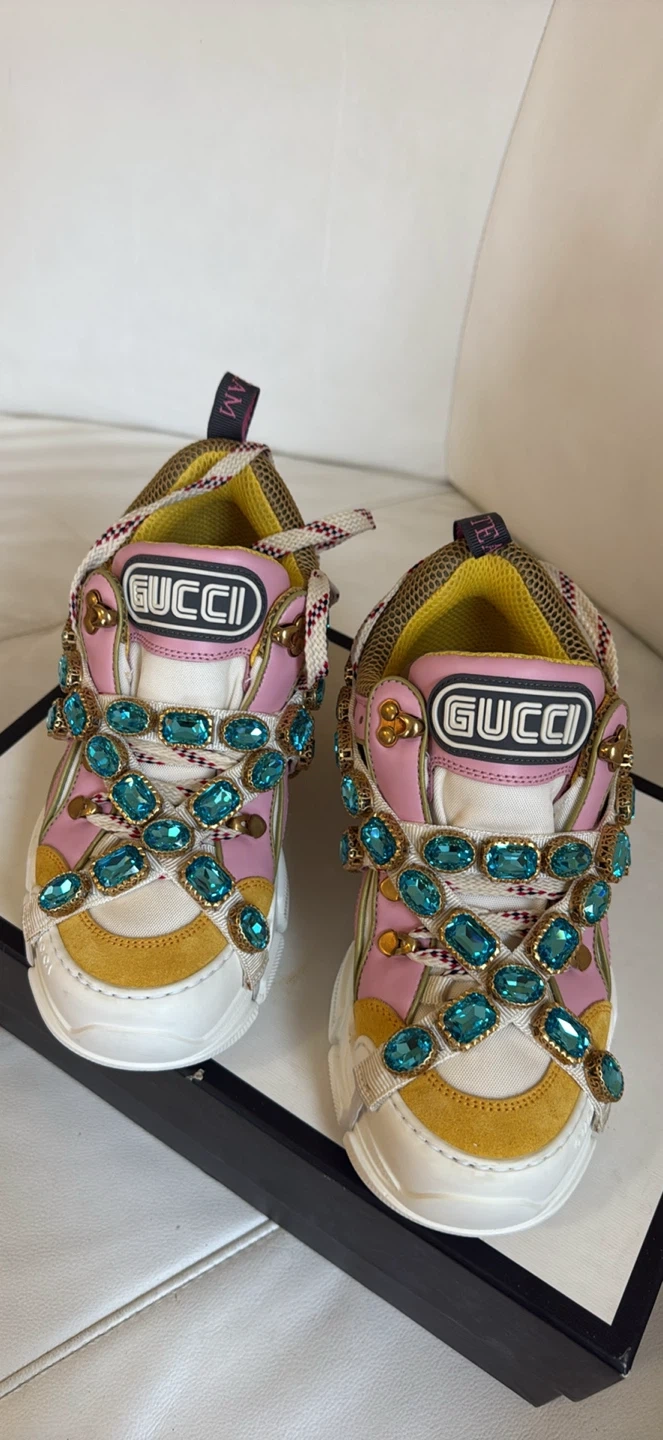 Selling a pair of Gucci Flashtrek sneakers! They are embellished with turquoise stones and have a unique design. The size is 38 1/2, which is approximately a US size 8.5. They are made in Italy and have the Gucci logo inside