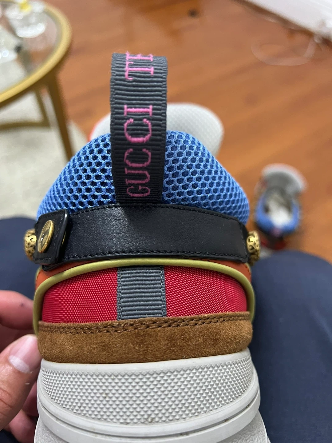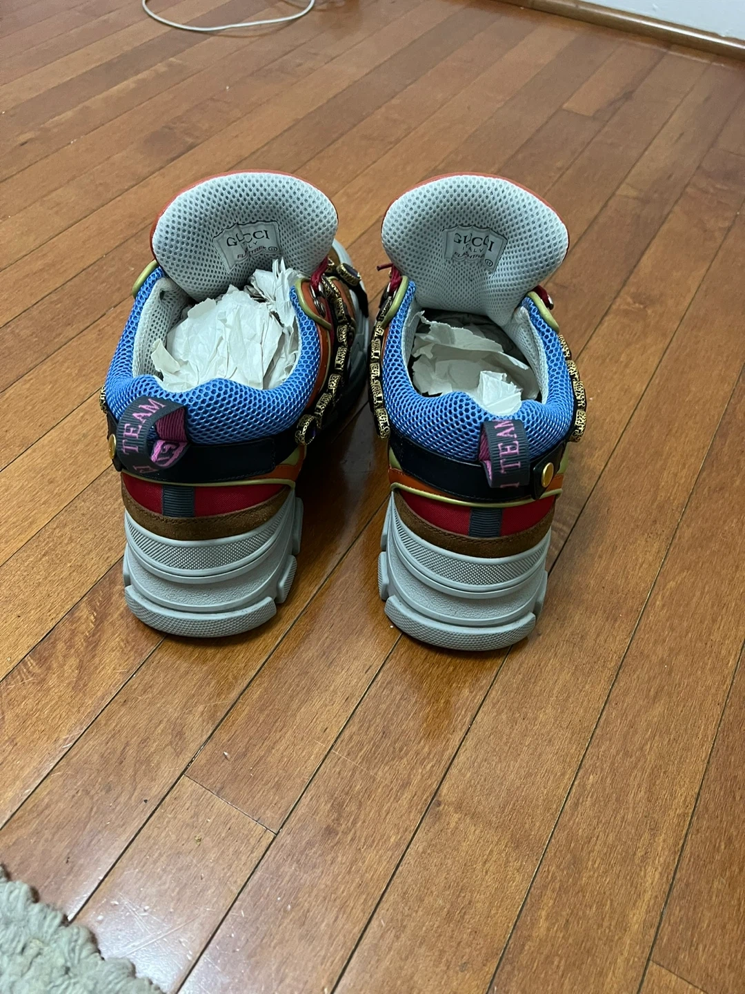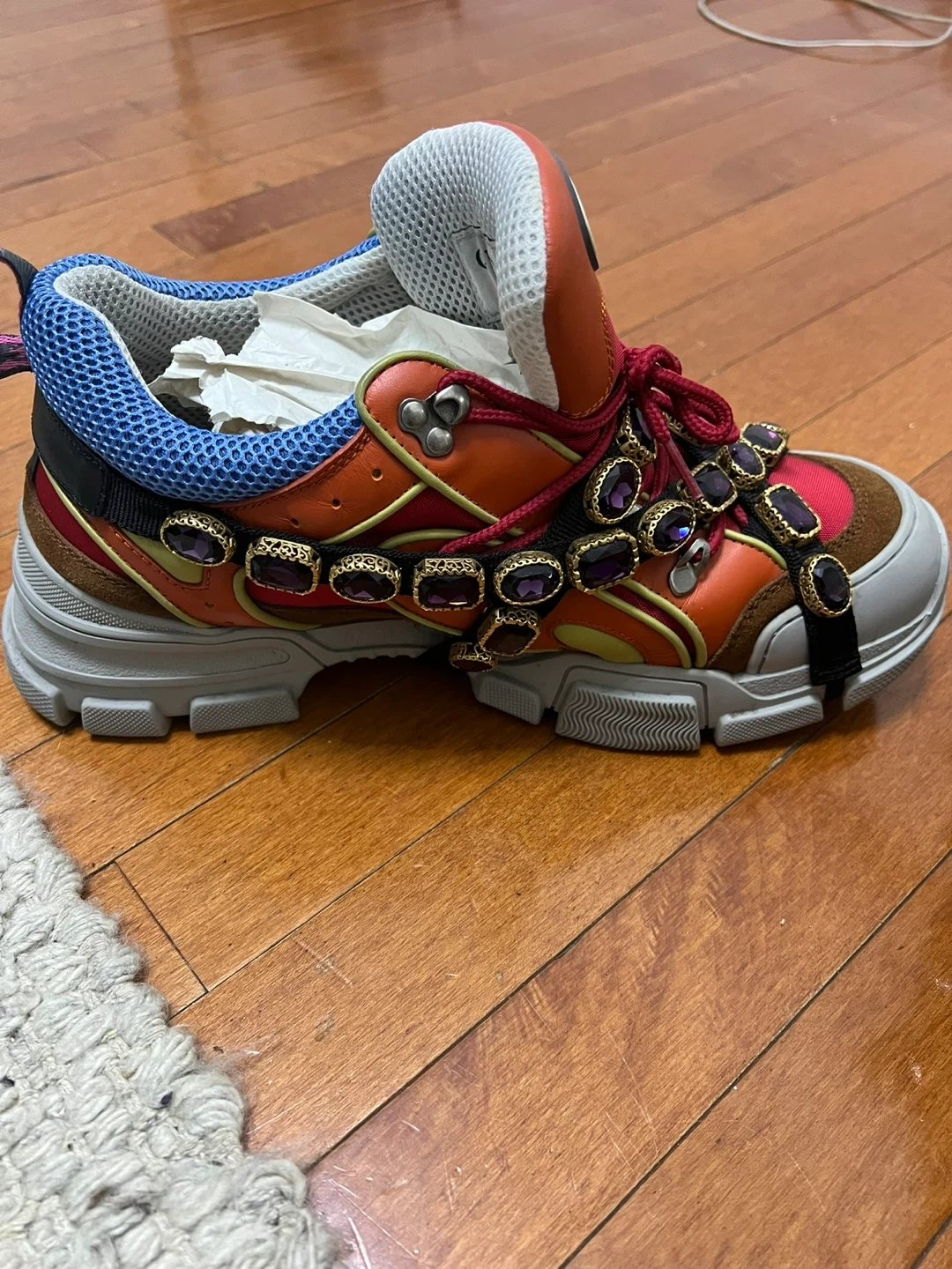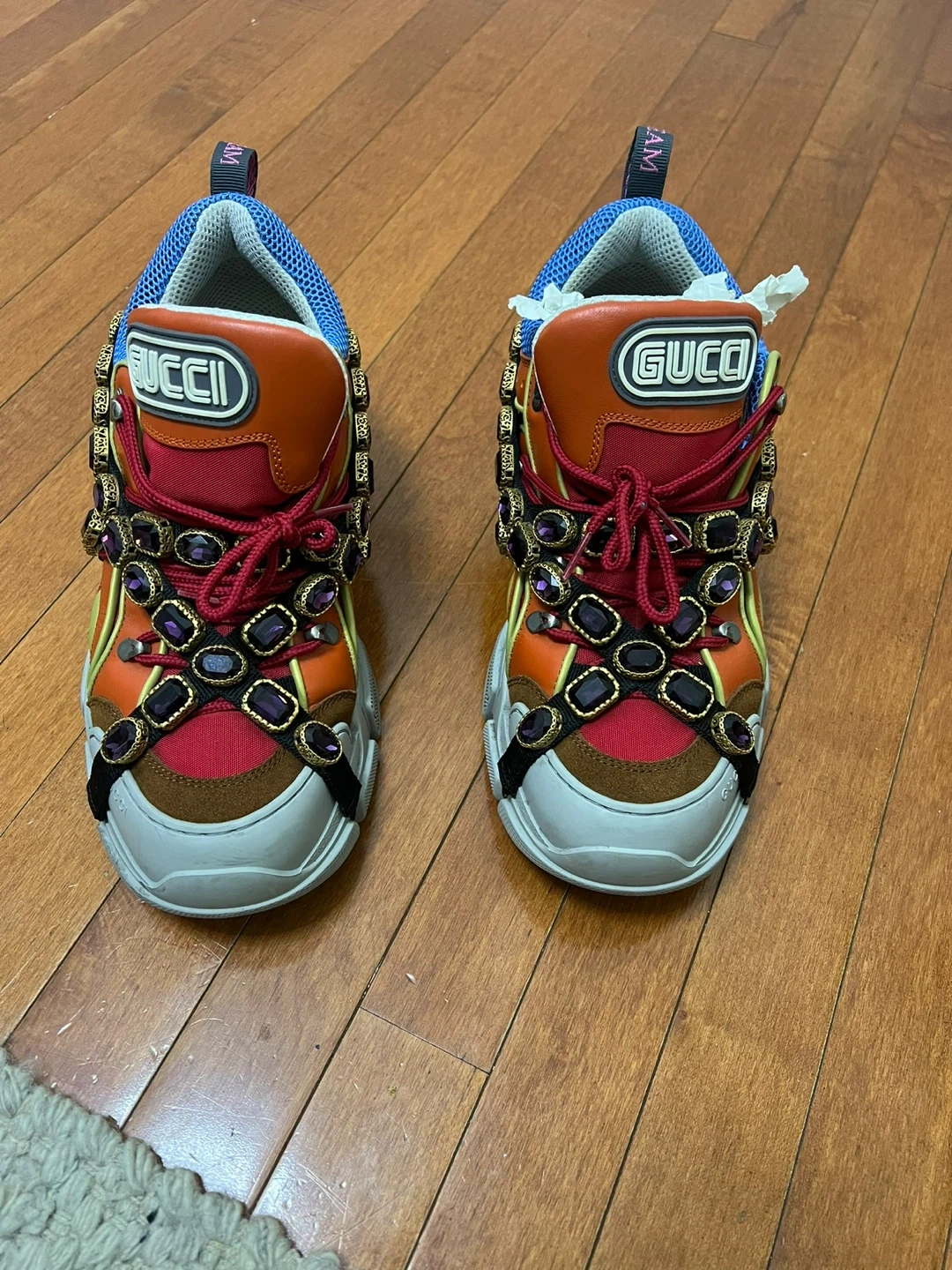 Selling a pair of Gucci Flashtrek sneakers in size 11. These are a multicolor design with purple crystal detailing. They are in good condition and ready for a new home