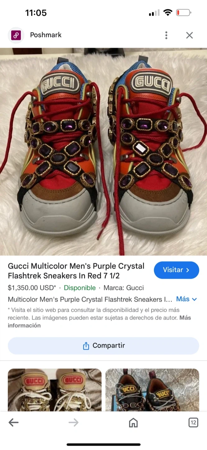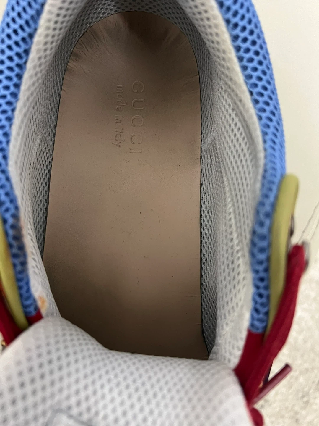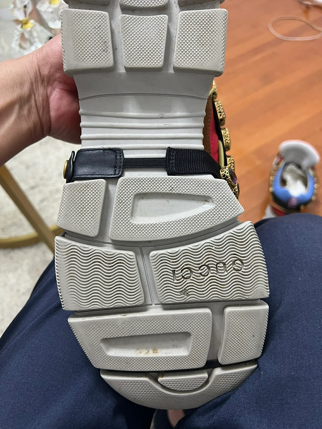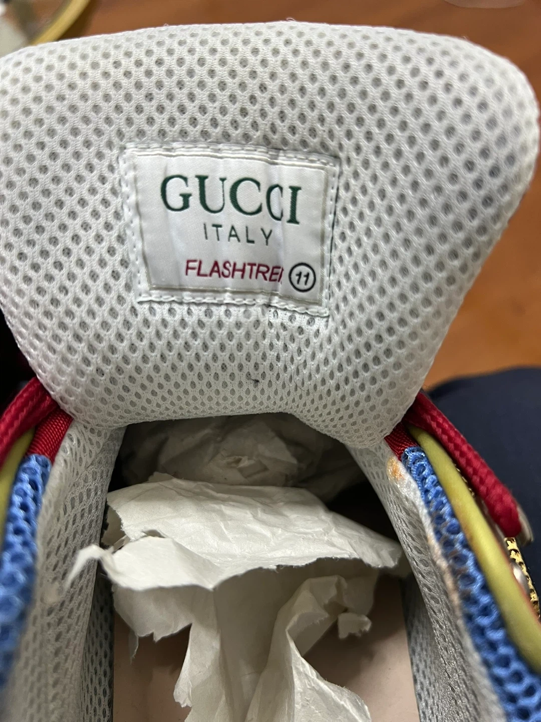 Selling a pair of Gucci Flashtrek sneakers in size 11. These are a multicolor design with purple crystal detailing. They are in good condition and ready for a new home