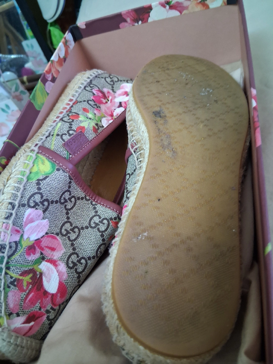 Selling a pair of Gucci floral espadrilles in size 37. They have the classic Gucci logo with a beautiful floral pattern. These shoes are pre-owned and show some signs of wear, as seen in the pictures, but they still have plenty of life left! Comes with original box
