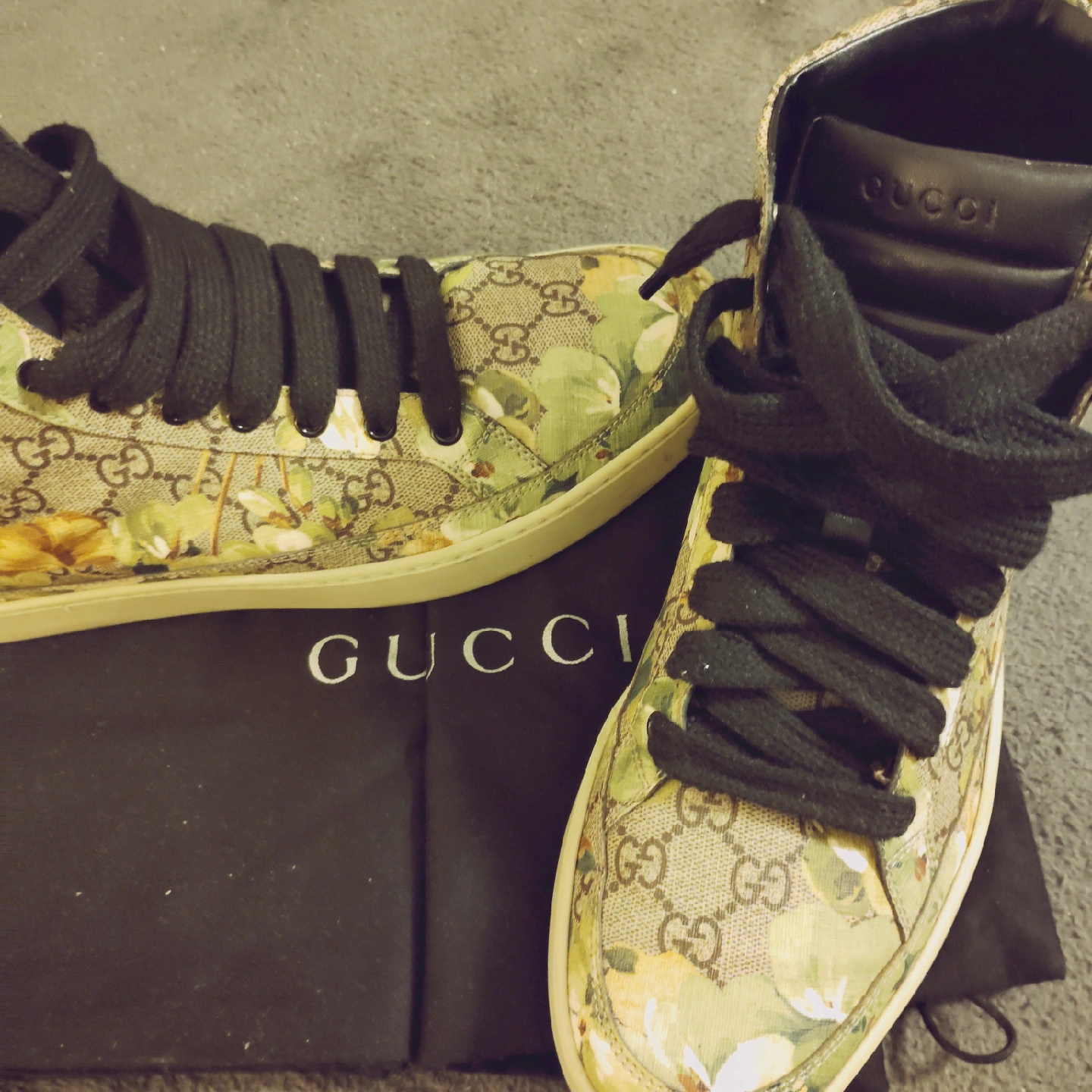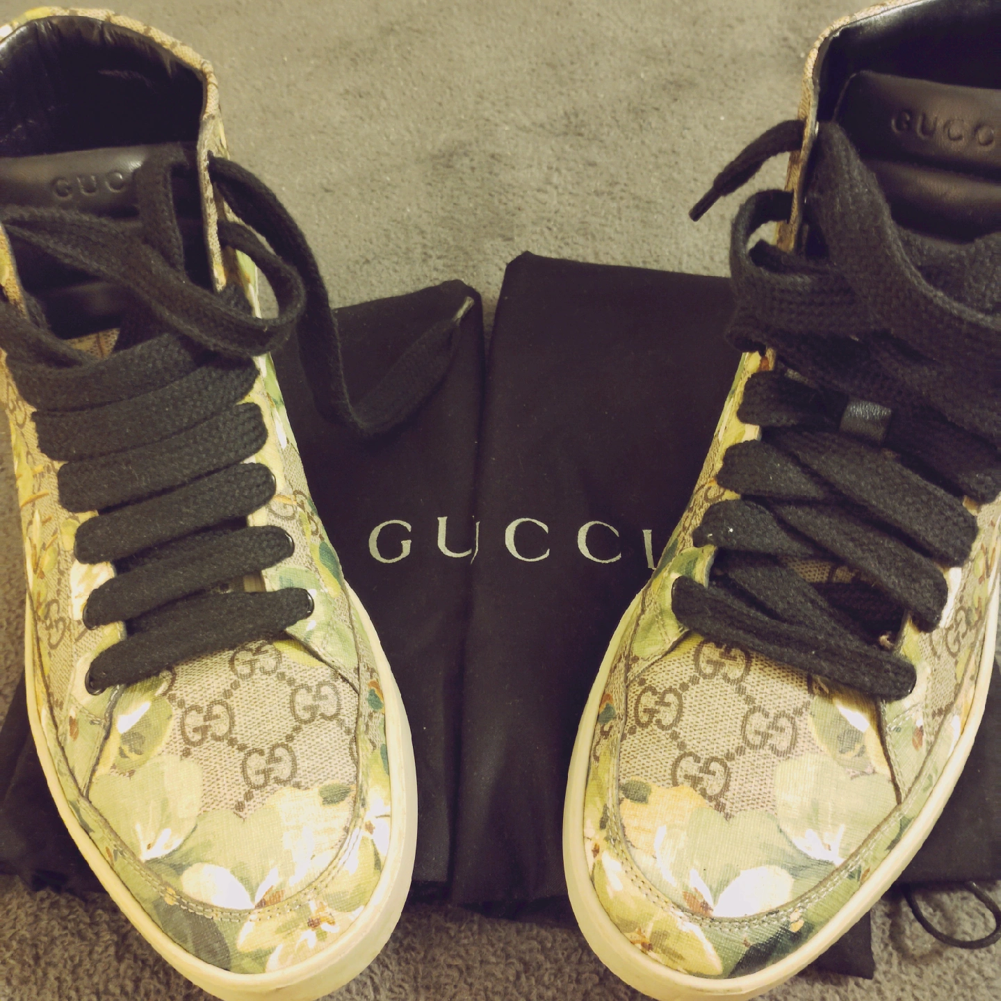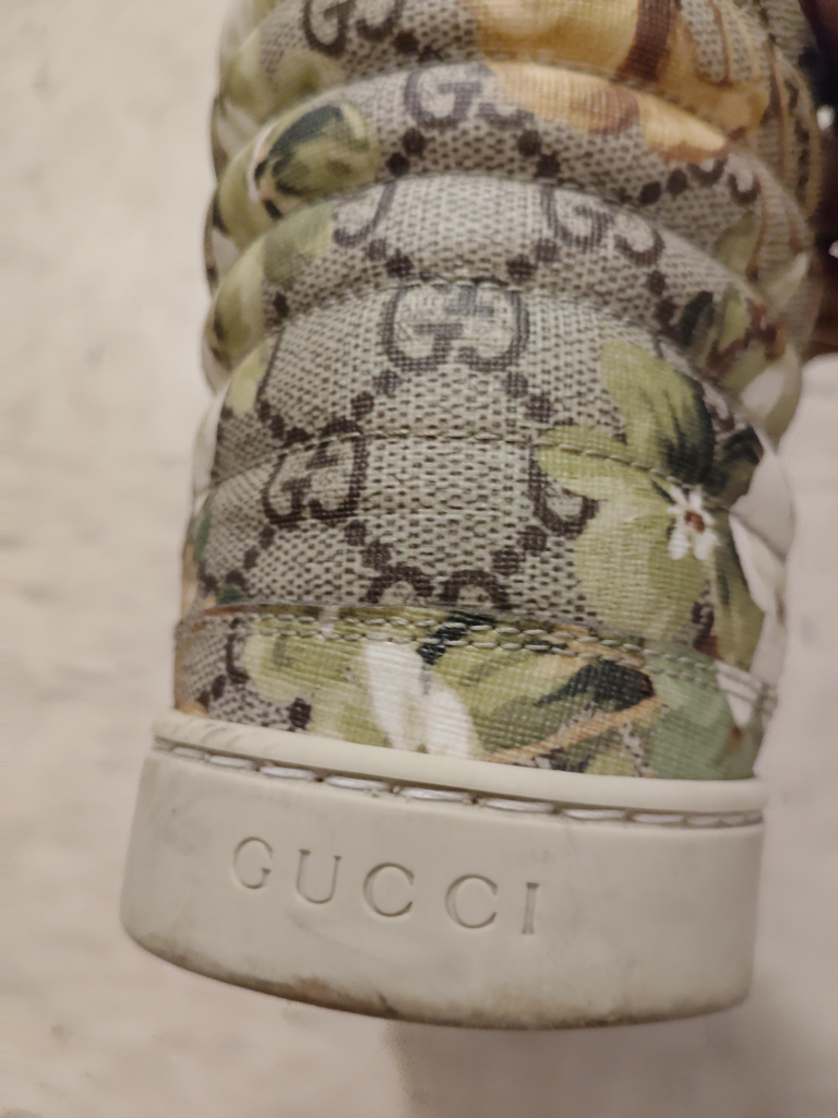 10Selling a pair of Gucci high-top sneakers with a unique floral design! These sneakers are in good condition and come with a Gucci dust bag. They feature the iconic Gucci logo pattern throughout the design, making them a stylish statement piece for your wardrobe