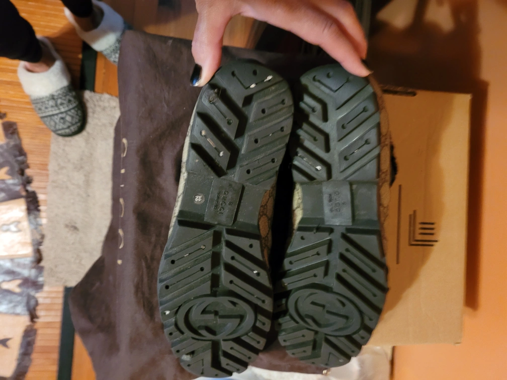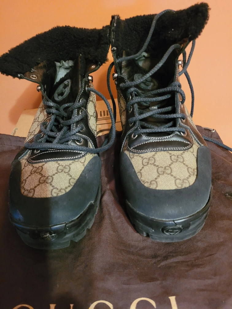 Selling a pair of Gucci GG canvas lace-up boots in size 42. They show some signs of wear, as seen in the photos, but still have a lot of life left! These boots feature the iconic GG canvas pattern and a lace-up design.