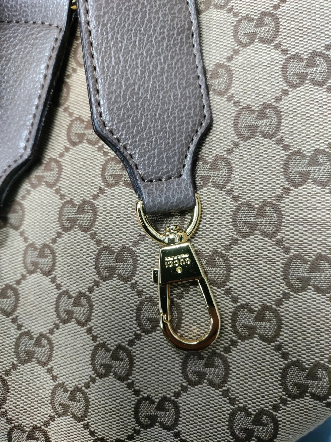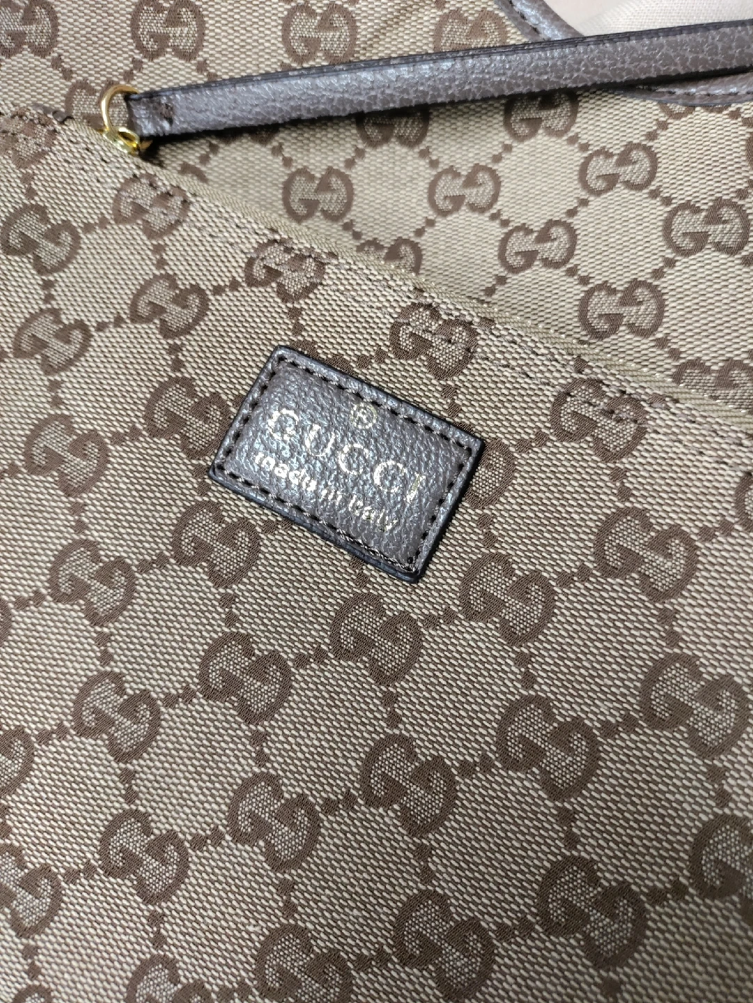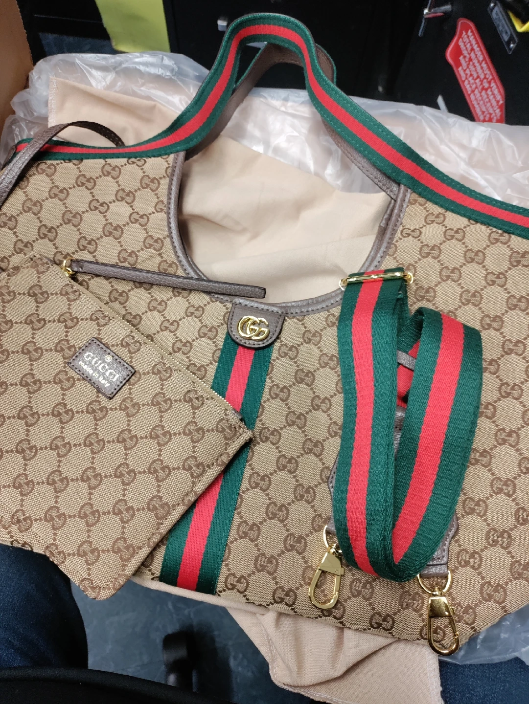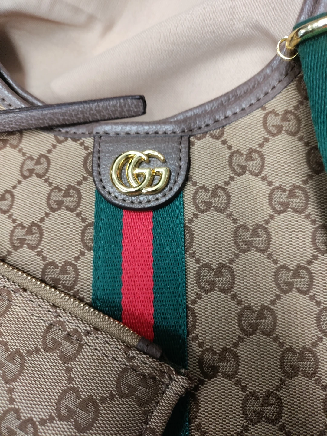 21This is a large Gucci tote bag featuring the iconic GG canvas pattern. It has red and green stripe detailing and gold-tone hardware accents. Perfect for everyday use!