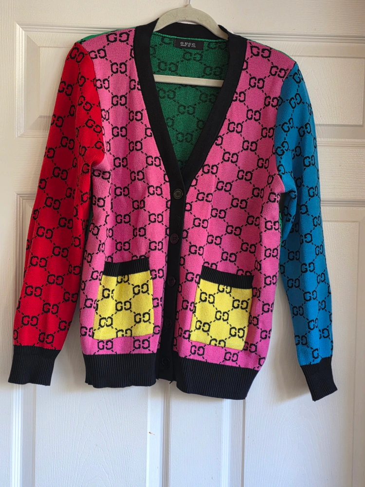 Selling a fun and vibrant Gucci cardigan! It features a colorful design with the Gucci logo pattern throughout. The cardigan has a black trim and button-down closure. It's a stylish statement piece for any wardrobe!