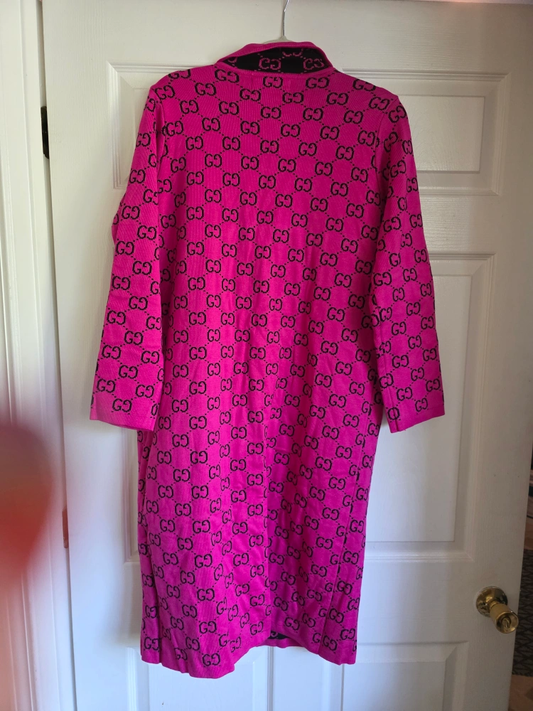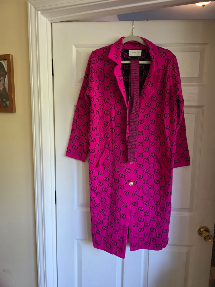 Selling a beautiful Gucci coat in a vibrant pink color. It features the iconic GG jacquard knit design. This coat is made from a comfortable wool blend, perfect for adding a touch of luxury to your wardrobe