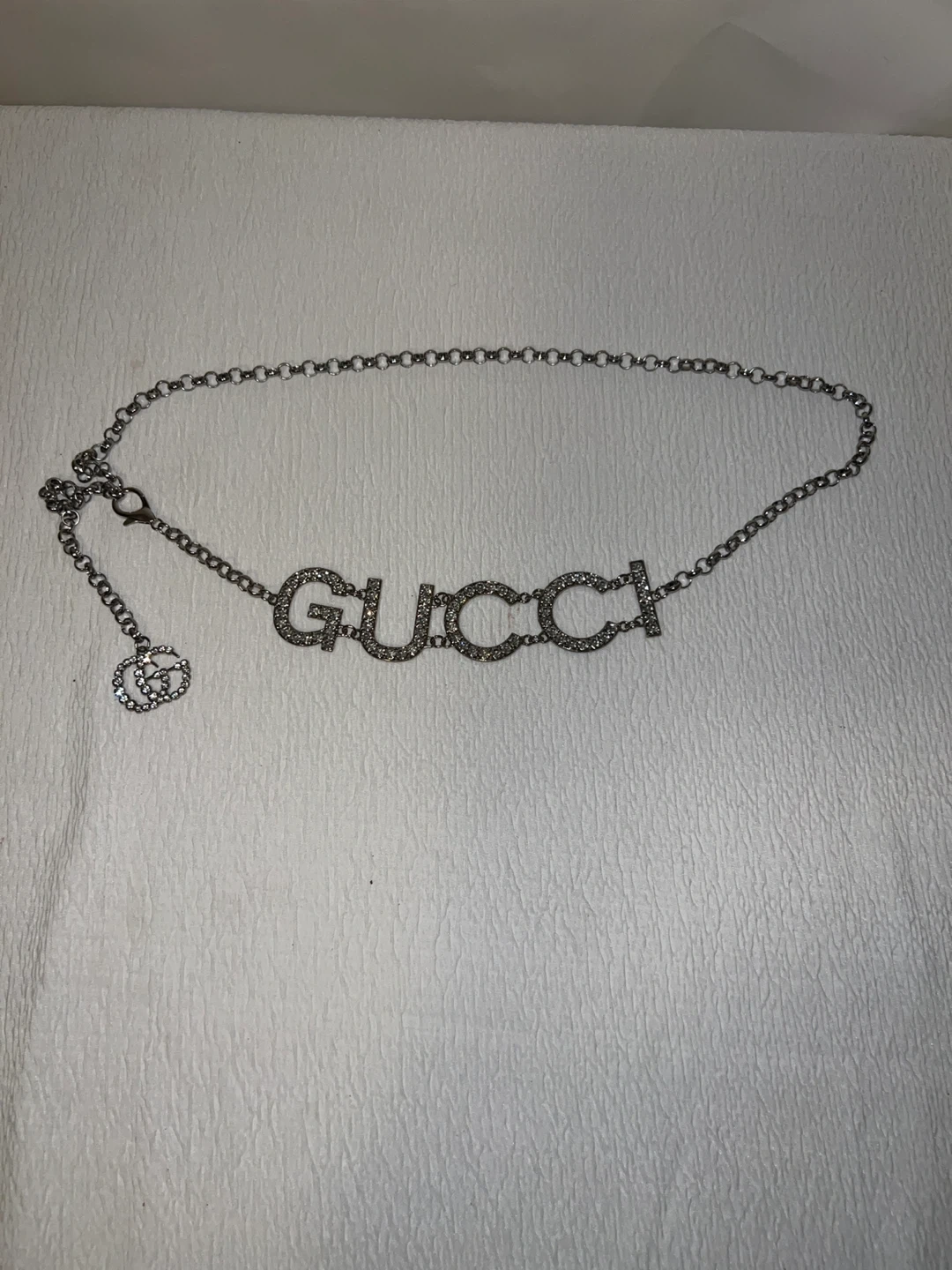 Selling a cute Gucci silver chain belt! It has rhinestone detailing on the Gucci logo. Perfect for adding a little sparkle to your outfit!