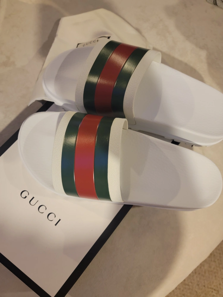 10Selling a pair of Gucci slides in white with the iconic Gucci stripe! These are in great condition and come with the original box and dust bag. Perfect for adding a touch of luxury to your casual look!
