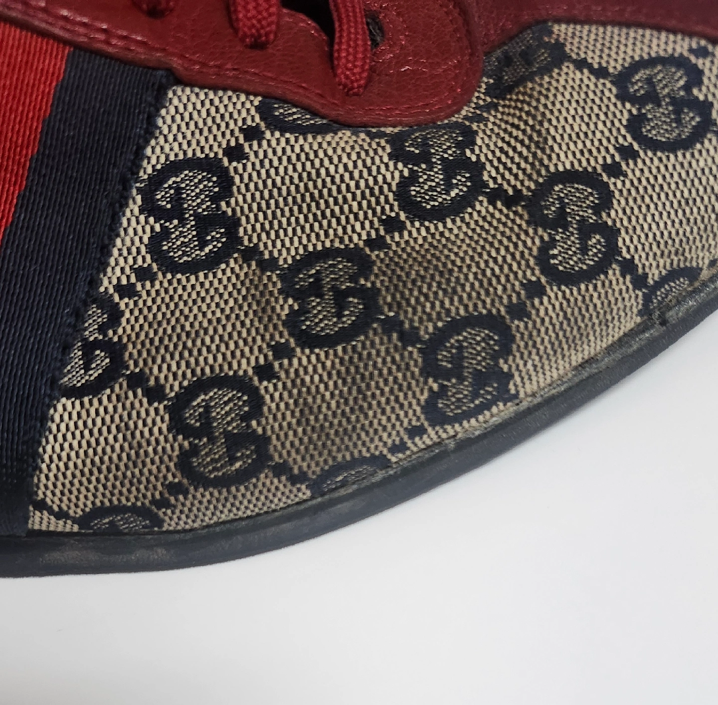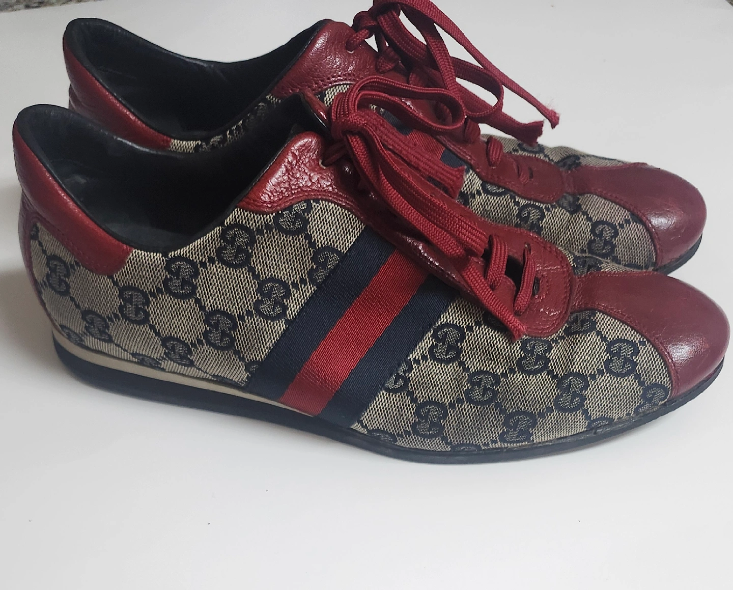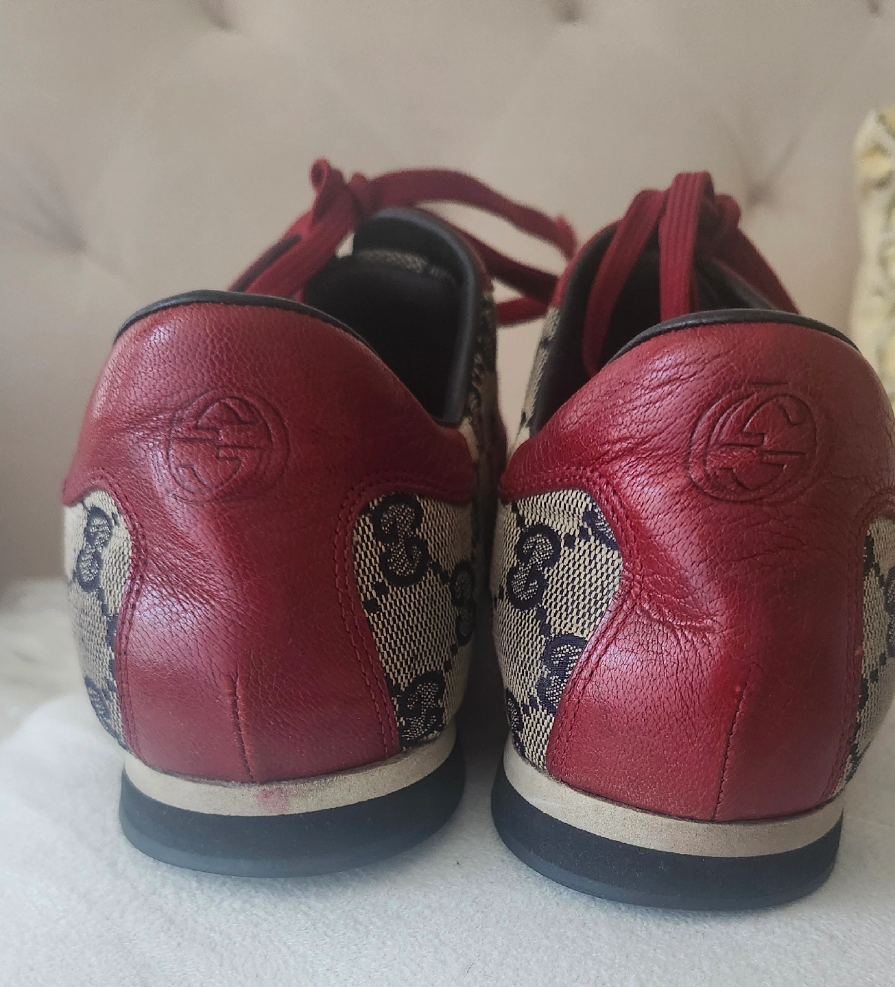 Selling a pair of Gucci sneakers. They feature the classic Gucci logo pattern and a red and navy stripe detail. They show signs of wear, sneakers are soil and leather is wrinkle at heel. Please view images carefully.
