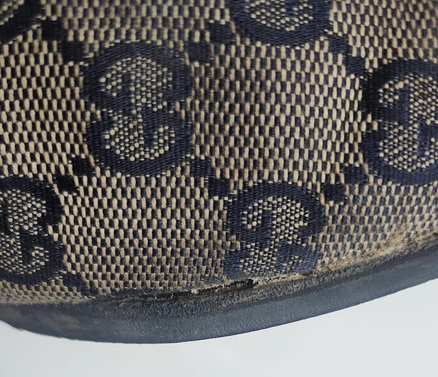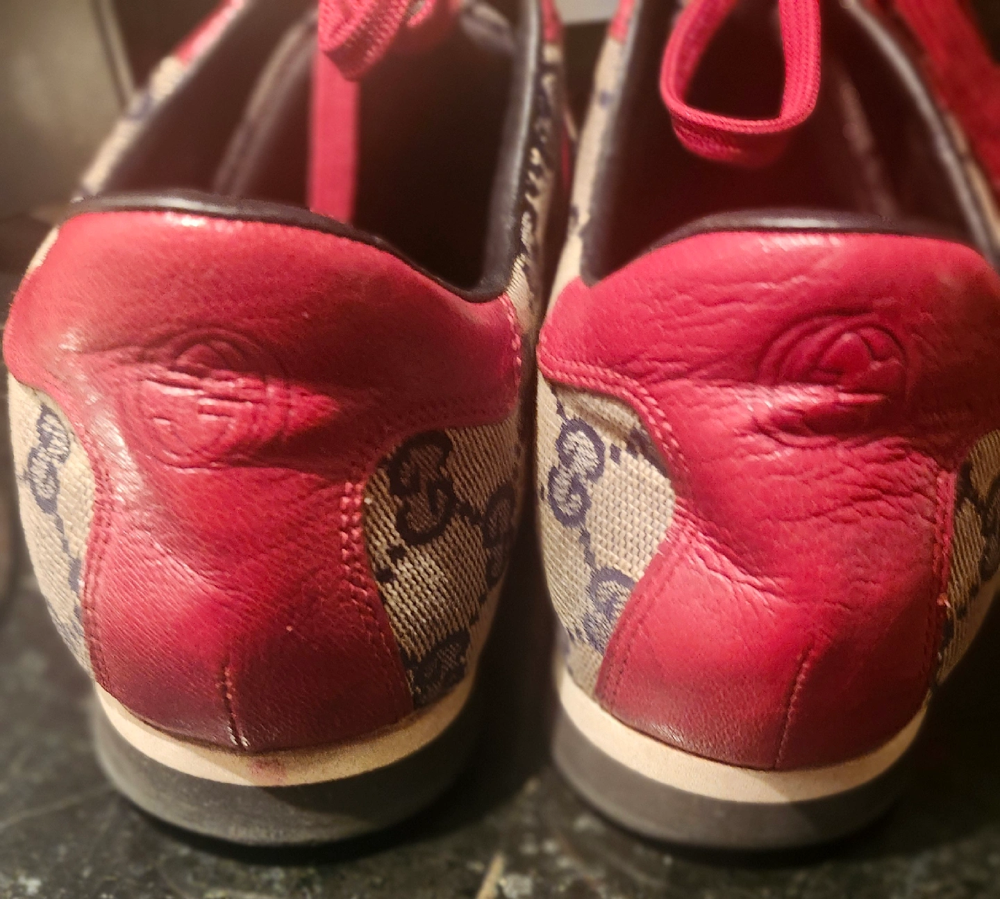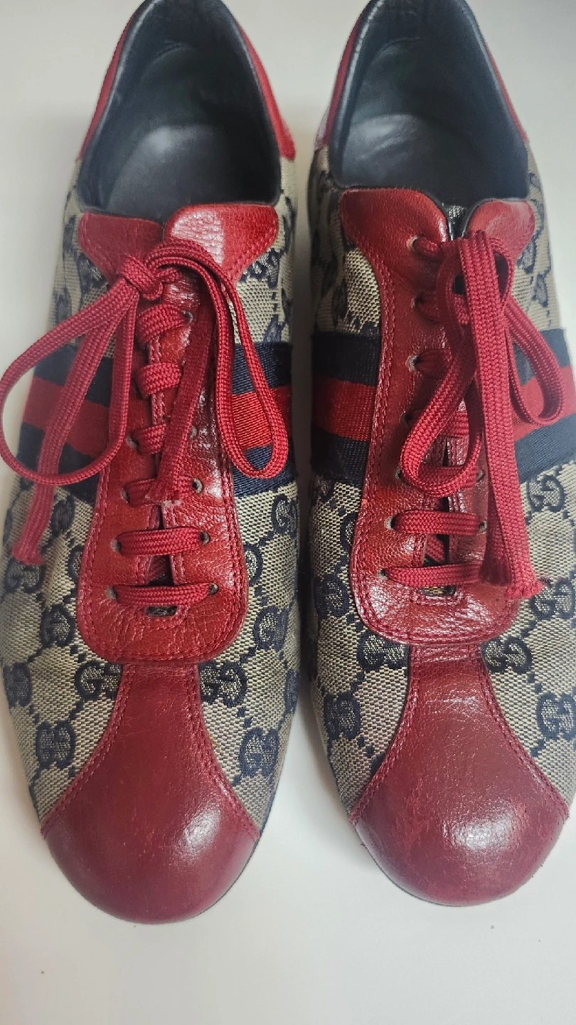Selling a pair of Gucci sneakers. They feature the classic Gucci logo pattern and a red and navy stripe detail. They show signs of wear, sneakers are soil and leather is wrinkle at heel. Please view images carefully.
