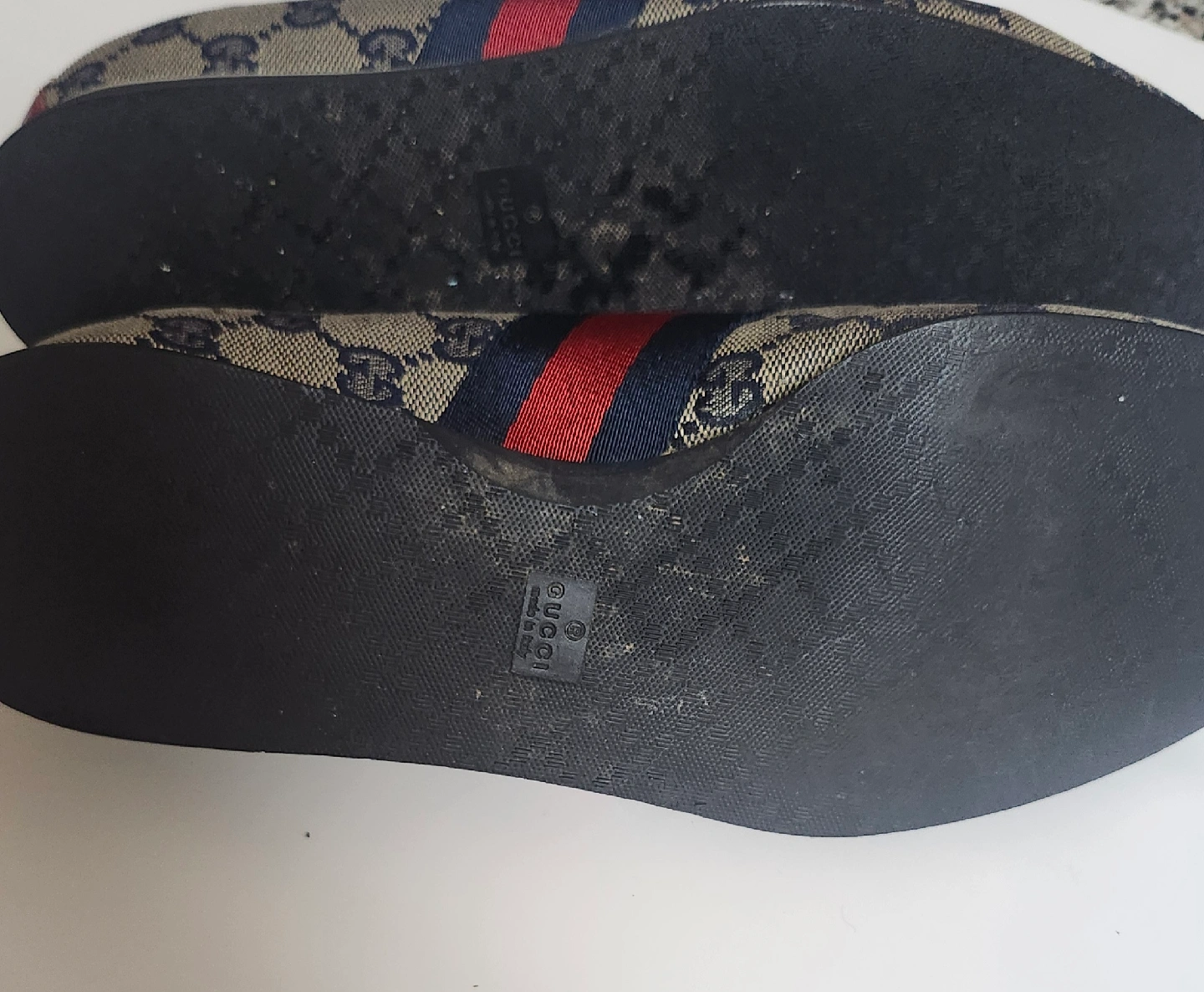 Selling a pair of Gucci sneakers. They feature the classic Gucci logo pattern and a red and navy stripe detail. They show signs of wear, sneakers are soil and leather is wrinkle at heel. Please view images carefully.