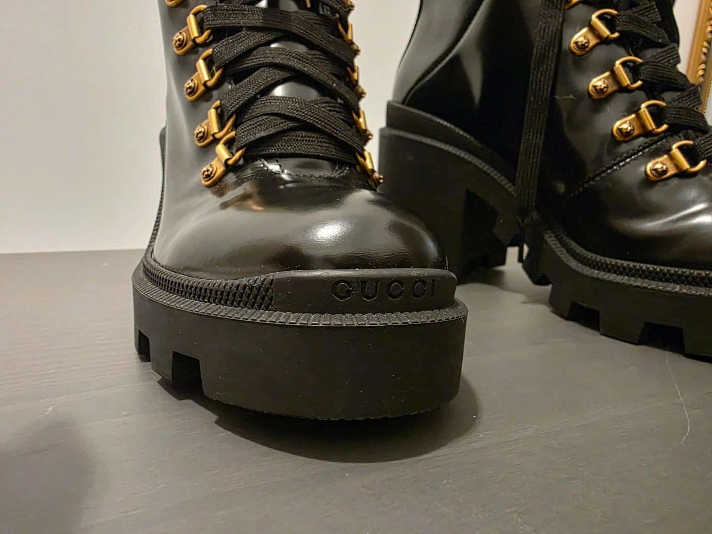 179Gucci Steam Punk leather boots, snake mark on the bottom of the shoe, leaving snake marks in footstep. Comes with red & gradient purple laces. Test Worn once. 8 & 1/2 womens size.