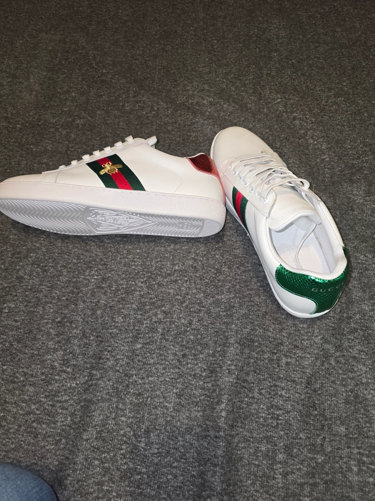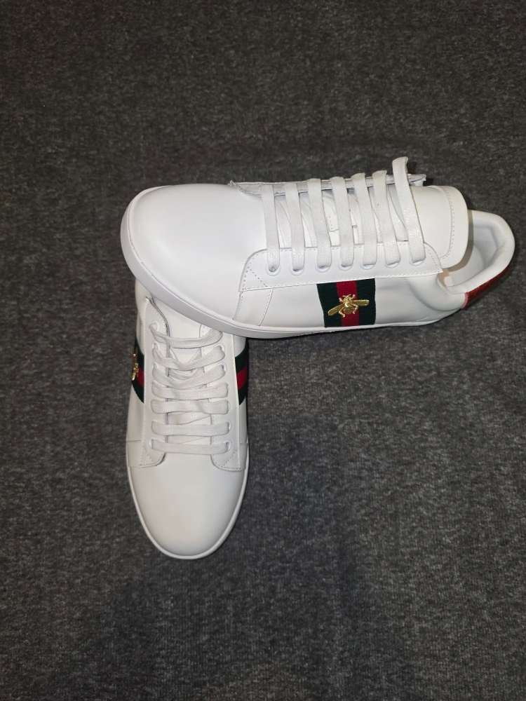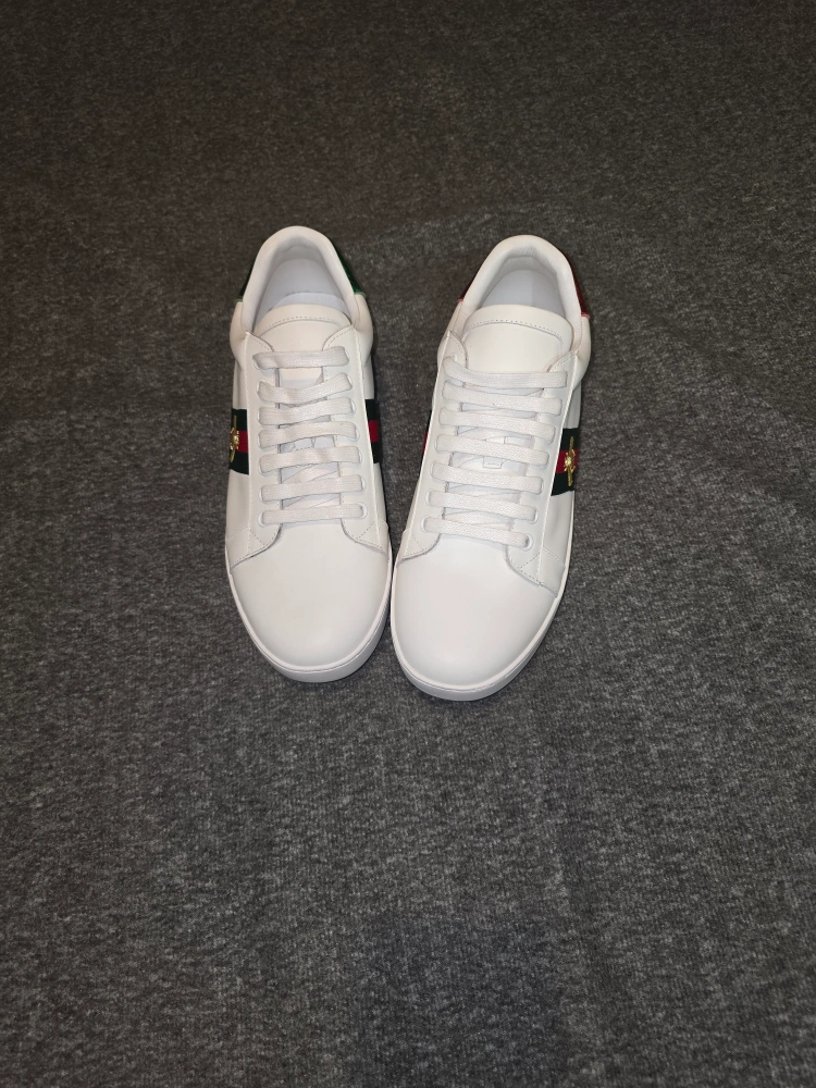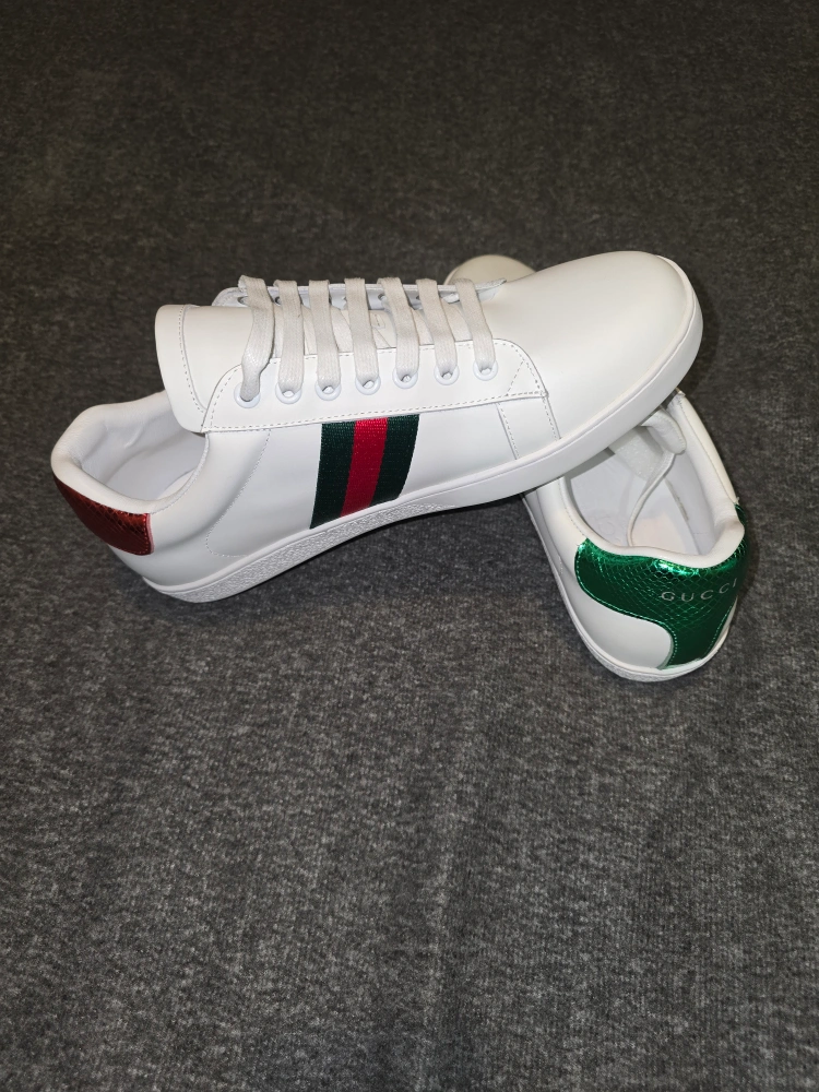 65These are a pair of white leather sneakers from Gucci. They feature the classic green and red stripe detail and the iconic Gucci logo. They are in great condition and ready for a new home!