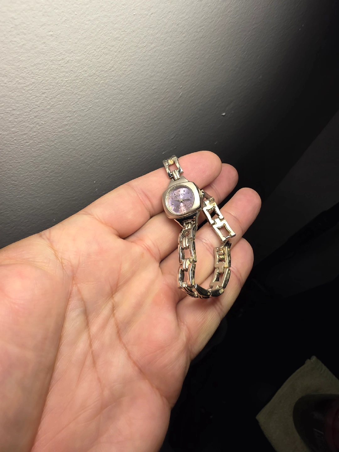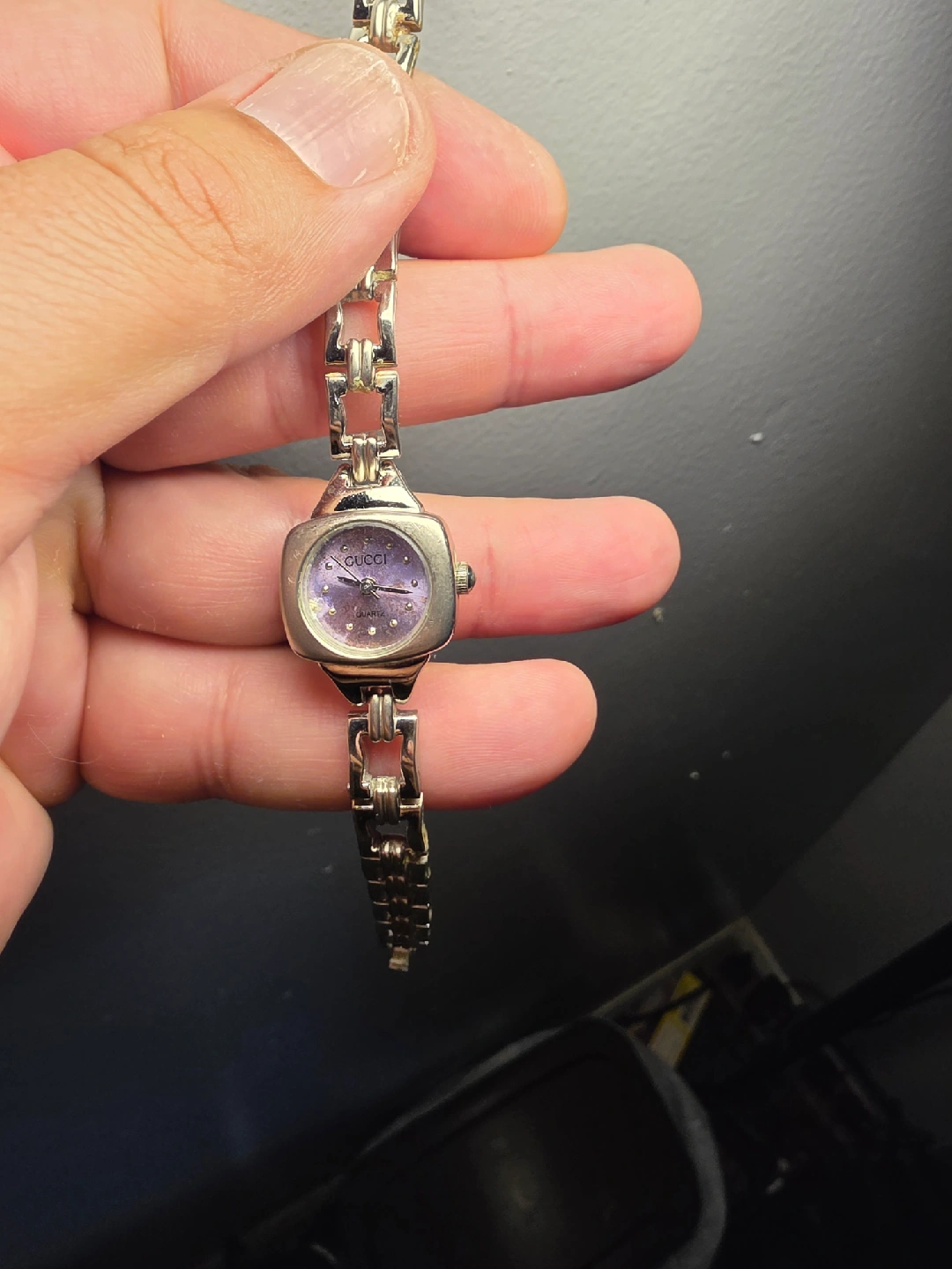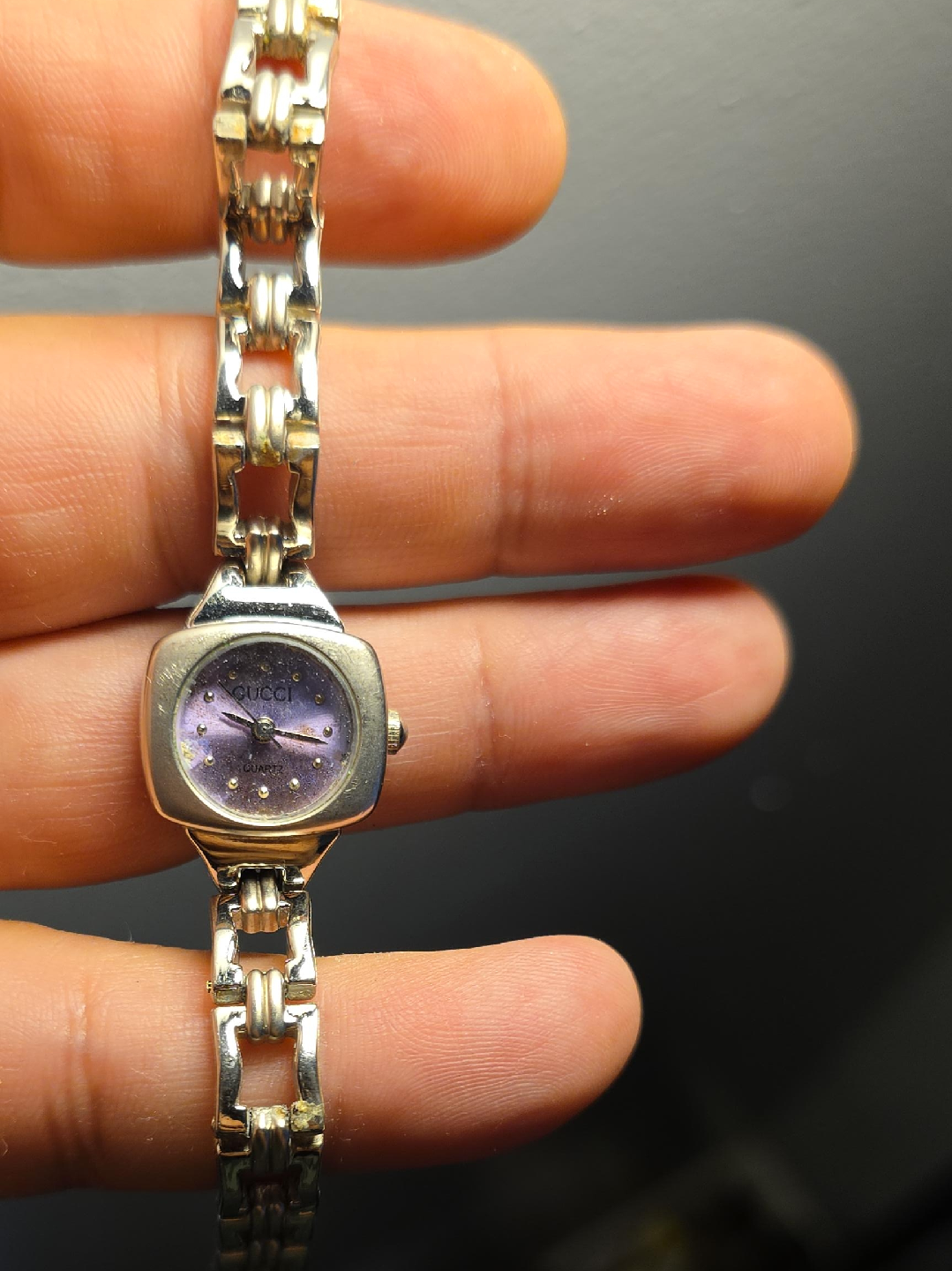 Selling a lovely Gucci women's quartz watch. It features a silver-tone band and a unique purple face. The watch is in good condition and ready to wear!