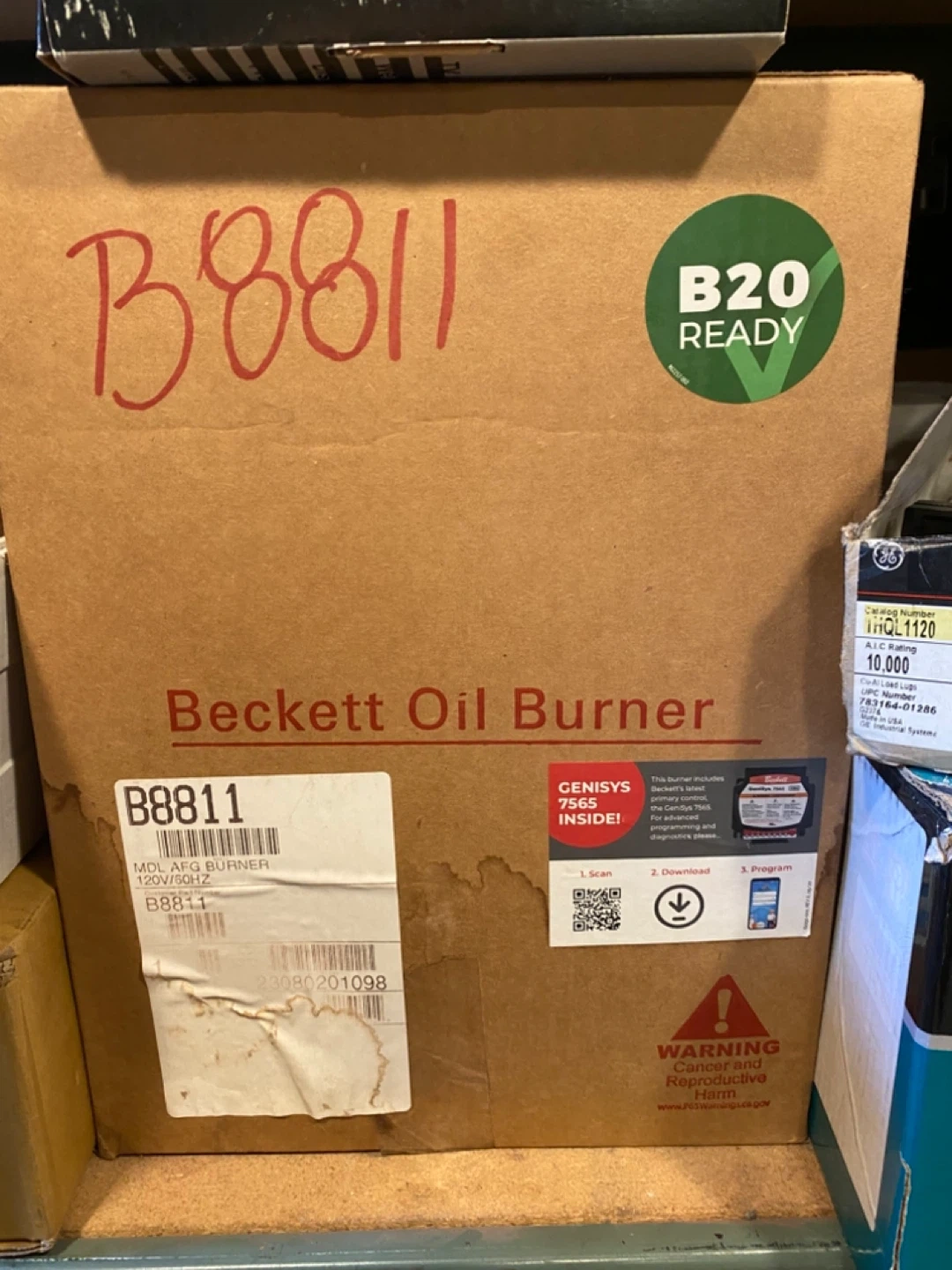 Selling a Beckett Oil Burner, model B8811. It's an MDL AFG BURNER, 120V/60HZ. Comes in its original box with a 'B20 Ready' sticker. Please see photos for details!