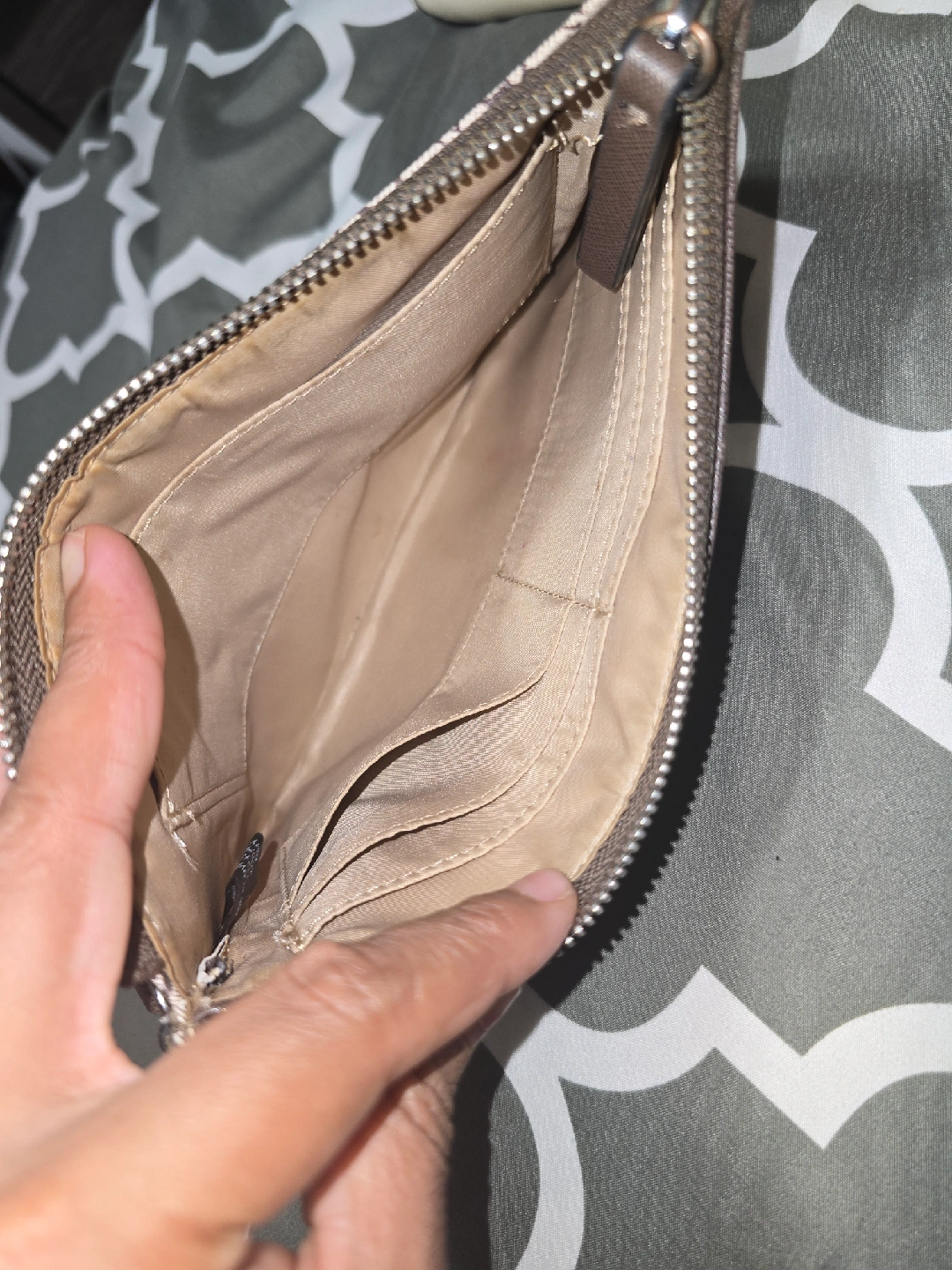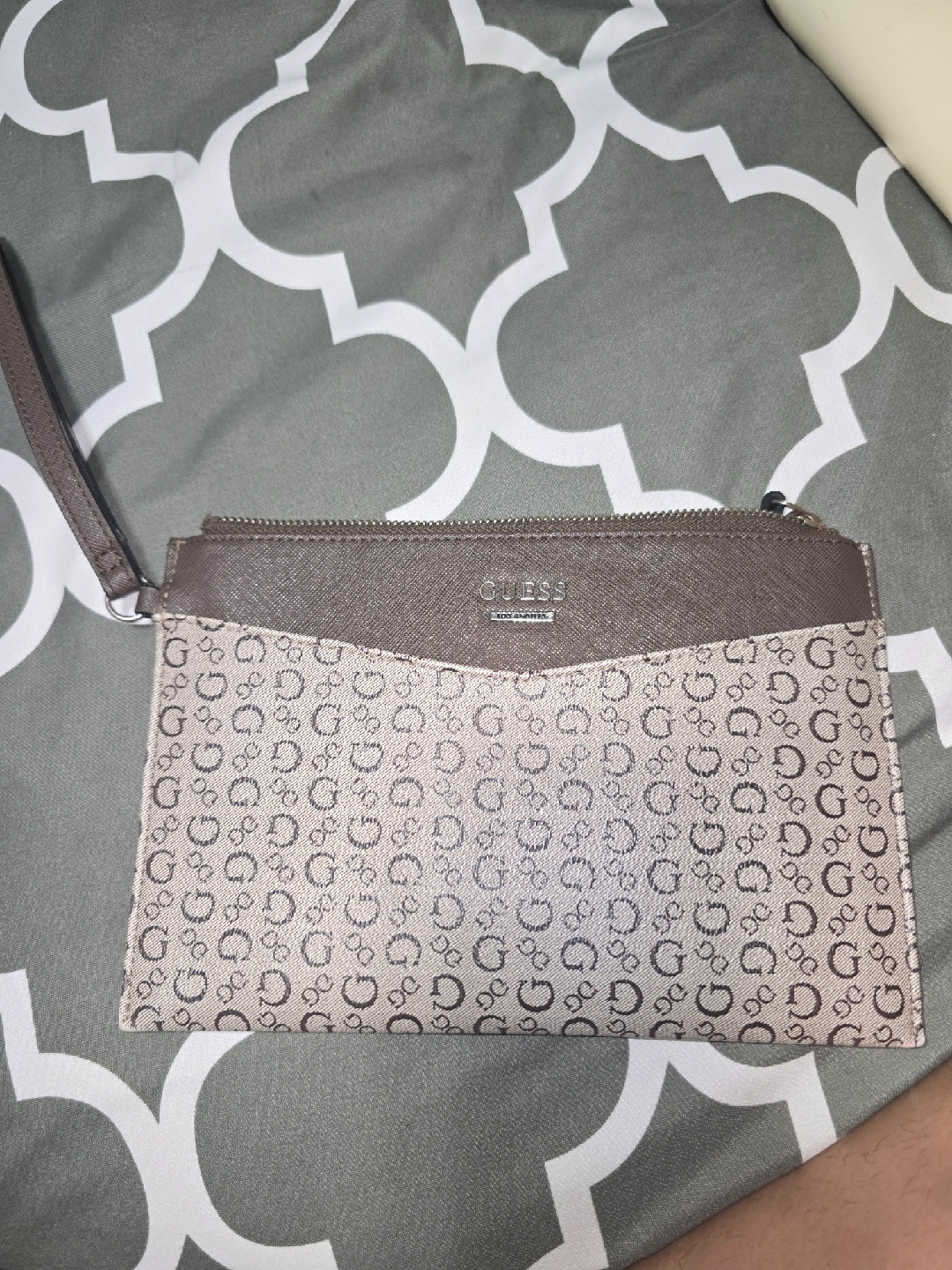 Selling a cute Guess wristlet featuring the classic 'G' monogram pattern! It's in great condition and perfect for carrying your essentials. The wristlet is brown and has a zip closure. Inside, there are several compartments to keep your belongings organized