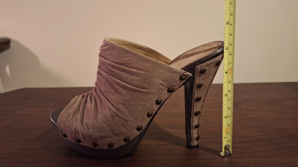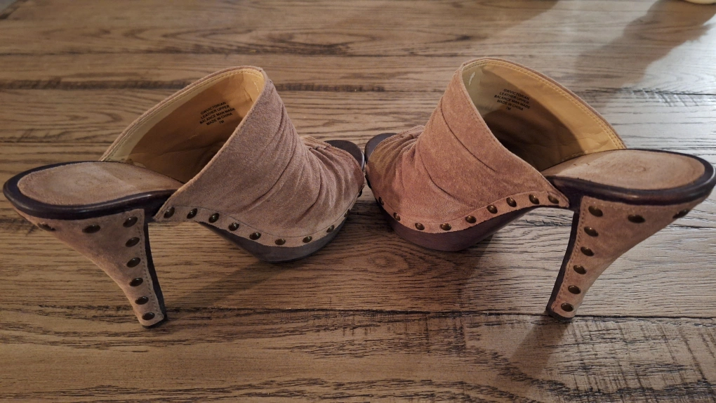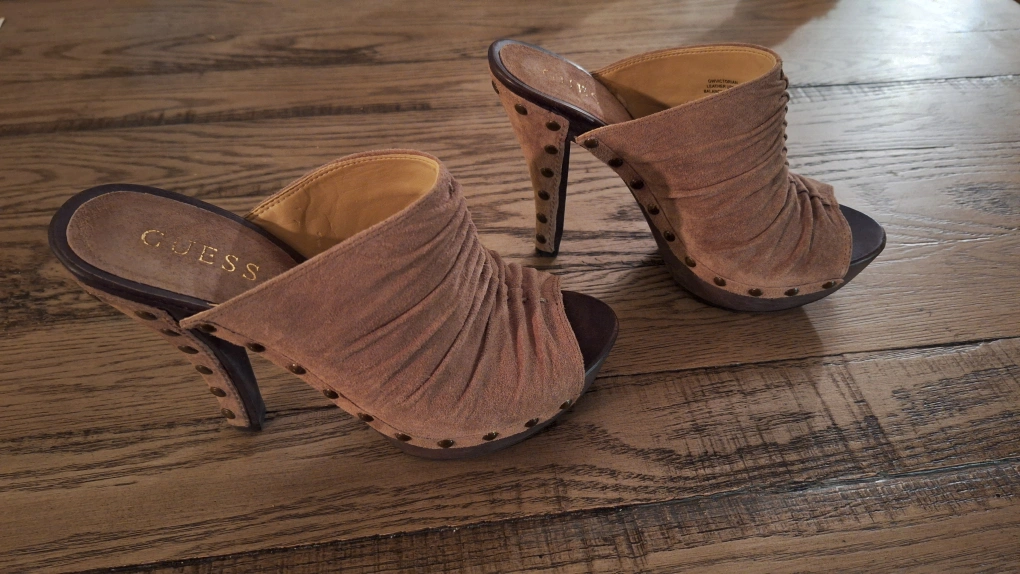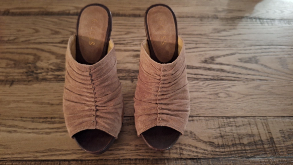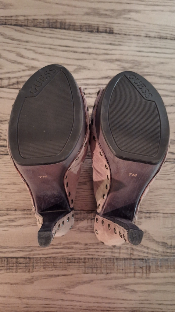 60Women's Guess brand brown suede heeled mules. Size 7M. Peep toe, studded heels. Platform sole. Excellent condition.