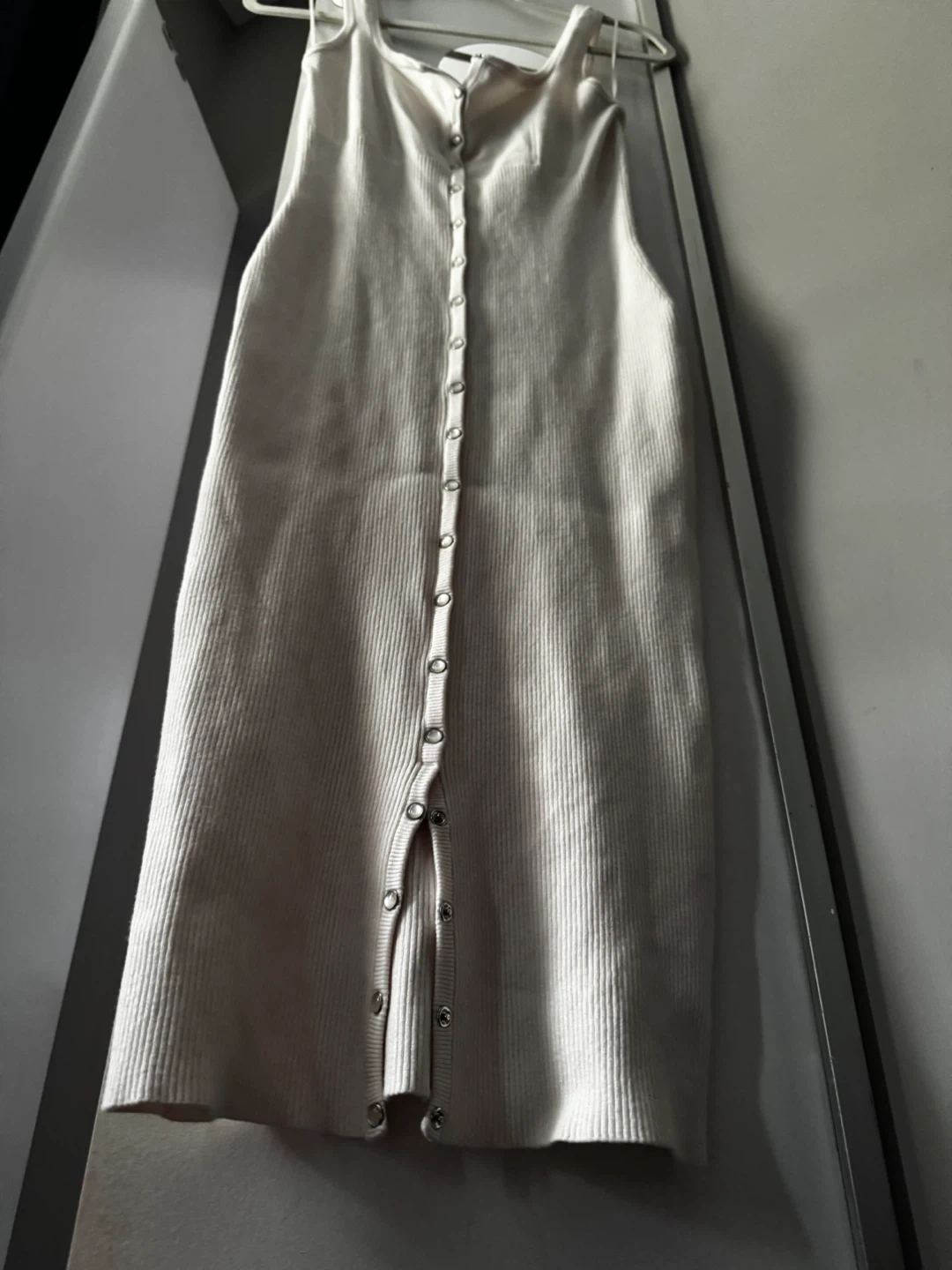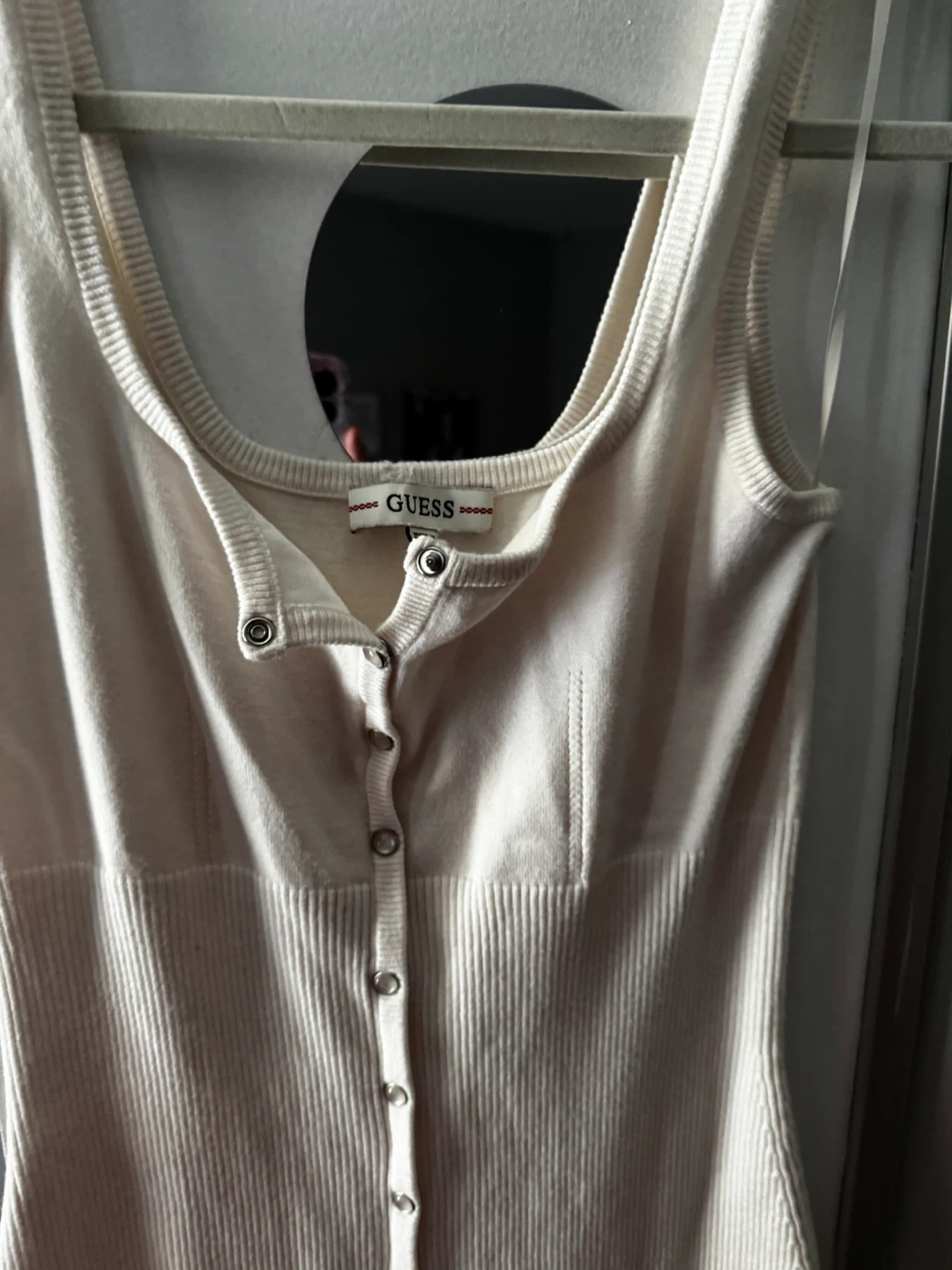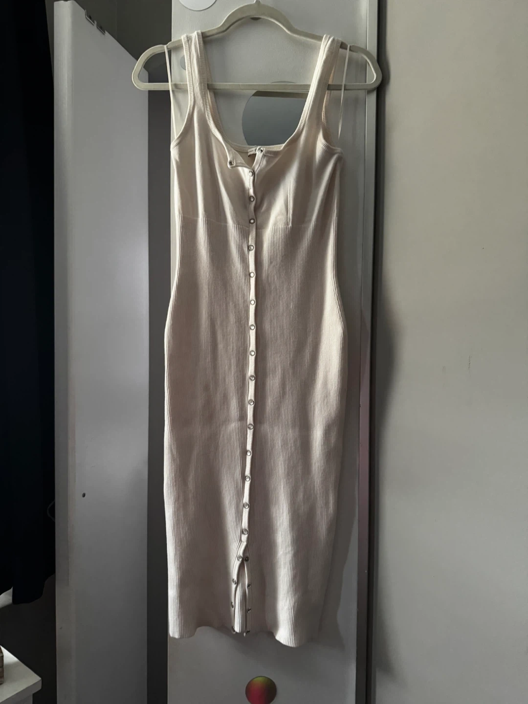 65Selling a cute cream-colored ribbed dress from Guess! It features a button-down front and a flattering fit. Perfect for a casual day out or dressed up for an evening occasion. The material is soft and comfortable, making it a great addition to your wardrobe!