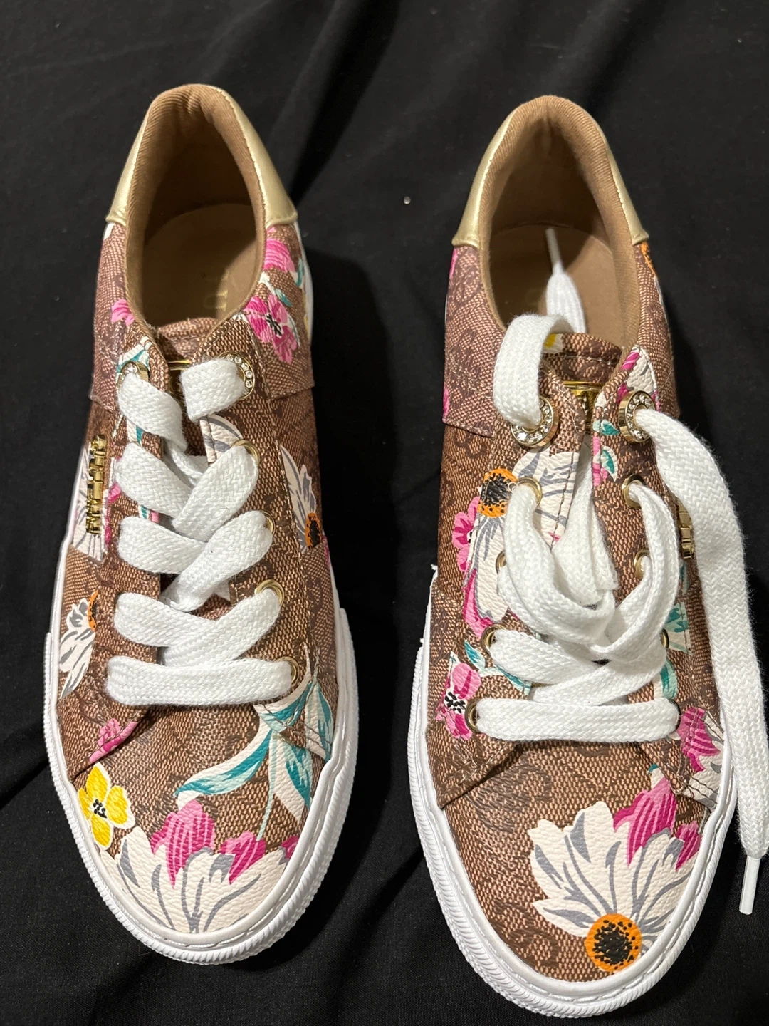 These Guess sneakers feature a beautiful floral print on a brown background. They have white laces and a gold accent on the heel. They look great and are ready for a new home!
