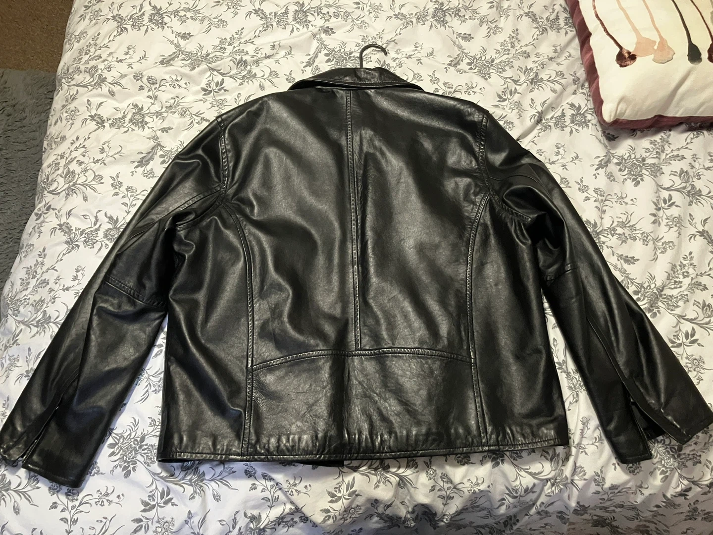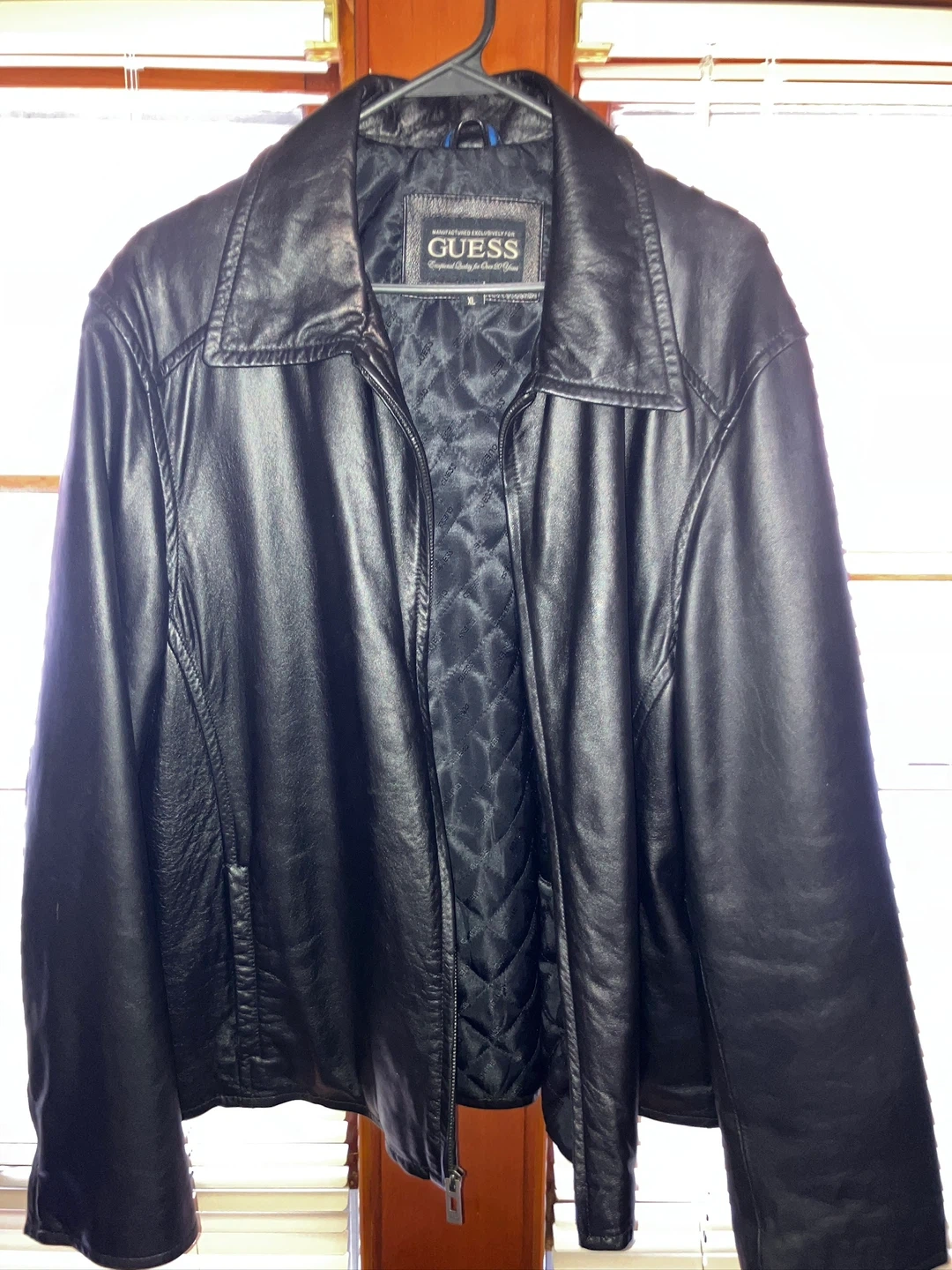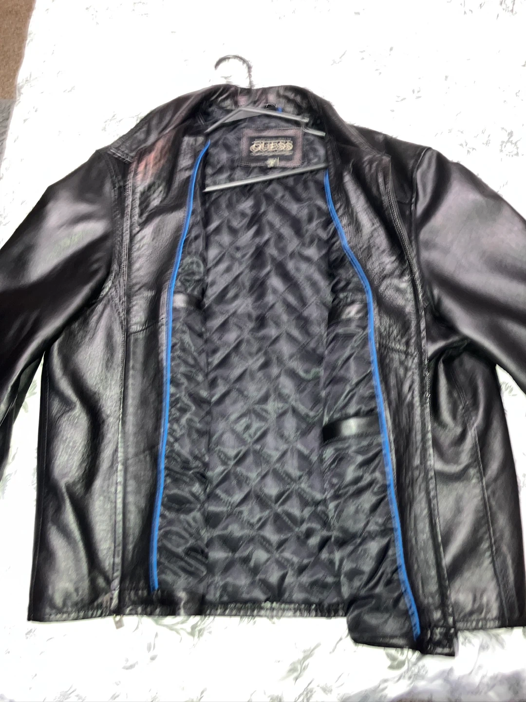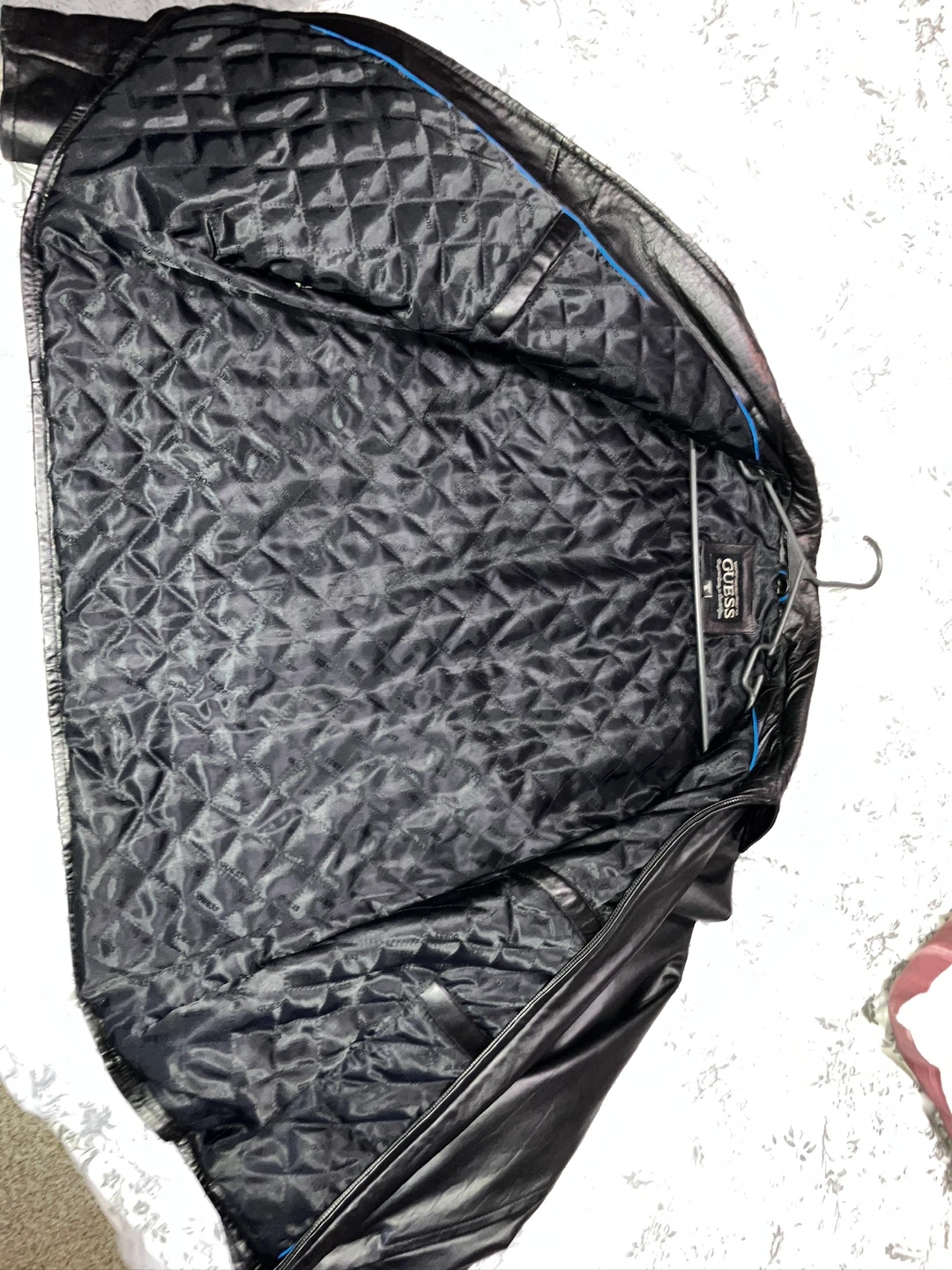 65Selling a black Guess genuine leather jacket in size XL. The lining is 100% polyester. It's in great condition and ready for a new home