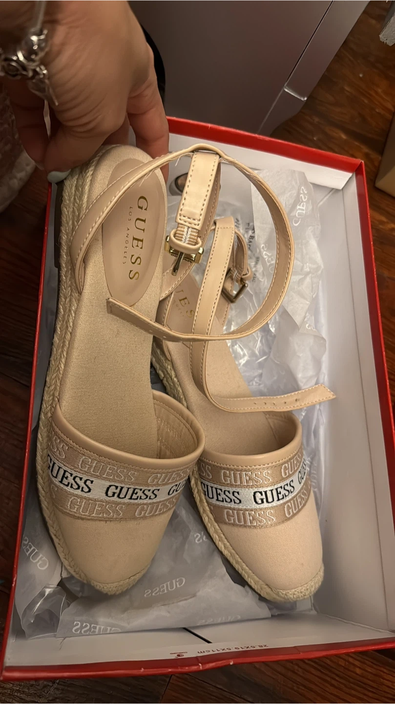 These Guess Los Angeles espadrille wedge sandals are in great condition and come with their original box! They feature the Guess logo around the toe and a cute ankle strap. Perfect for summer!