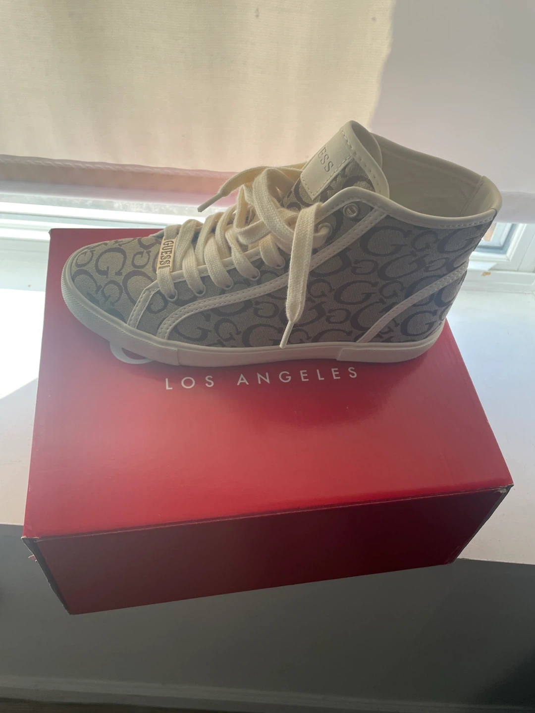 10These Guess high-top sneakers are in great condition and come with the original box! They feature the Guess logo pattern and a classic lace-up d esign. Perfect for adding a touch of style to any outfit