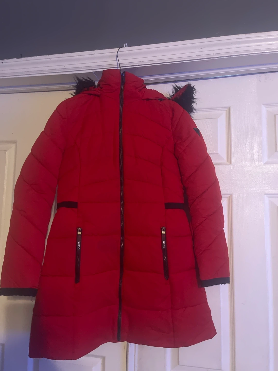 Here's a stylish red puffer coat from Guess! It's a vibrant color and perfect for staying warm. The coat features a faux fur-trimmed hood and a sleek design. Great for the colder weather!