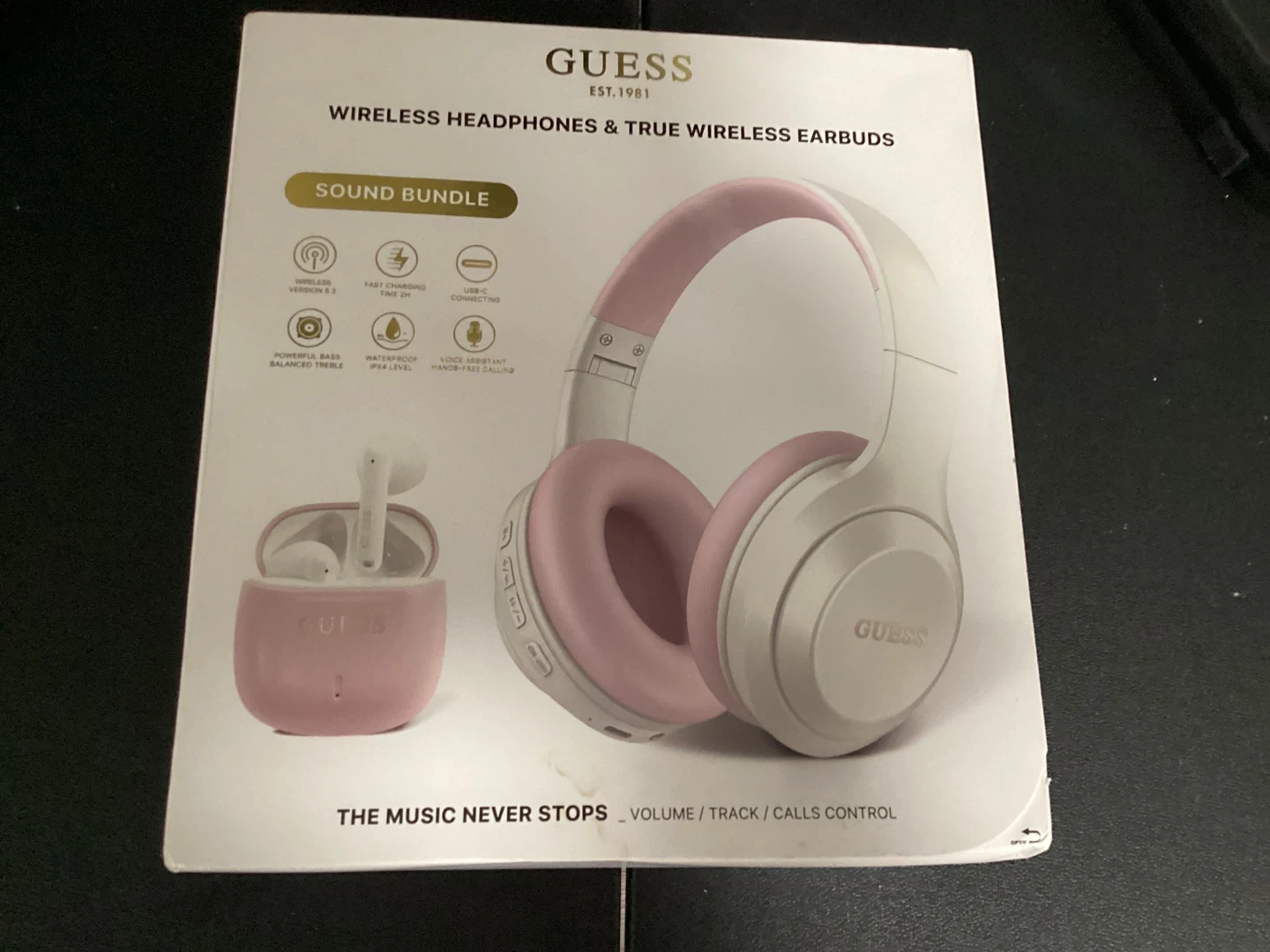 Selling a brand new GUESS wireless headphones and true wireless earbuds set! This sound bundle includes both headphones and earbuds. Key features include: - Wireless version 5.3 - Fast charging (2 hours) - USB-C connecting - Powerful bass balanced treble - Waterproof IPX4 level - Voice assistant hands-free calling The music never stops with volume/track/calls control! The set is pink and white and comes in the original box