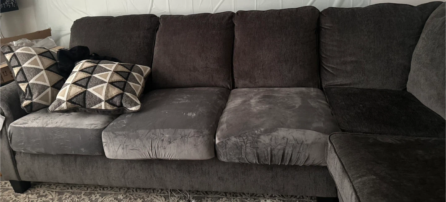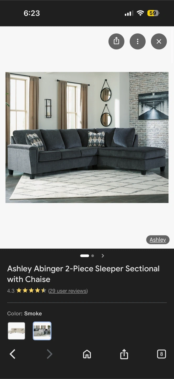 This is an Ashley Abinger 2-piece sleeper sectional in the smoke color. It's a comfortable and spacious sofa that can also convert into a sleeper. Includes chaise.