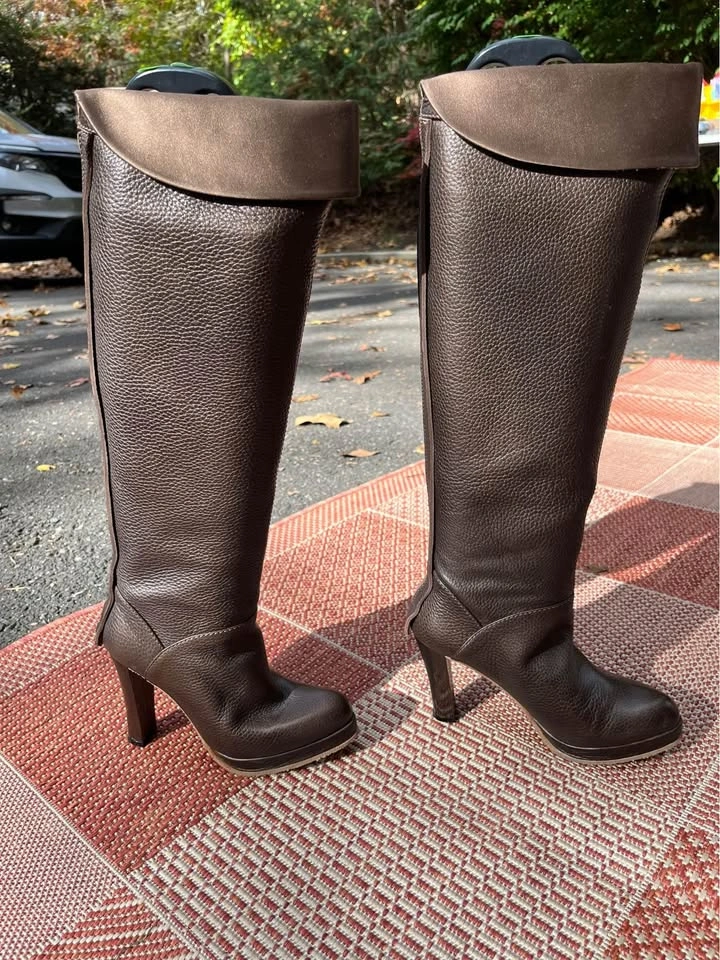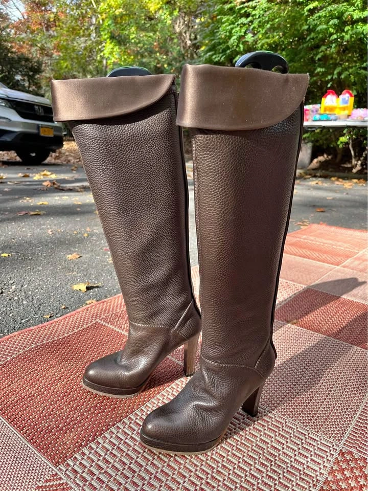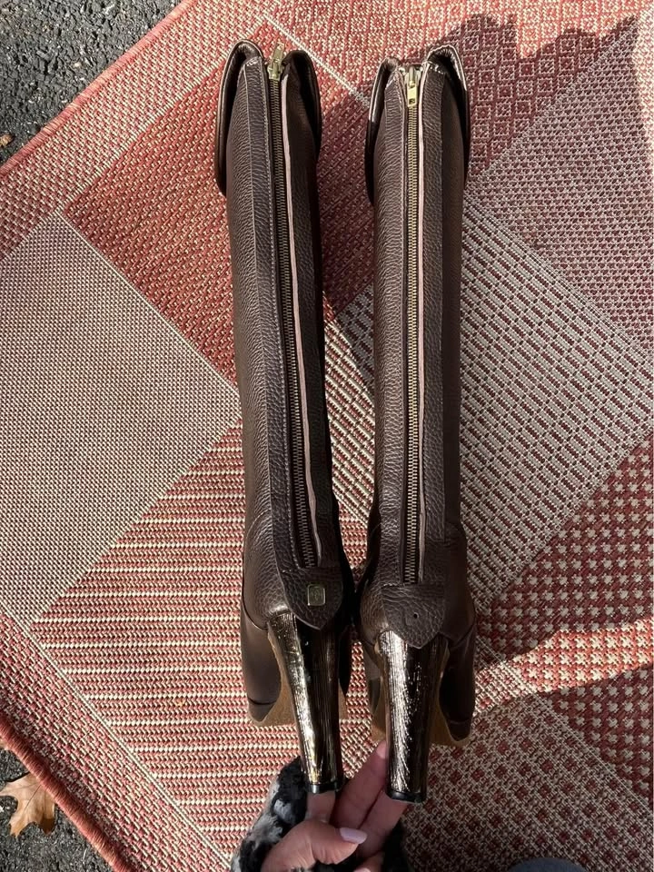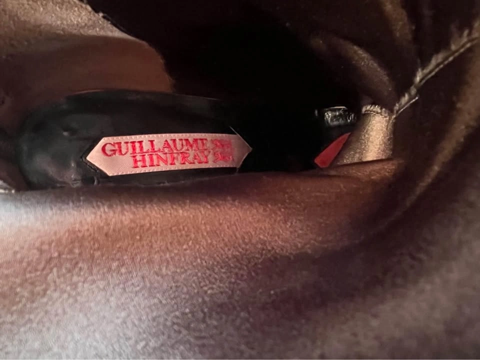 Pair of Guilaume Hinfray metallic dark bronze leather, with satin lined cuffs at top. Rubber soles. Size 38. Excellent condition. Missing metal logo on heel of right boot.