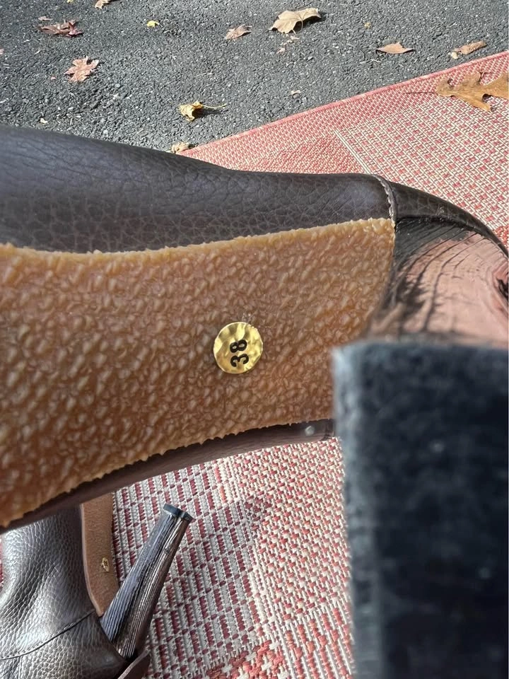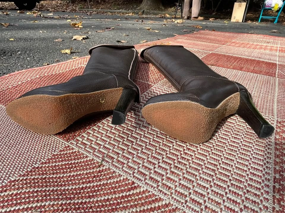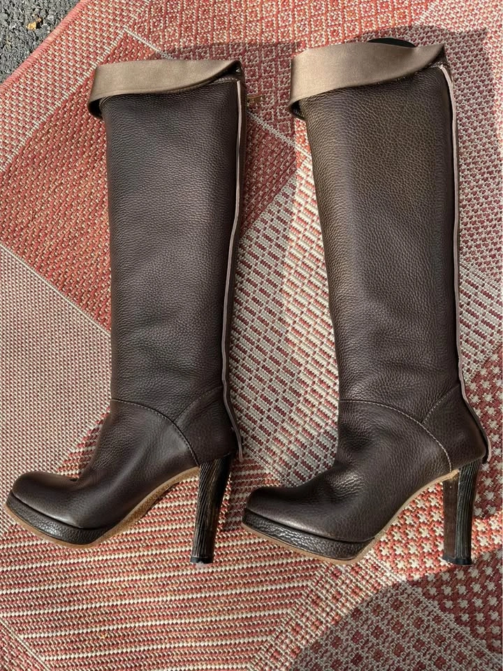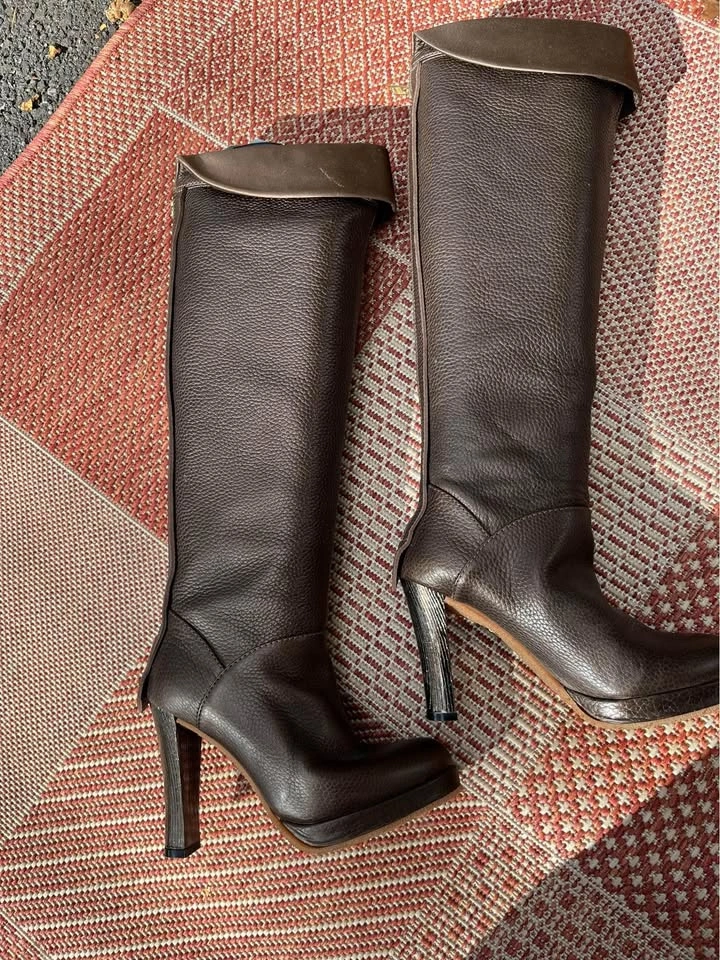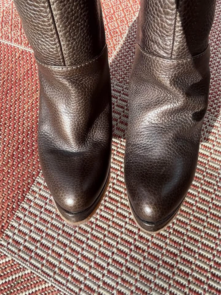 Pair of Guilaume Hinfray metallic dark bronze leather, with satin lined cuffs at top. Rubber soles. Size 38. Excellent condition. Missing metal logo on heel of right boot.