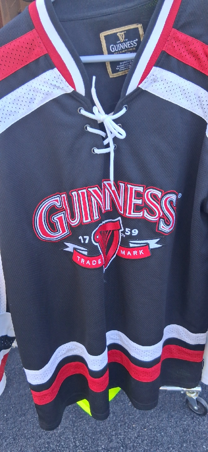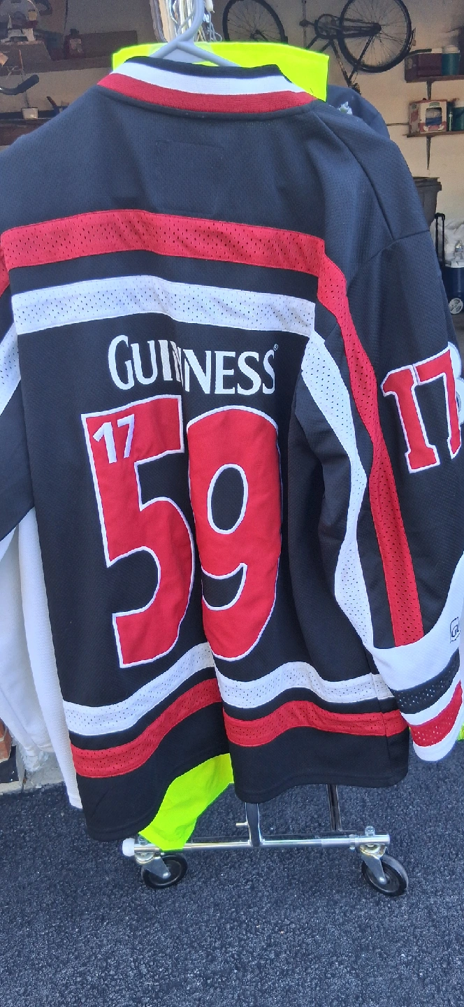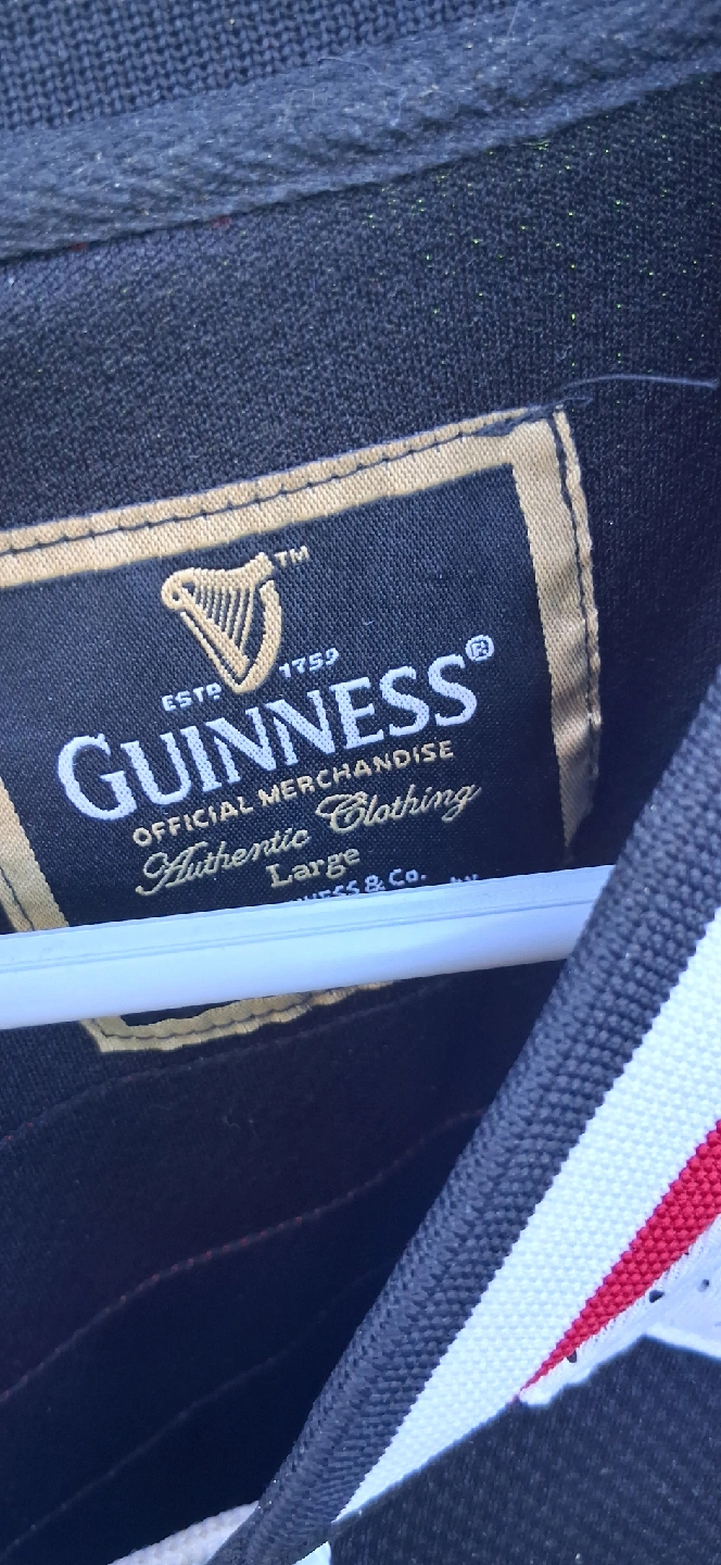 65Selling a Guinness official merchandise authentic clothing item in size large. It's a black jersey with red and white accents, featuring the iconic Guinness logo and the number 59 on the back. Perfect for any Guinness fan!