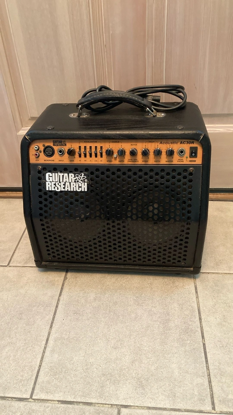 Guitar Research AC30R 2x6 30w Acoustic Combo Amp This acoustic guitar amp is a reliable and versatile acoustic guitar amp/PA. It sports an input gain control, a powerful 5-band graphic EQ with a 60Hz – 1kHz parametric notch filter, lush analog-sounding chorus and delay, and a master volume control. On the left are twin RCA jacks for an MP3 player, an XLR jack for a microphone, and the standard 1/4″ guitar input jack. On the right is a headphone jack for silent practice. The rear panel adds even more flexibility with a jack to a footswitch, a line out, a DI out, and an effects loop. 30W 2x6" Speakers Guitar and Mic Inputs 5-Band Graphic EQ Chorus and Delay FX FX Loop Line Out/XLR Out Aux RCA Input 1/4" Headphone output 15″ x 13″ x 9″ 20 Lbs Brand: Guitar Research