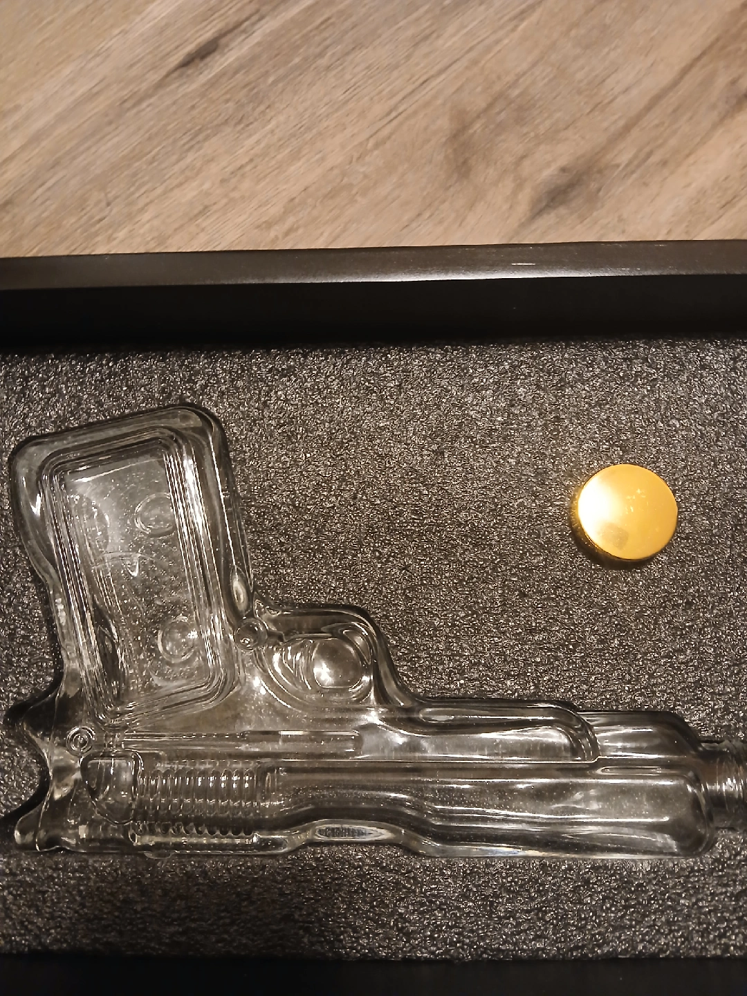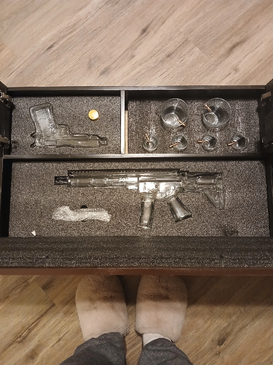 60I'm selling a gun-shaped decanter set! It looks like it includes a pistol decanter, an assault rifle decanter, and six shot glasses designed with bullet accents. Perfect for a unique bar setup!