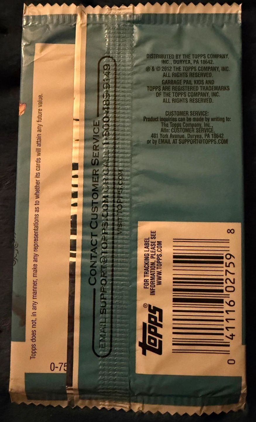 Never opened! Released in 2012, this was the first full set of new Garbage Pail Kids in five years. The series features 110 all-new hand-painted characters. Each factory-sealed pack contains 4 sticker cards. The original series is known for its clever puns and witty parodies of childhood fears.