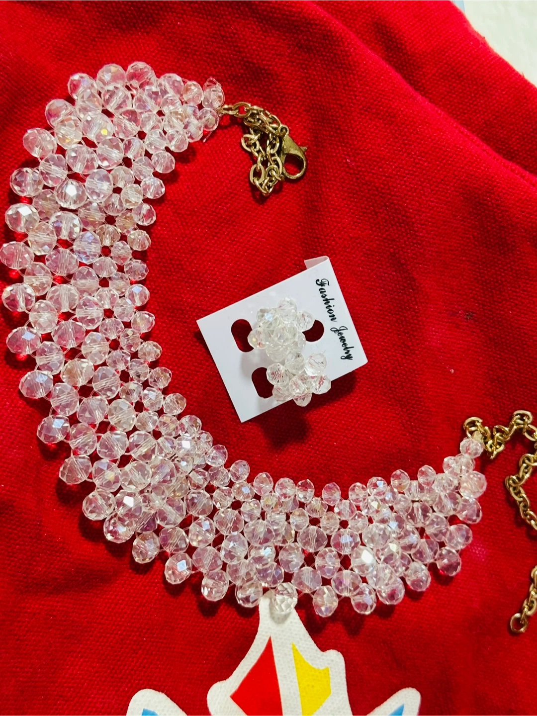 This fashion jewelry set includes a clear crystal beaded choker necklace and matching flower-shaped stud earrings. The necklace has a gold-tone chain extender for adjustable sizing. It's a beautiful accessory for adding sparkle to any outfit!