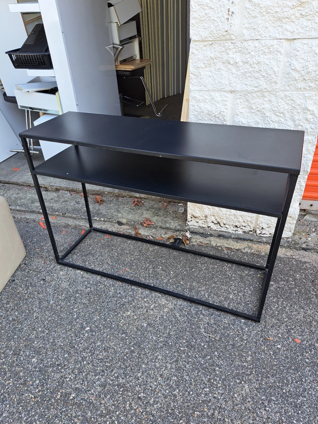 Sleek black console table featuring two spacious shelves. Its metal frame provides a sturdy and modern design. This piece is great for entryways or living spaces that need a touch of minimalist style!