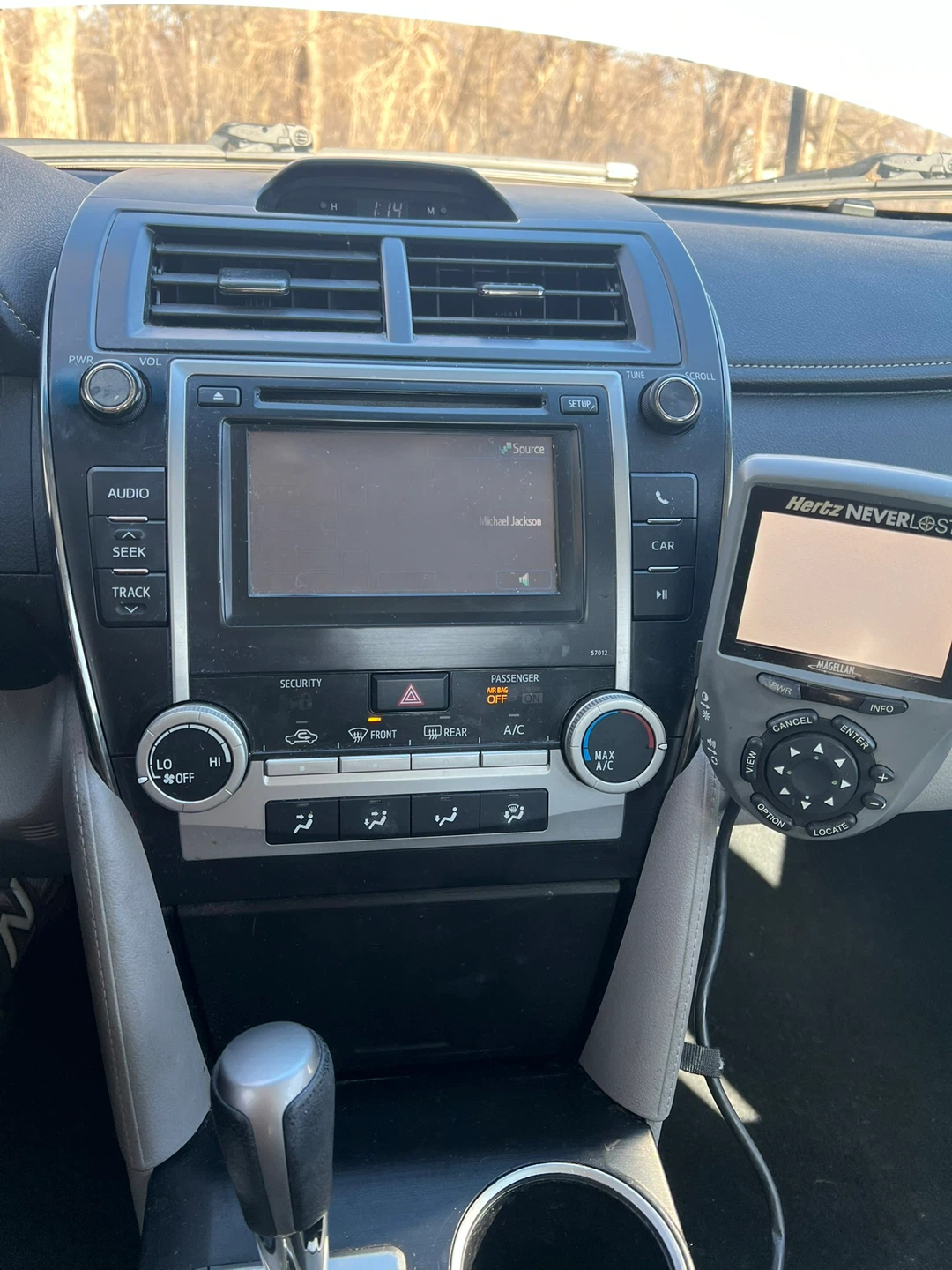 This is a 2014 Toyota Camry in silver. It's a sedan with a comfortable interior. It includes a Hertz NeverLost GPS device.