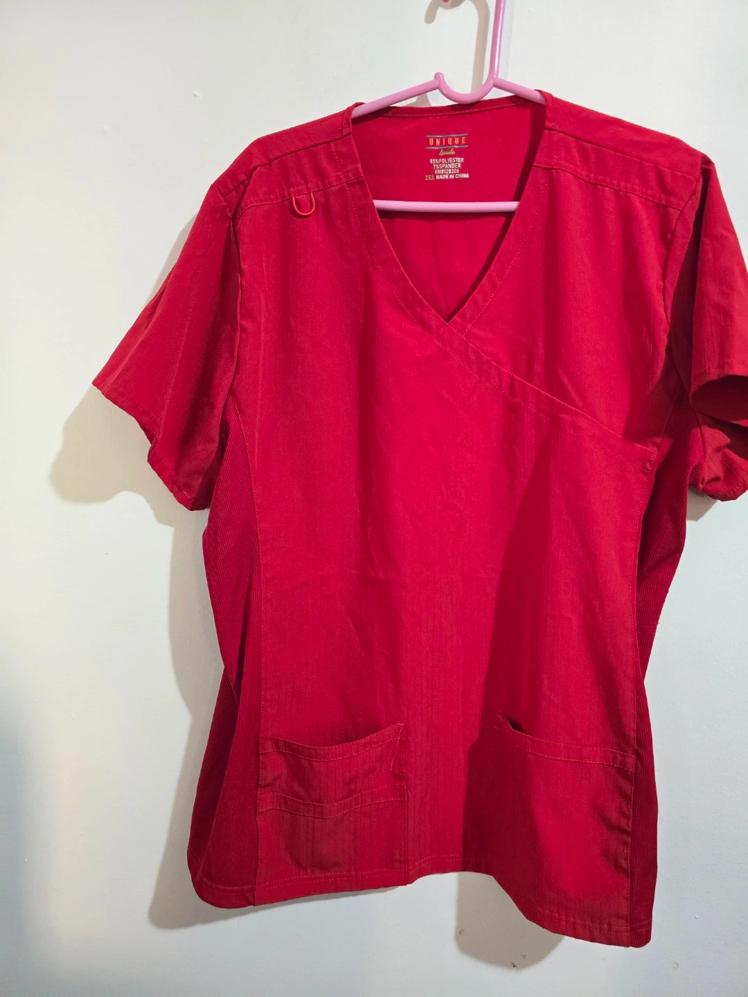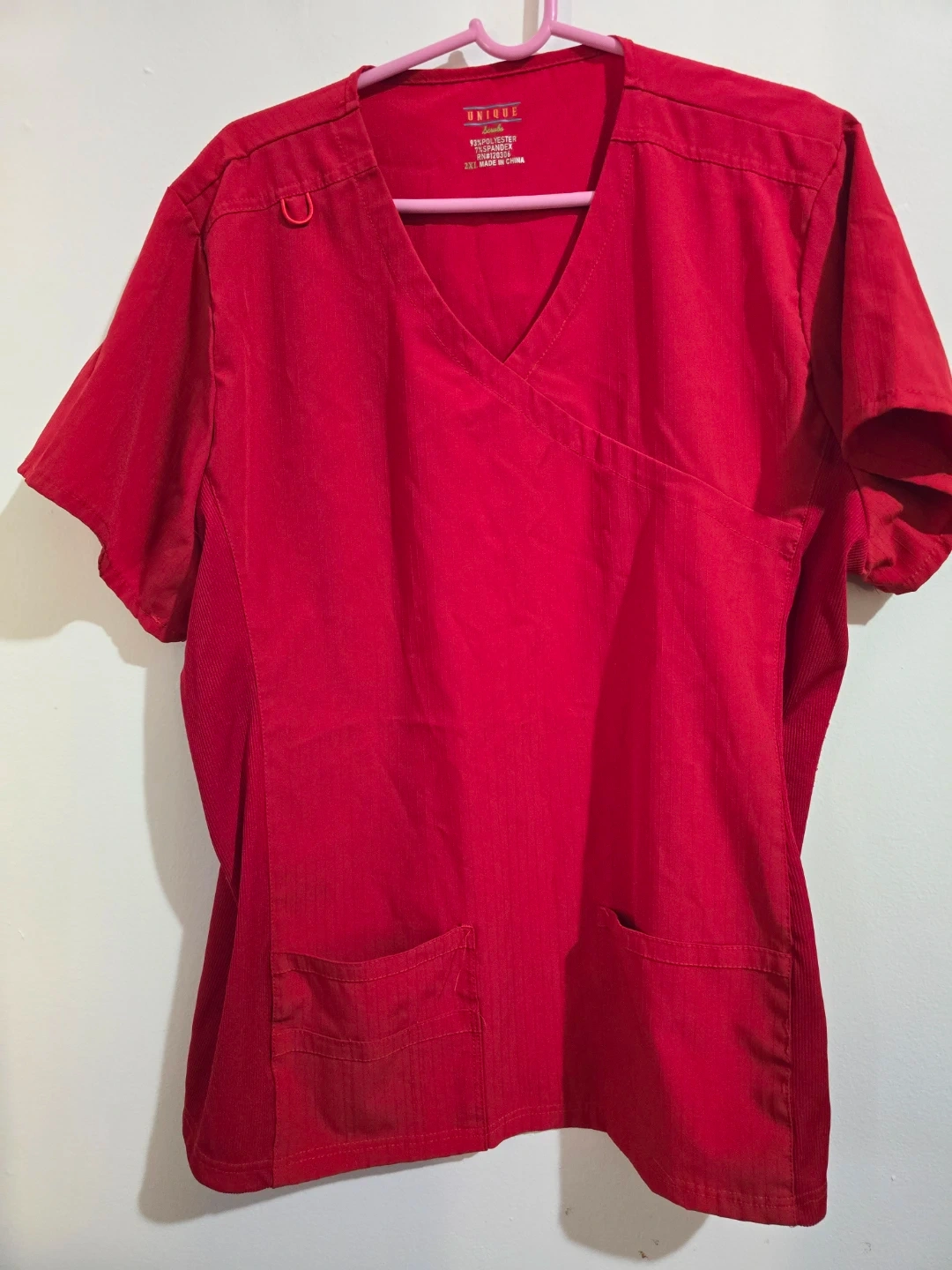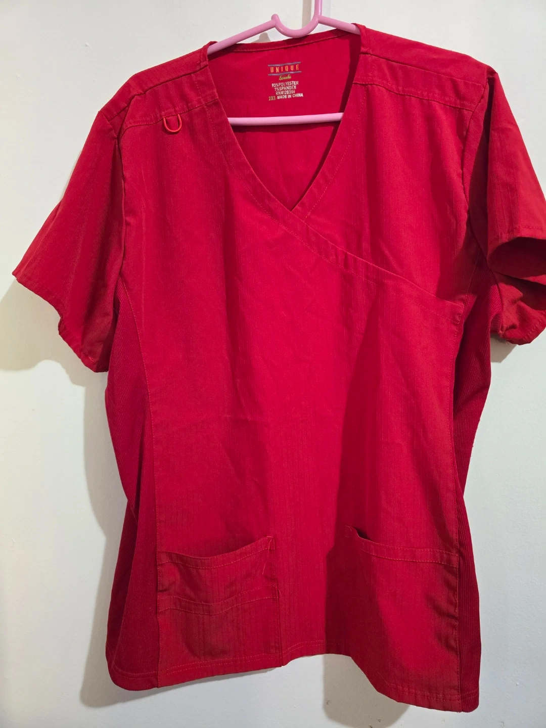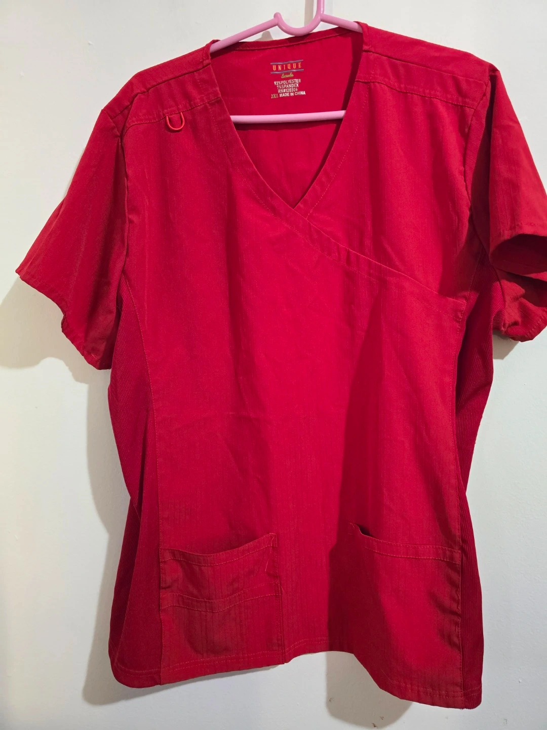 This is a red V-neck wrap scrub top from Unique Scrubs. It's made of 93% polyester and 7% spandex. Features two front pockets and a D-ring detail. Great for medical professionals! Size 2XL