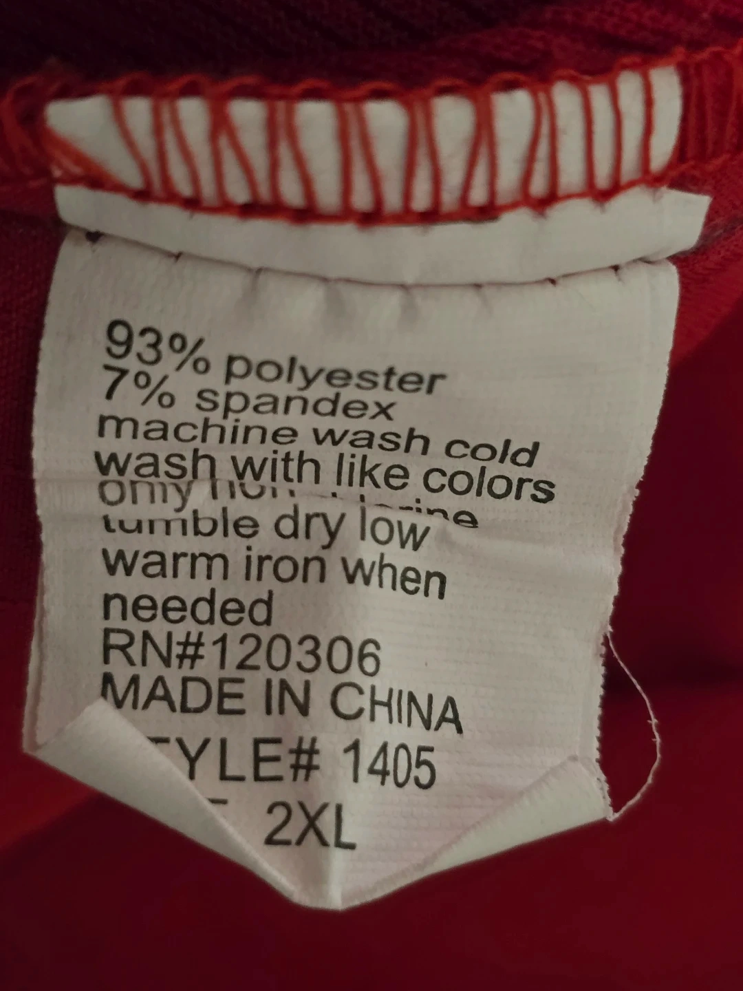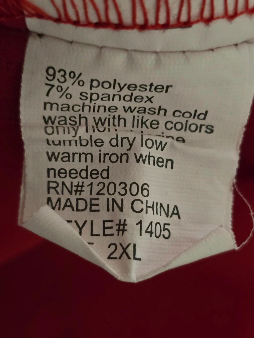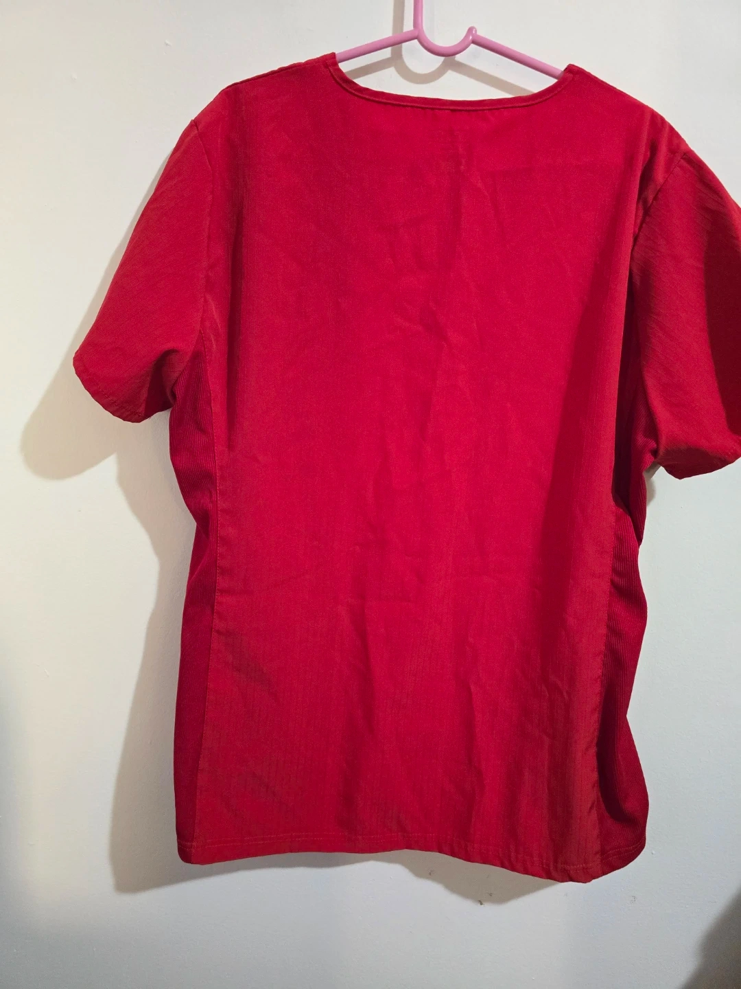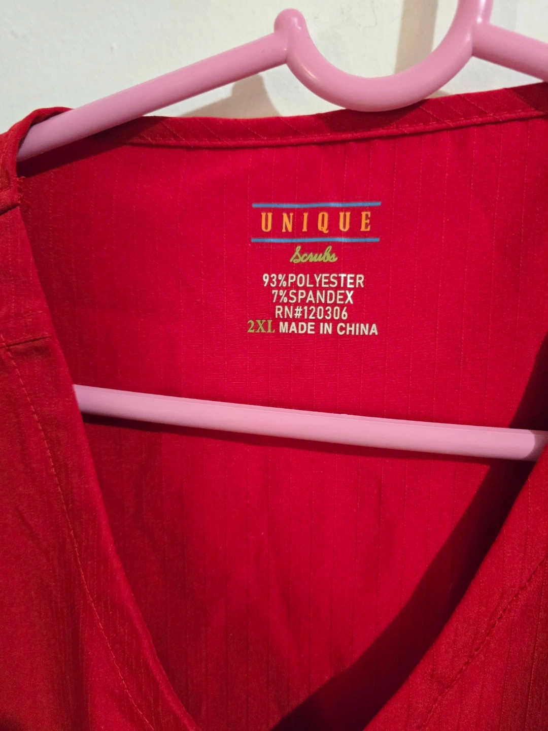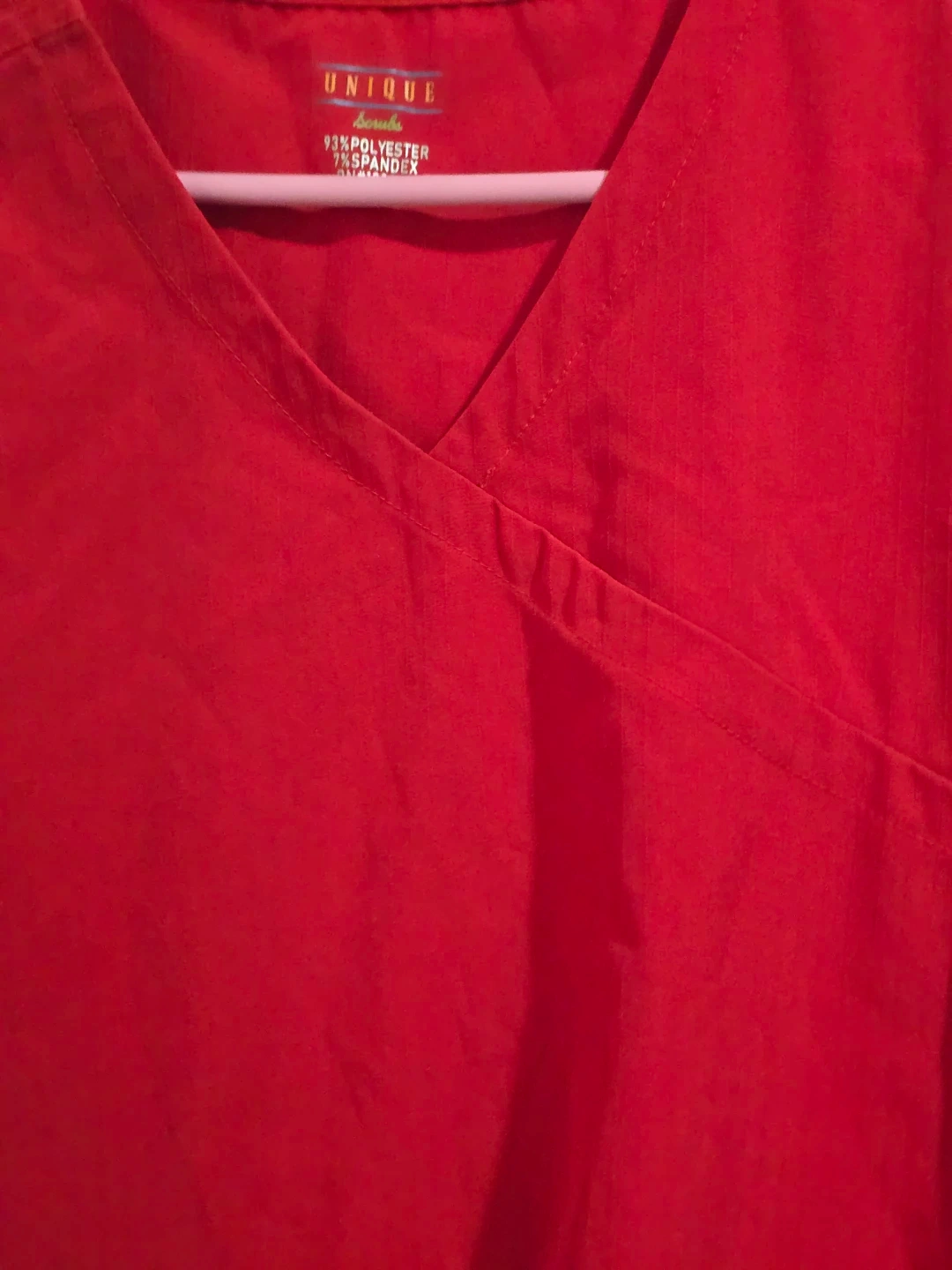 This is a red V-neck wrap scrub top from Unique Scrubs. It's made of 93% polyester and 7% spandex. Features two front pockets and a D-ring detail. Great for medical professionals! Size 2XL