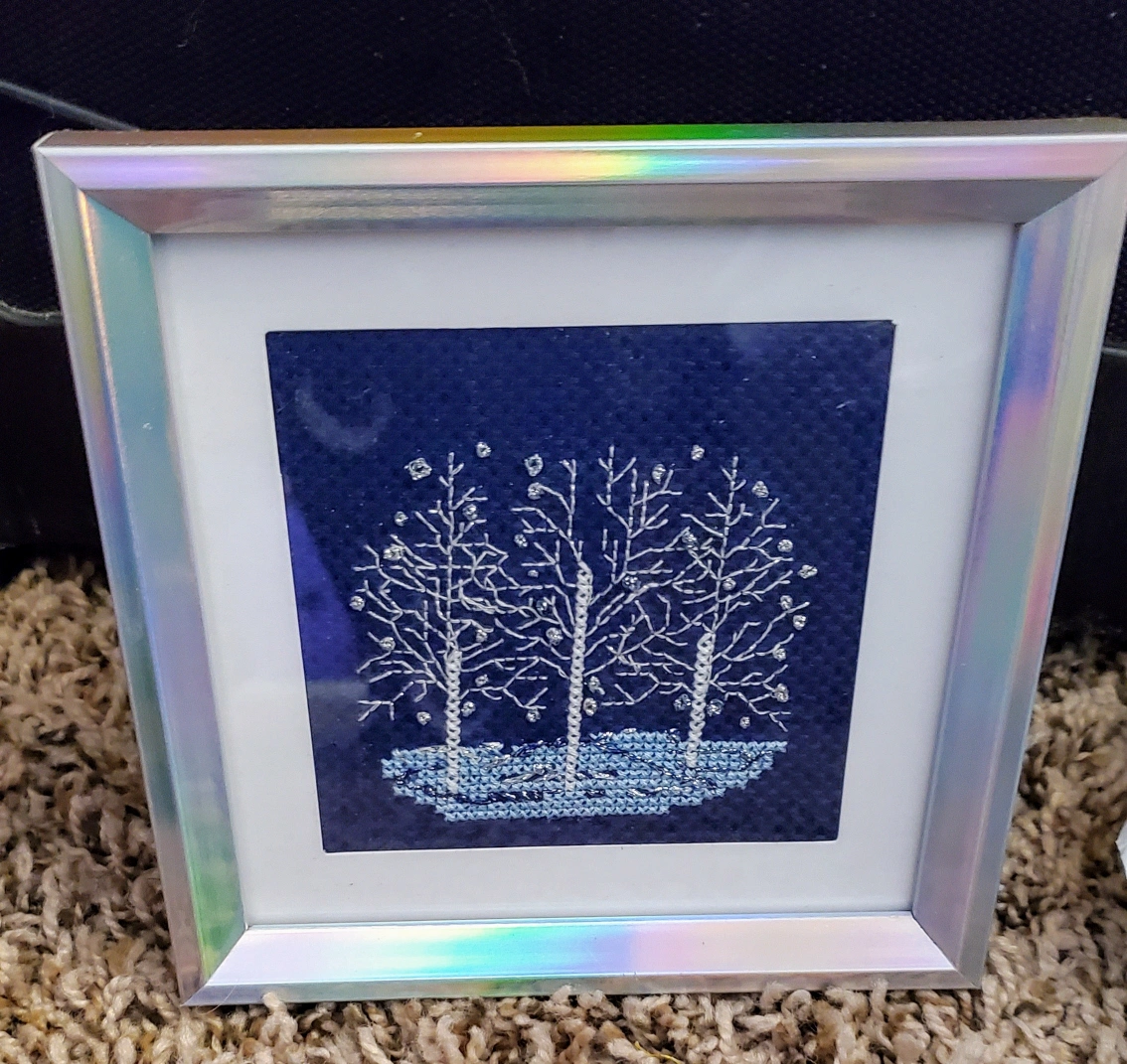 This is a framed cross stitch art piece featuring winter trees on a dark blue background. The frame has a cool iridescent finish! It's a cute piece of handmade art to brighten up your space. custom Stitched and framed.