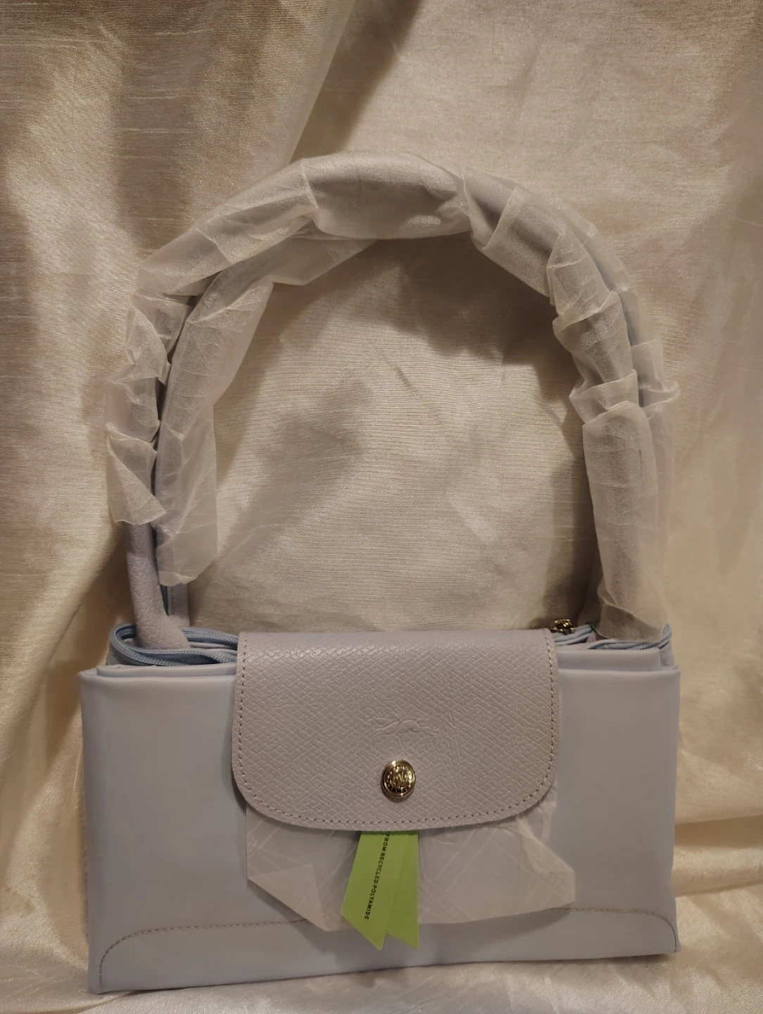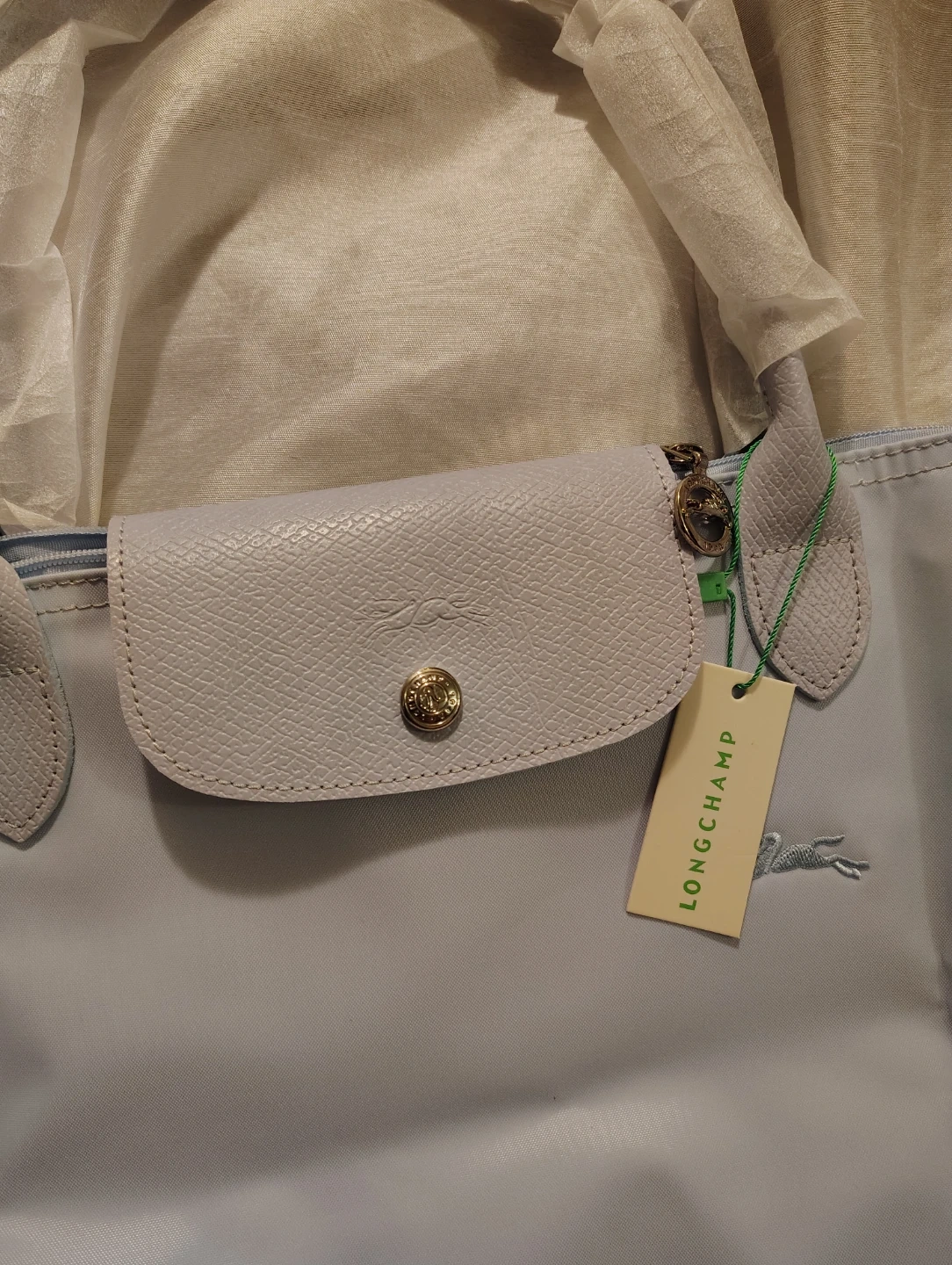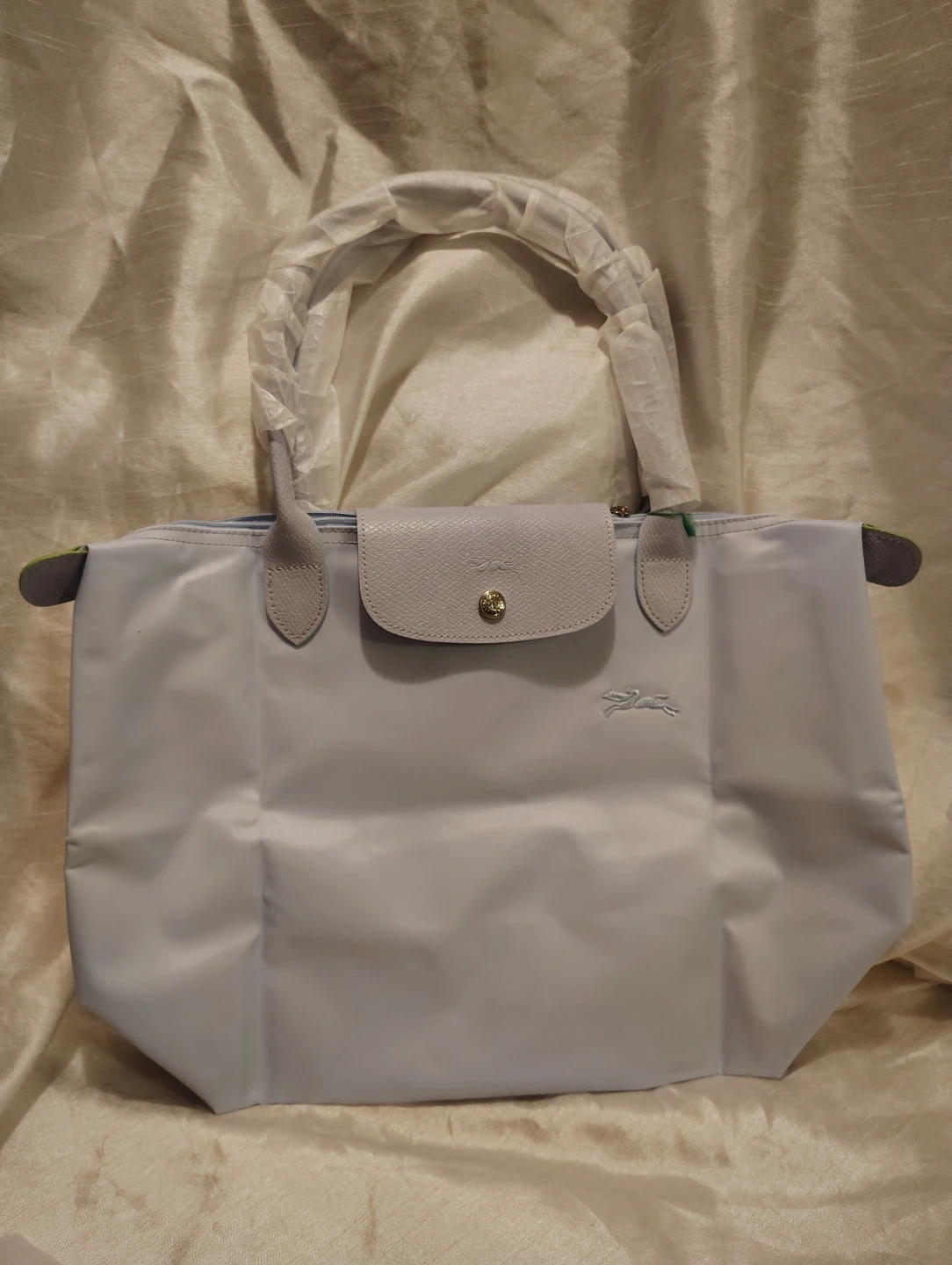 This is a new Longchamp Le Pliage shoulder bag in a light blue color. It features leather trim and handles. The bag is packaged and protected with original wrapping. It's a versatile accessory for everyday use!