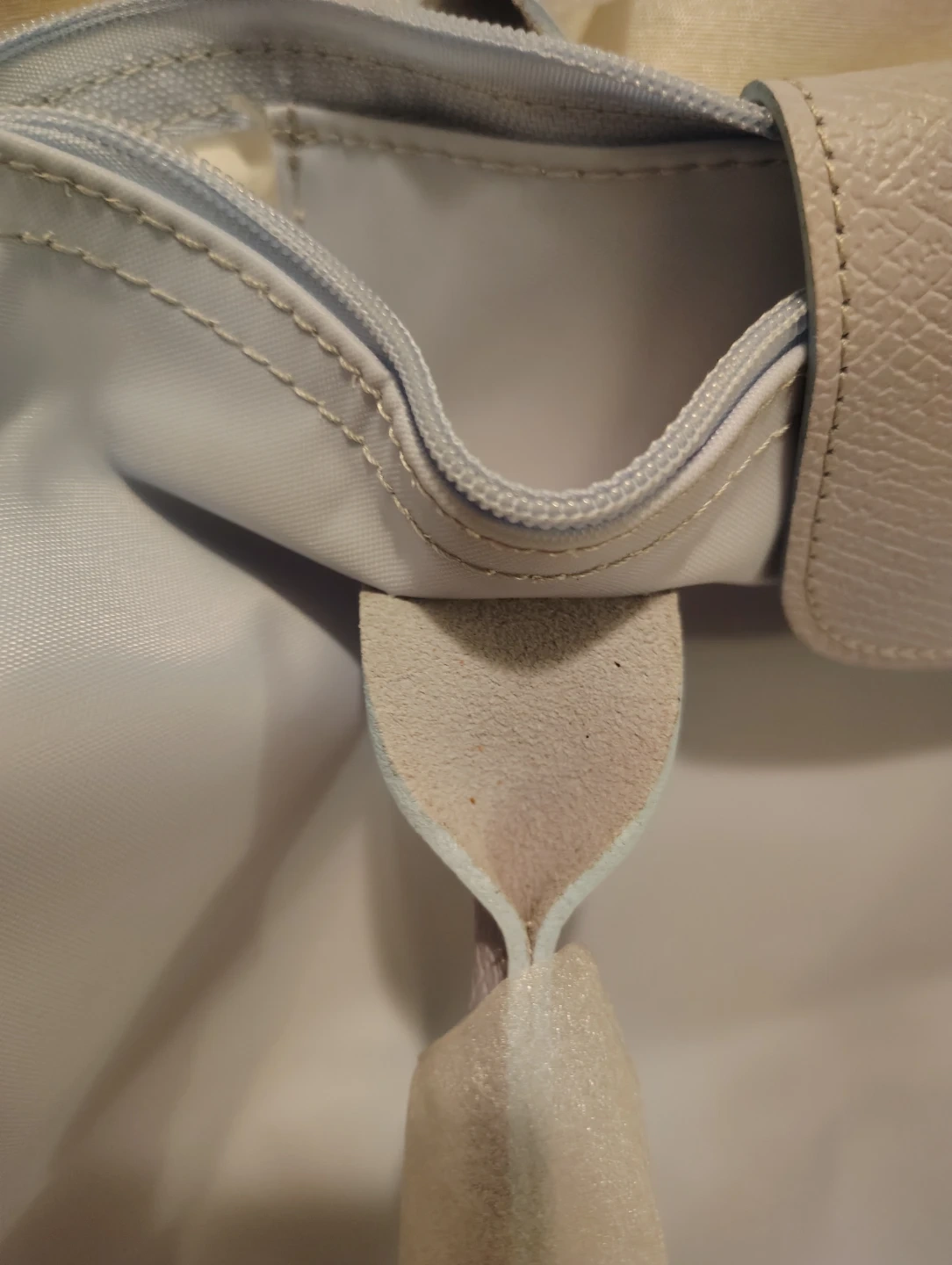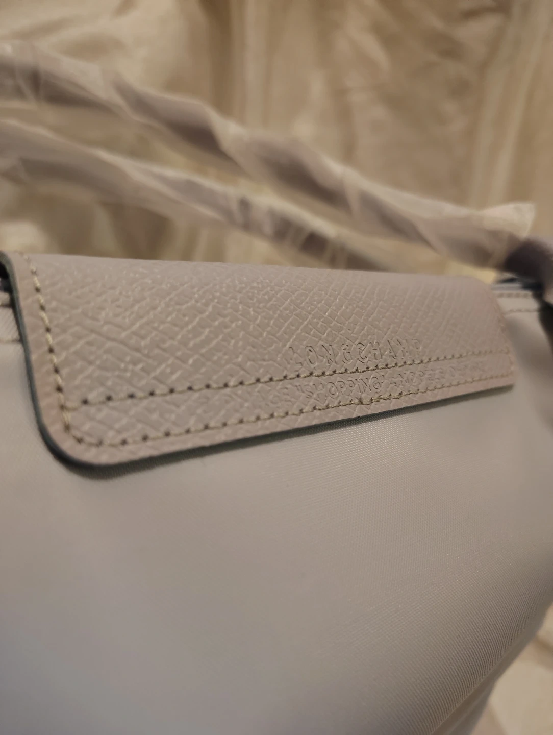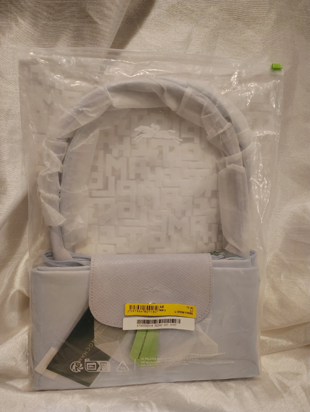 This is a new Longchamp Le Pliage shoulder bag in a light blue color. It features leather trim and handles. The bag is packaged and protected with original wrapping. It's a versatile accessory for everyday use!