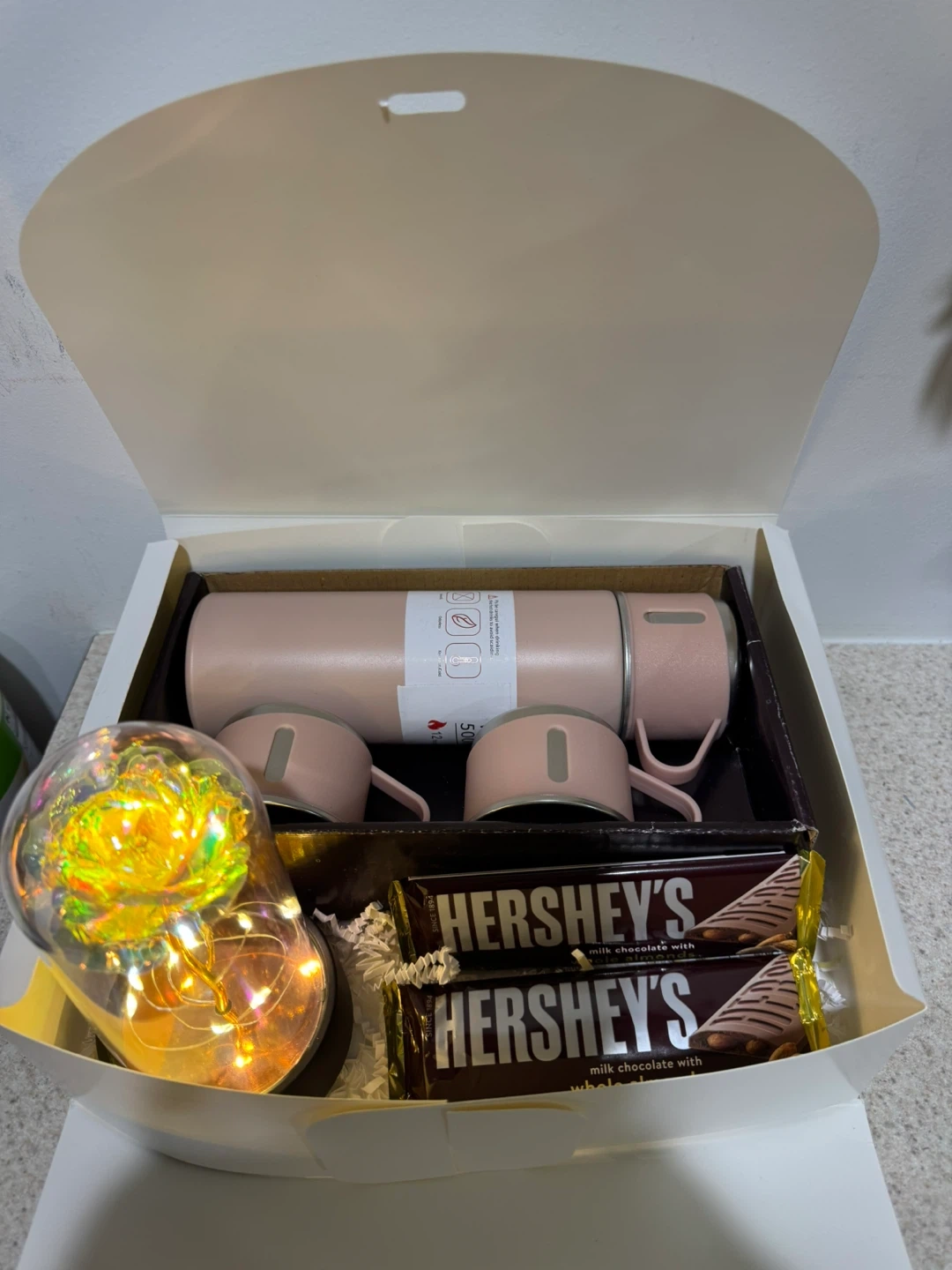 This gift set includes a pink tumbler, two matching mugs, a decorative rose lamp with lights, and two Hershey's chocolate bars. It's packaged in a white gift box tied with a gold ribbon. Perfect for a special occasion or a thoughtful gift!