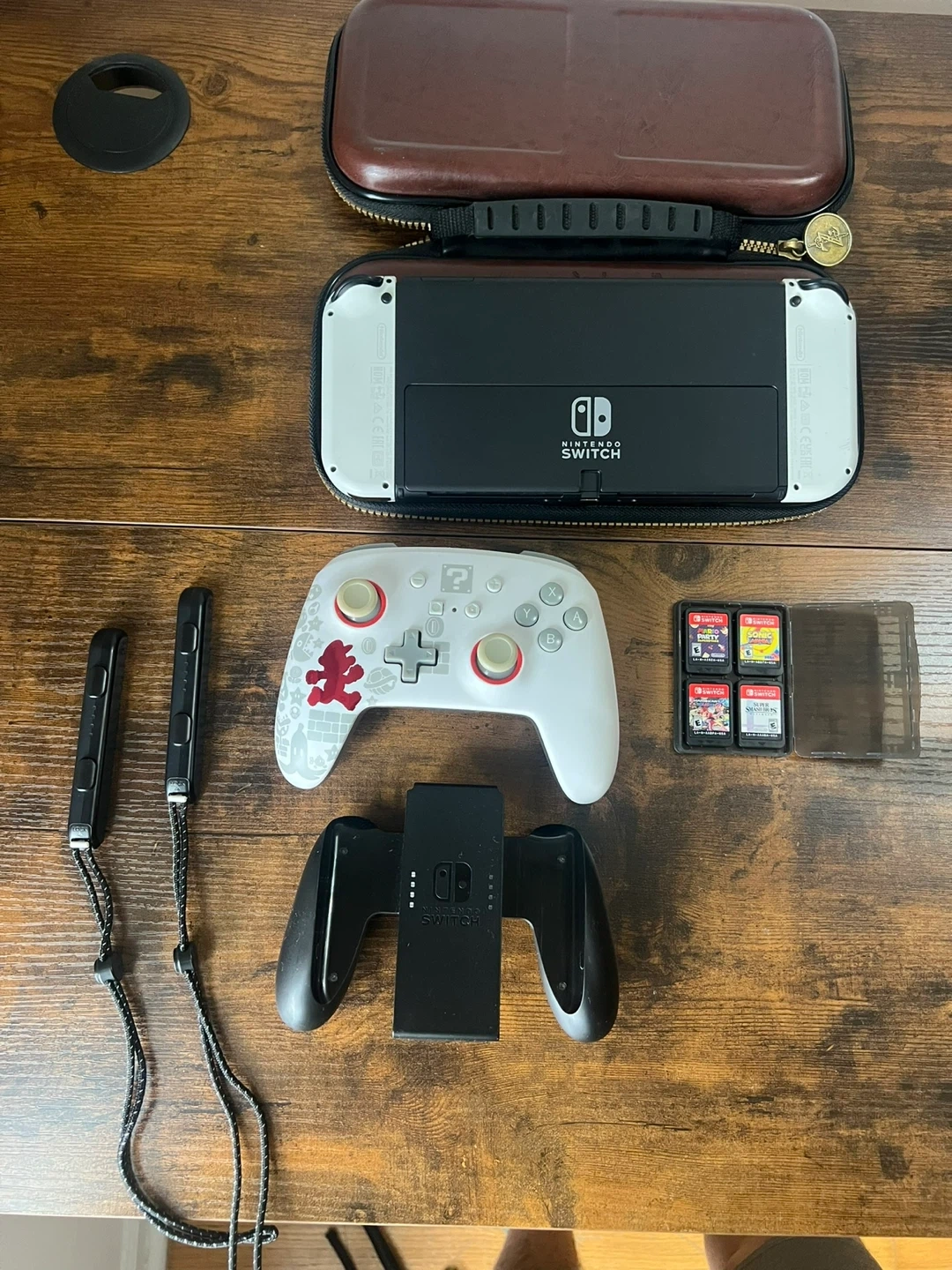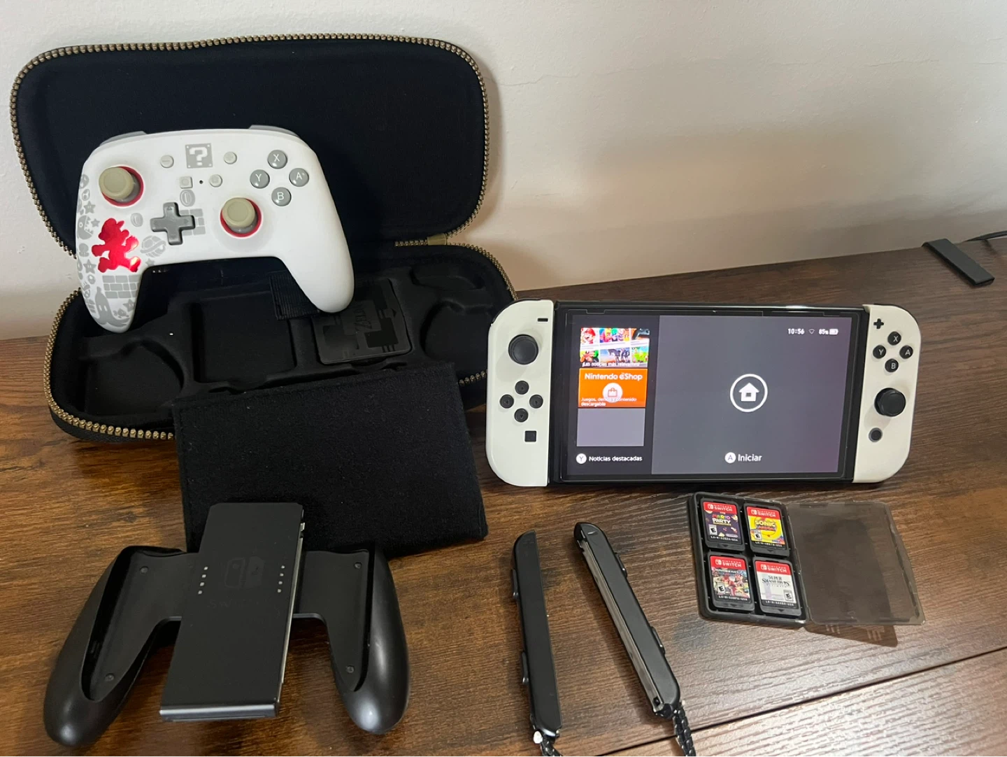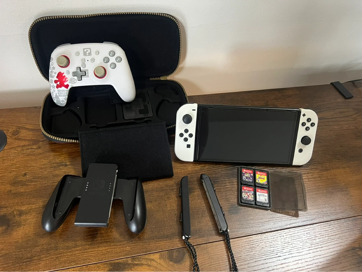 This is a Nintendo Switch OLED Model in white. It comes with the original dock, Joy-Cons, a Pro Controller, a travel case, and four games: Mario Party Superstars, Sonic Mania, Mario Kart 8 Deluxe, and Super Smash Bros. Ultimate. Includes all necessary cables and charging accessories.