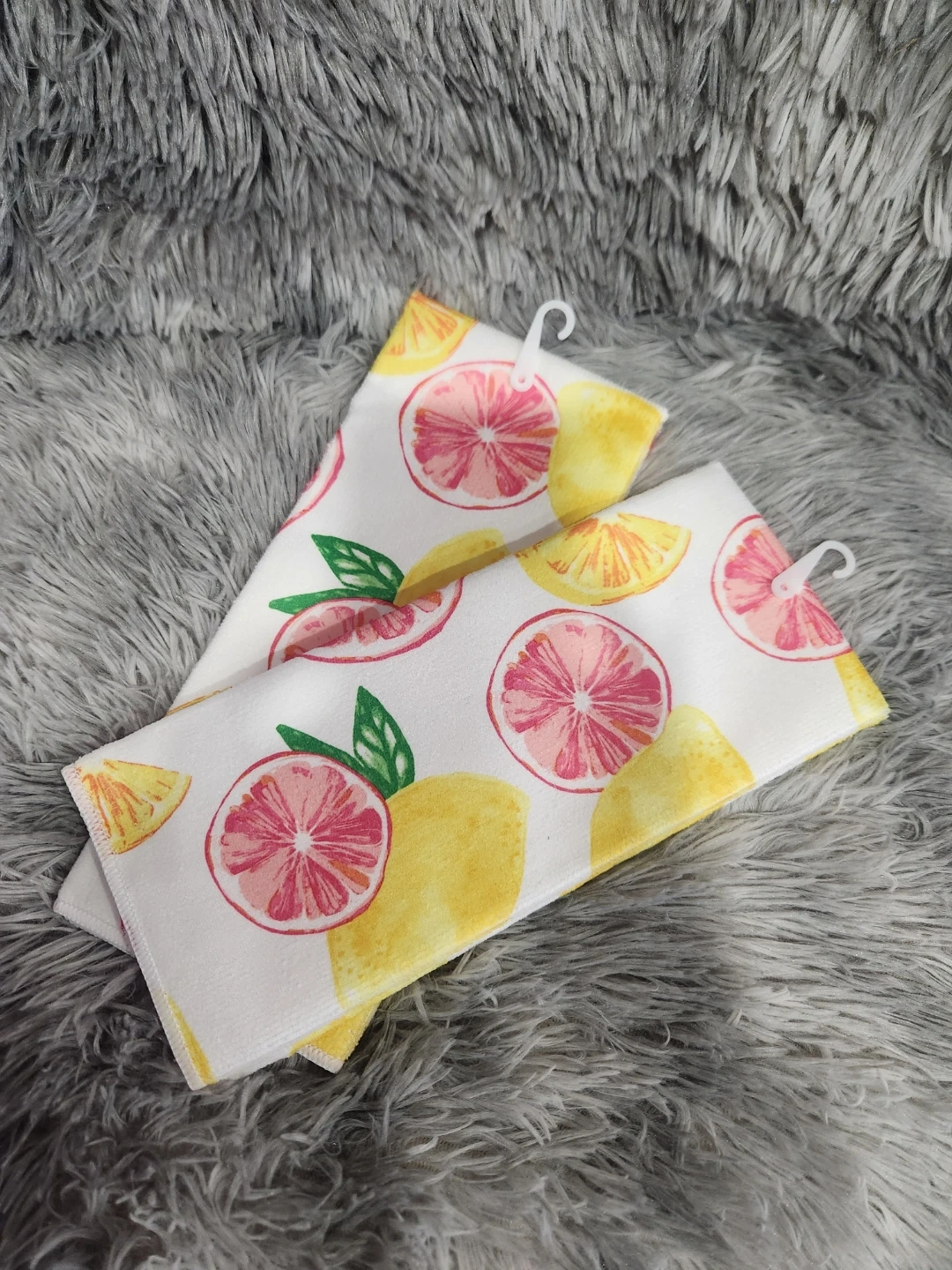 These kitchen towels feature a vibrant citrus print with lemons and grapefruits. They're made of absorbent material, perfect for everyday use in the kitchen. Each towel has a convenient loop for hanging.